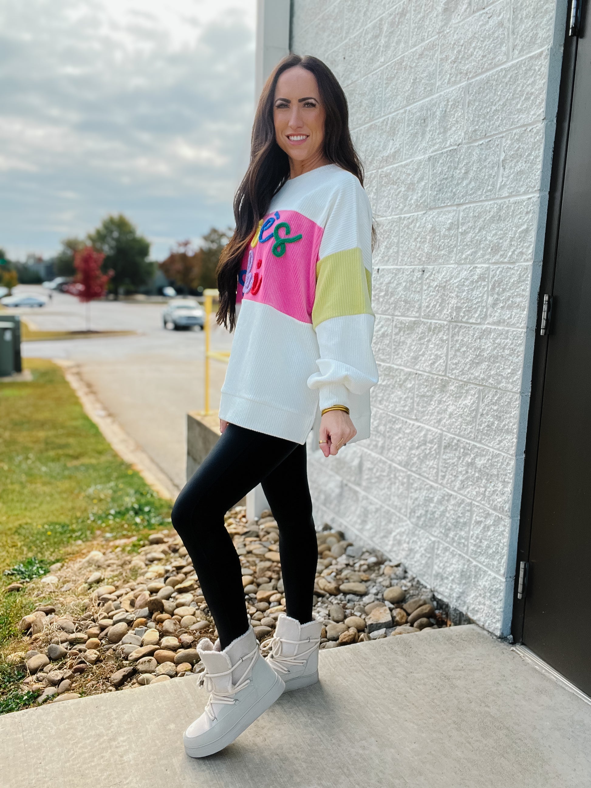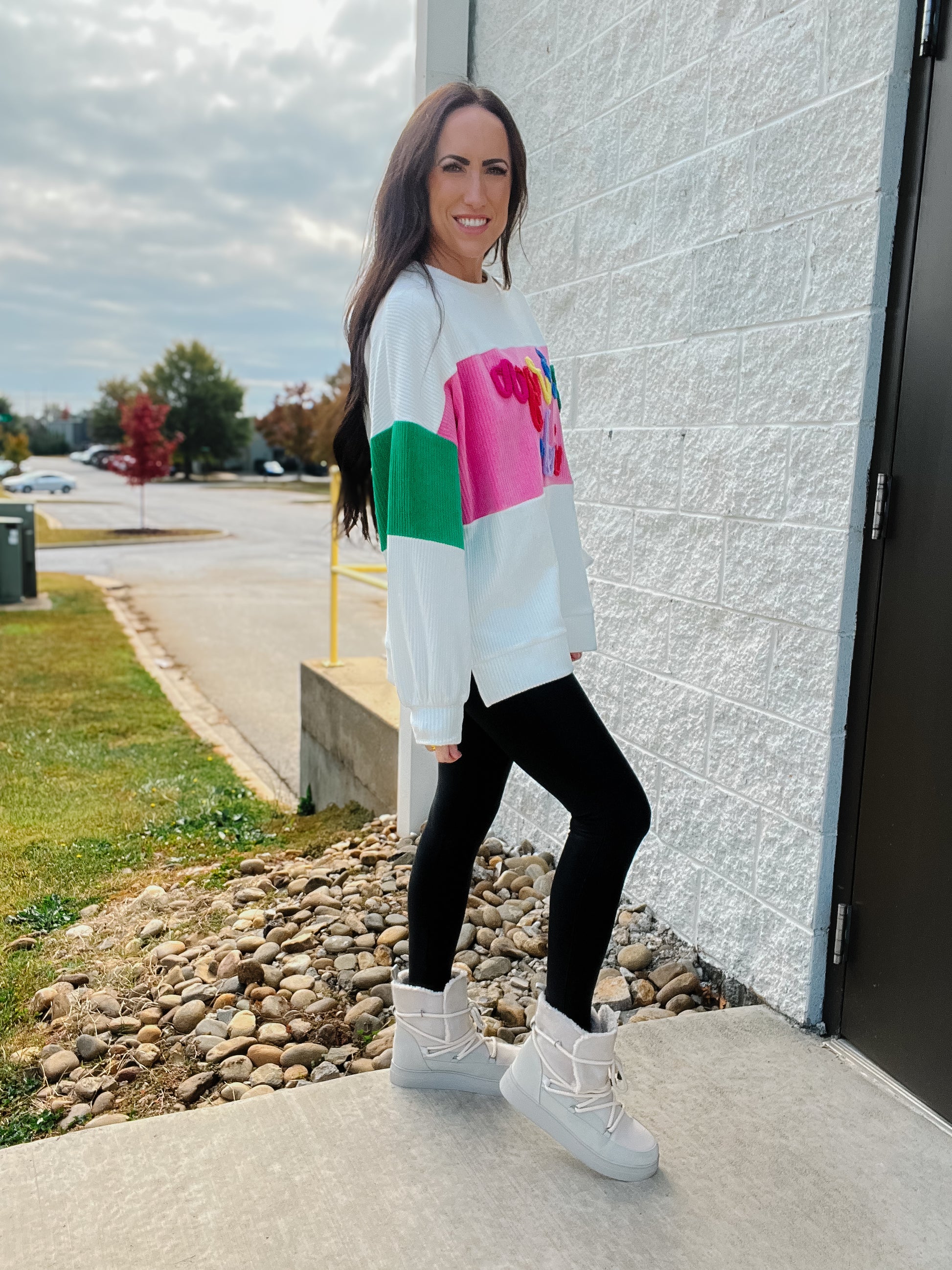 Get ready to hit the slopes with the Apres Ski sweatshirt! Made with corduroy, this cozy sweatshirt features a playful multicolor piping design on the front, perfect for standing out on the ski lodge. Side slits add a touch of style and comfort. Mountain chic at its finest!