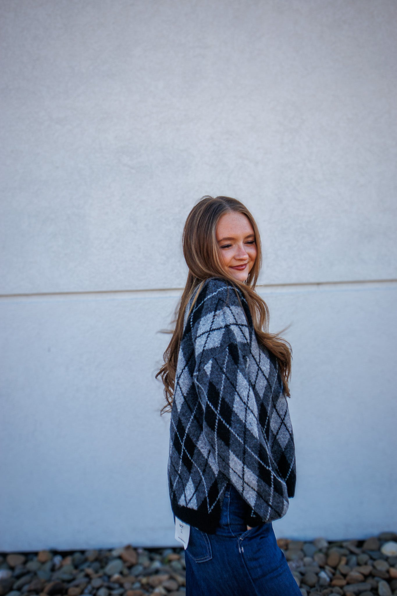 Crafted from premium yarn, this argyle crewneck delivers timeless sophistication with a contemporary edge. The black and gray colorway features a classic diamond pattern that elevates any casual wardrobe. Exceptionally soft to the touch, the fabric drapes beautifully while maintaining its shape through regular wear.