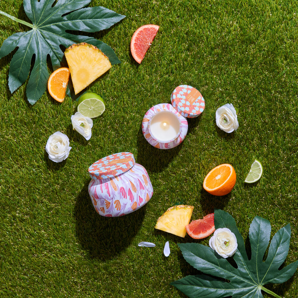 Playful, floral and all things fun! This Pineapple Flower Pattern Play Signature Jar makes your tropical dreams come true with two flirty patterns and a fragrance full of sunshine. With notes of pineapple, lemon flower and sugarcane, this candle is perfect for the summer!