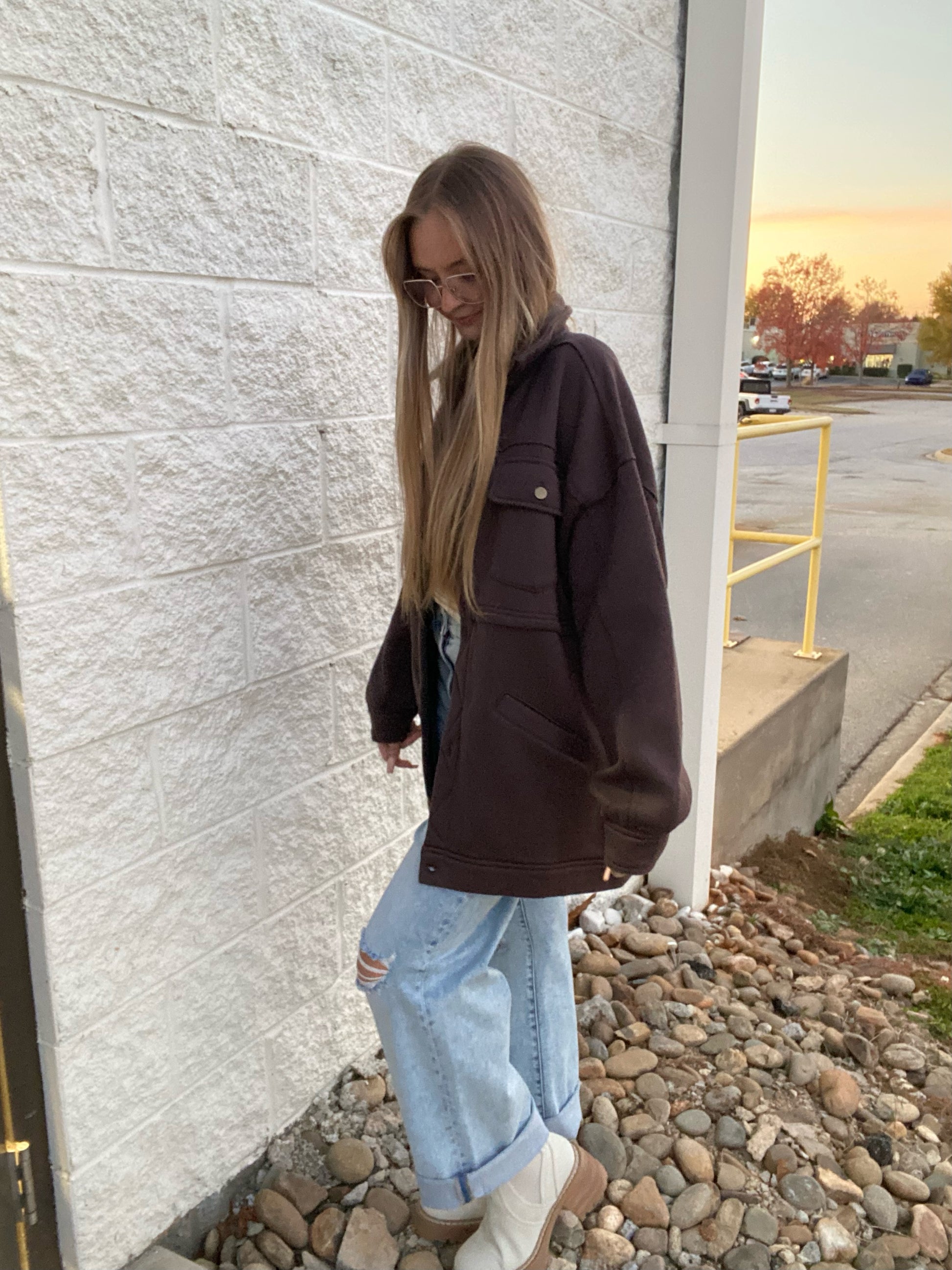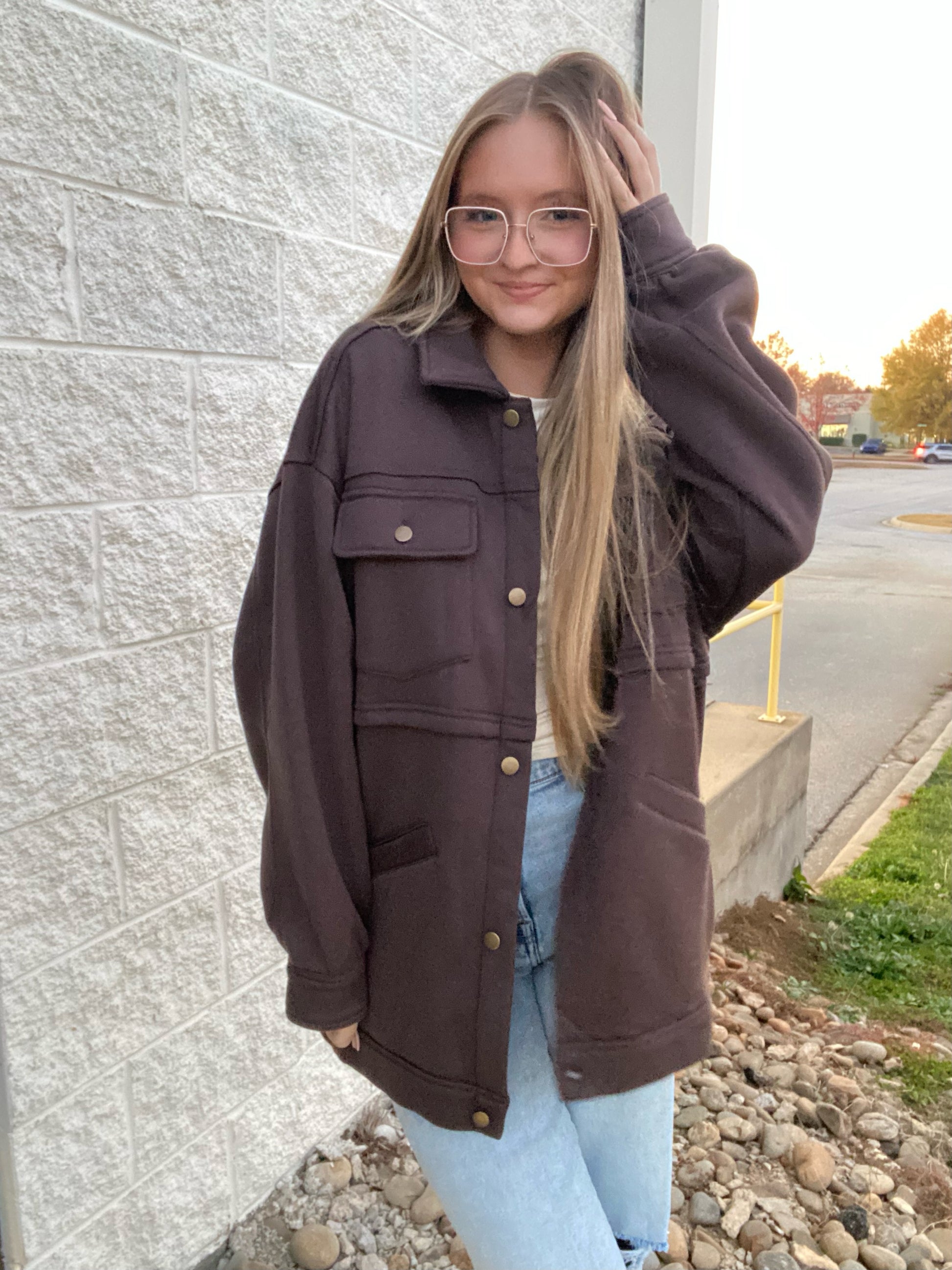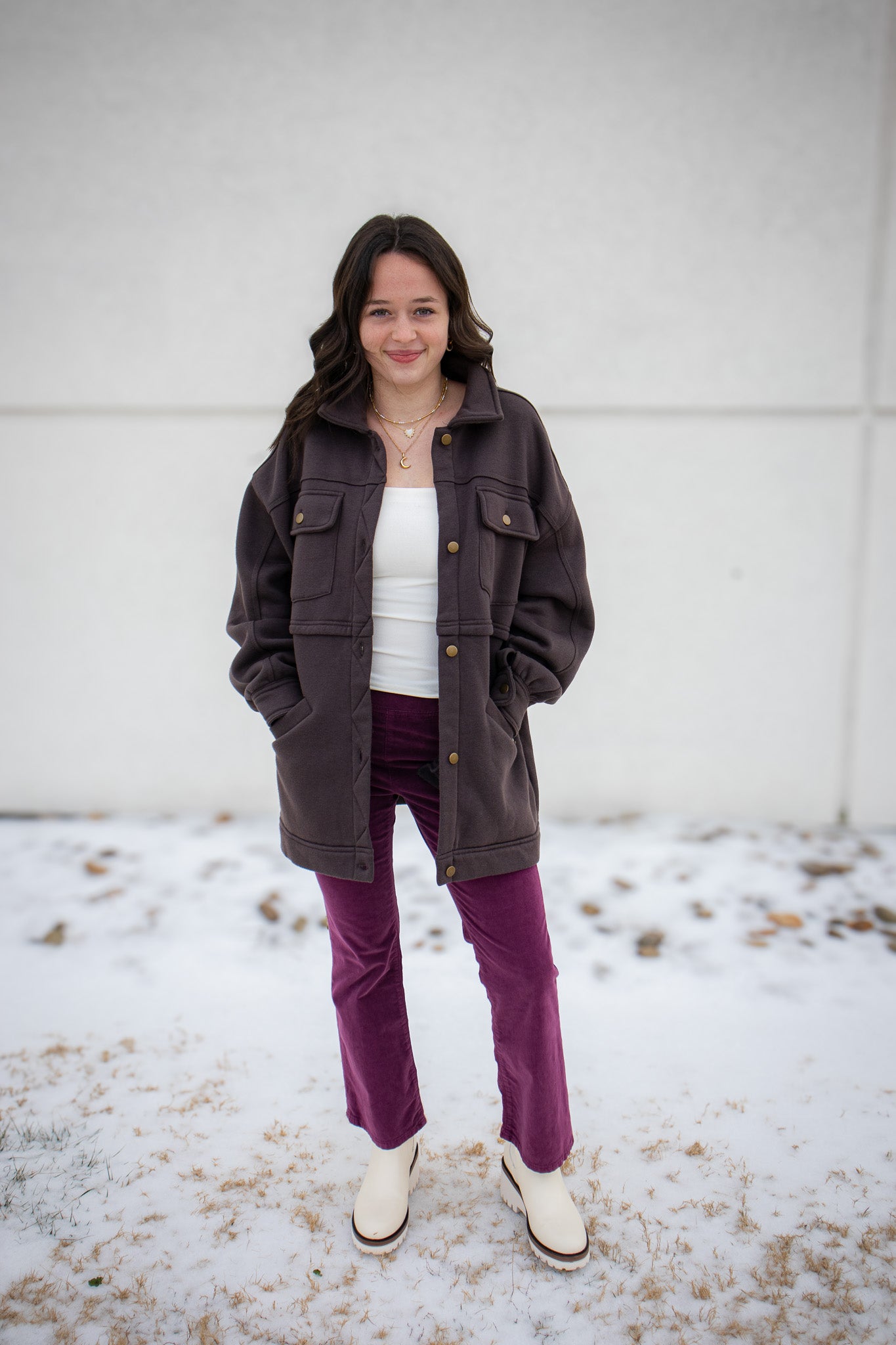 Cozy up in our Charcoal Refined Fleece Jacket with an oversized fit that combines comfort and style. Featuring 4 front pockets to keep your essentials close and a gold button closure for a touch of sophistication. Perfect for staying warm and on-trend this season!