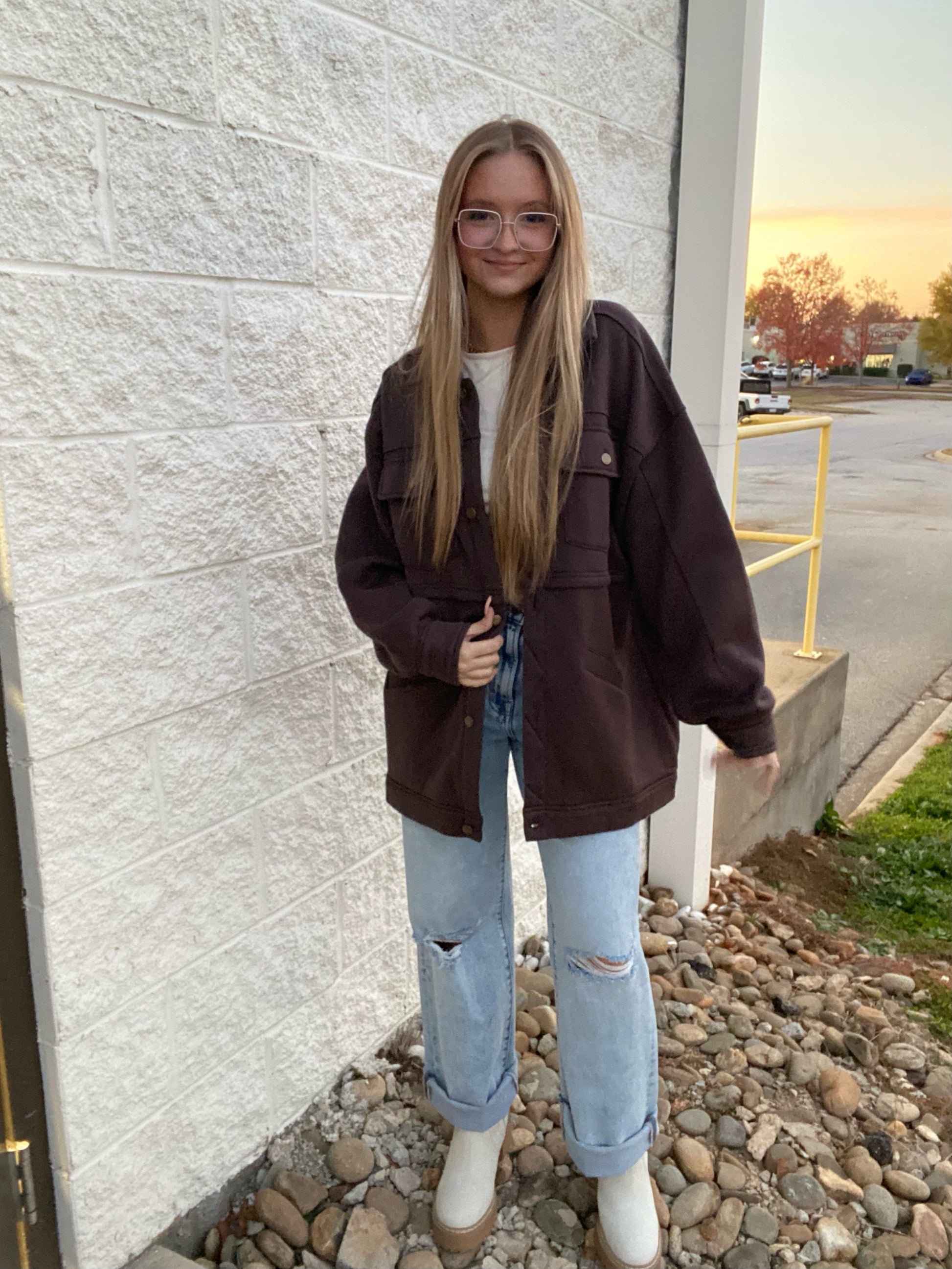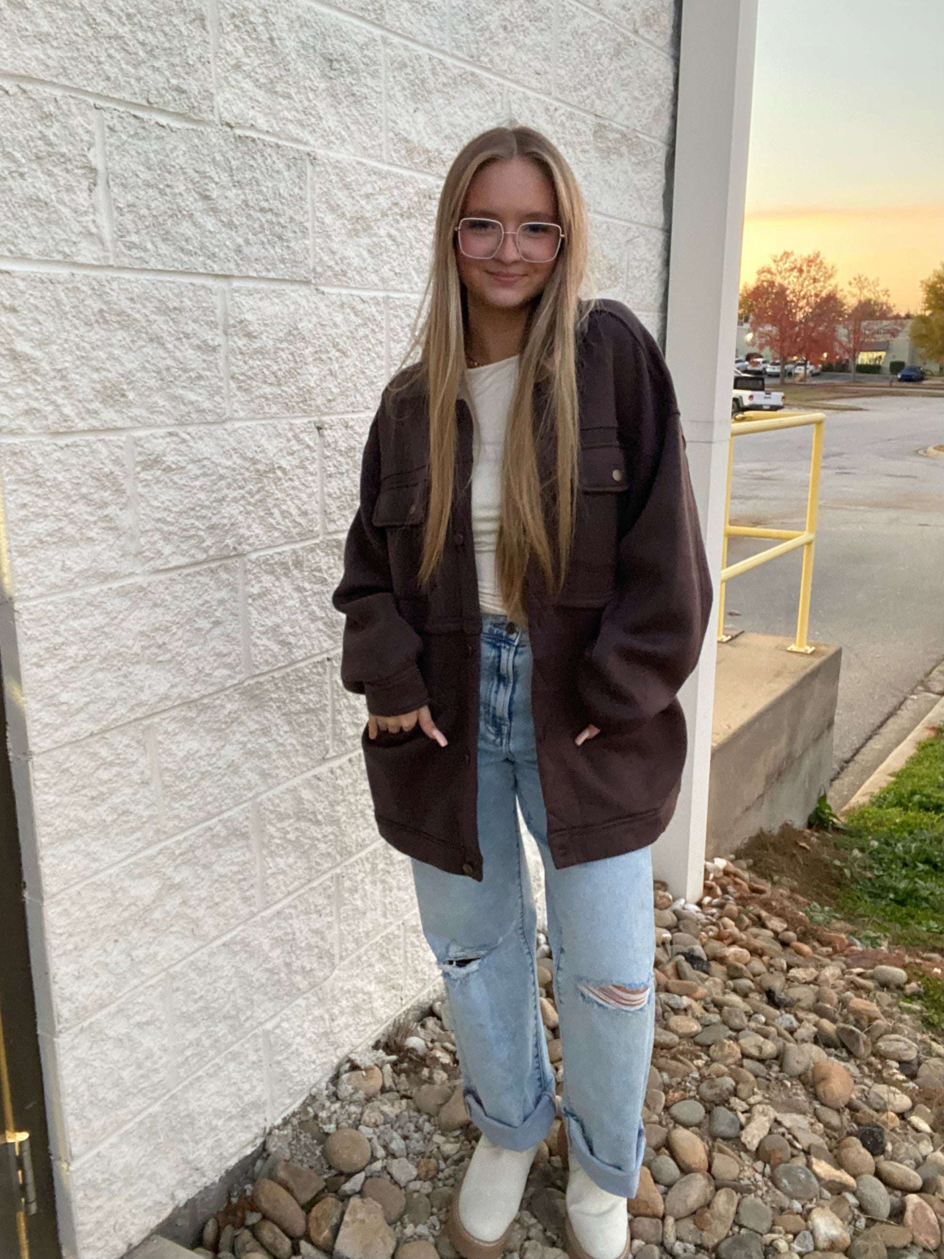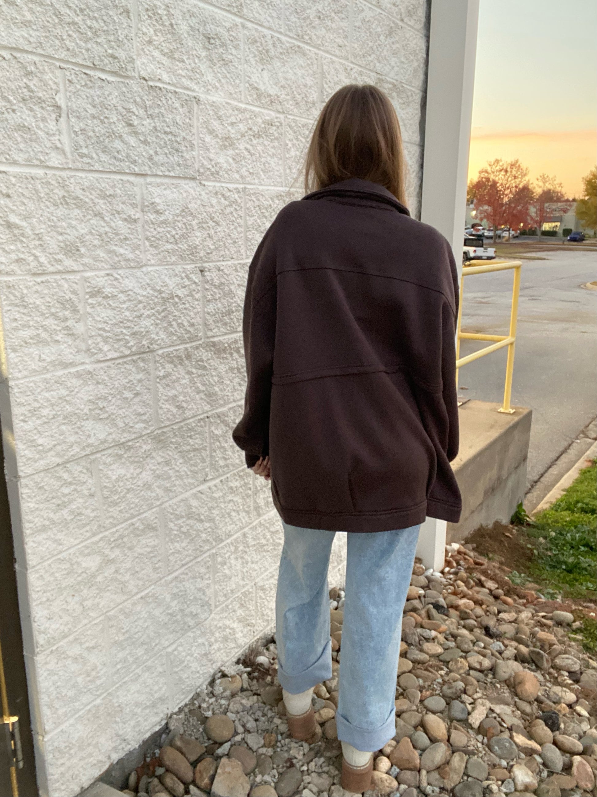 Cozy up in our Charcoal Refined Fleece Jacket with an oversized fit that combines comfort and style. Featuring 4 front pockets to keep your essentials close and a gold button closure for a touch of sophistication. Perfect for staying warm and on-trend this season!