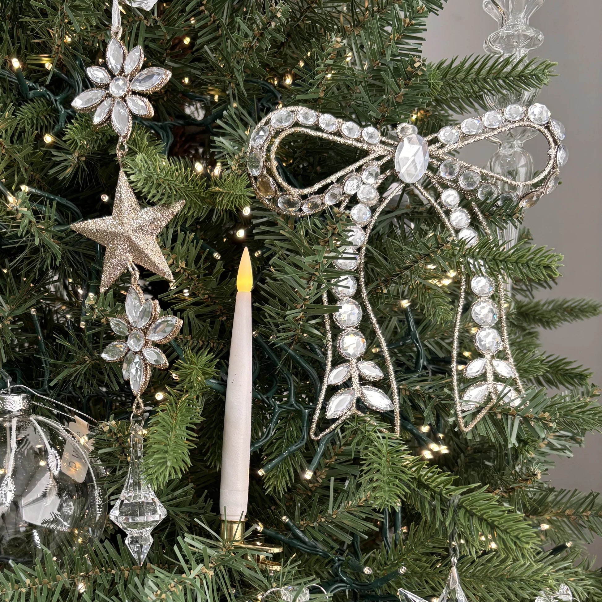 Add a touch of sparkle to your holiday décor with the RAZ 7.25" Clear Jeweled Bow Ornament. Crafted from durable metal, this elegant ornament features clear jewel accents that catch the light beautifully. Measuring 7” long by 7.25” high and just 0.5” wide, it’s perfectly sized to enhance your tree or festive displays with timeless charm.