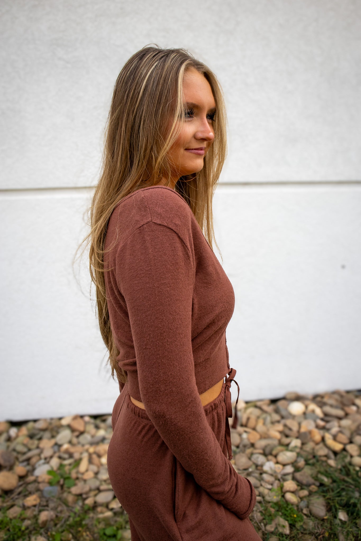 Experience ultimate comfort and style with the Cuddle Up Lounge Set. The cropped top features a flattering wide V-neck and faux front buttons, complemented by cozy long sleeves. The matching pants provide a perfect fit with an elastic waistband, drawstring, and handy pockets, all designed in a super soft and stretchy fabric. Ideal for relaxing at home or casual outings, this set offers effortless comfort without sacrificing style.