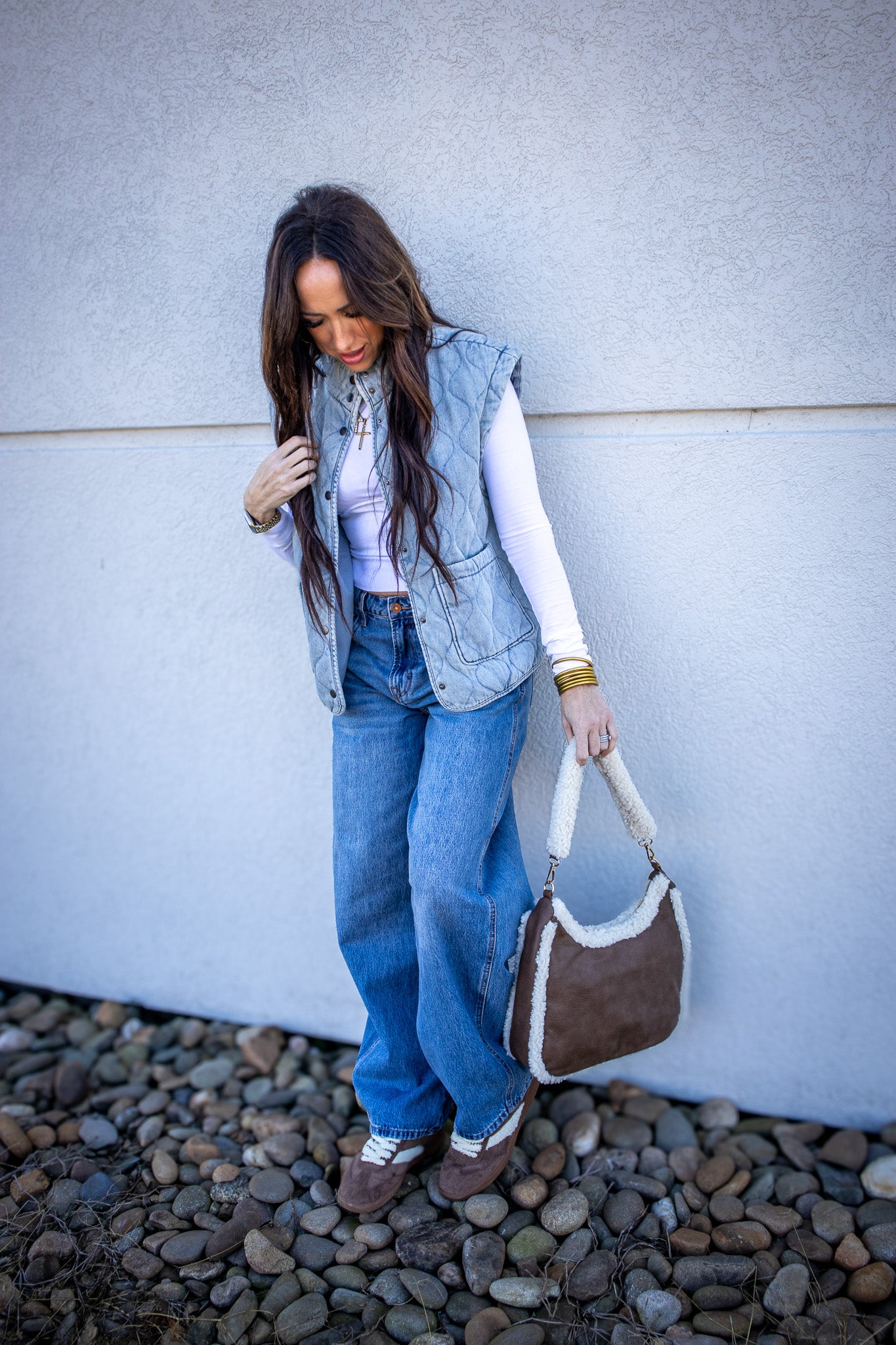 Layer up with effortless style in this quilted denim vest. Crafted from durable denim with a cozy quilted interior, it features a flattering high neck, convenient snap button closure, and functional pockets for everyday practicality. Fully lined for comfort and warmth, this versatile piece transitions seamlessly from casual outings to weekend adventures. A wardrobe essential that combines comfort with timeless appeal.