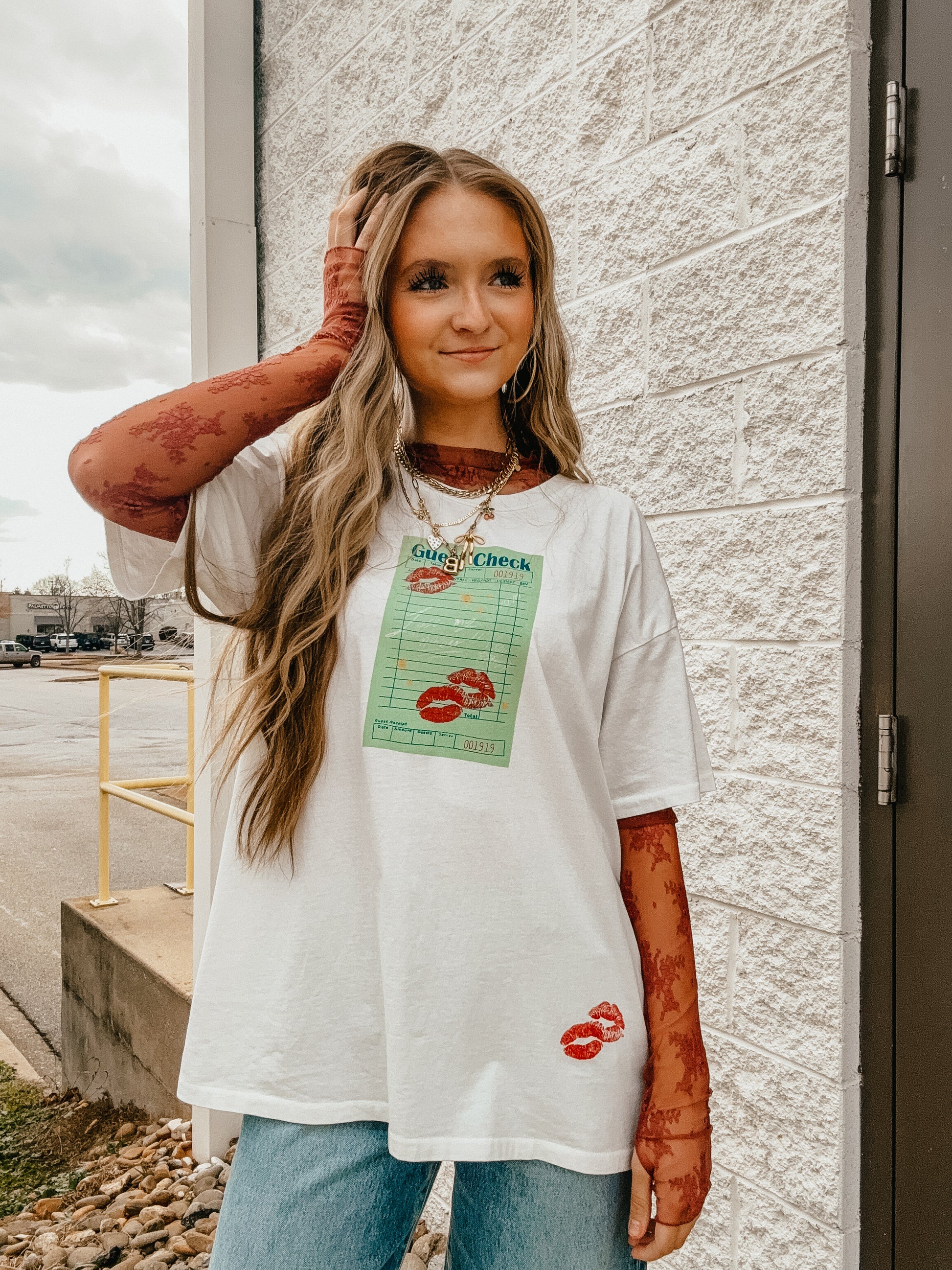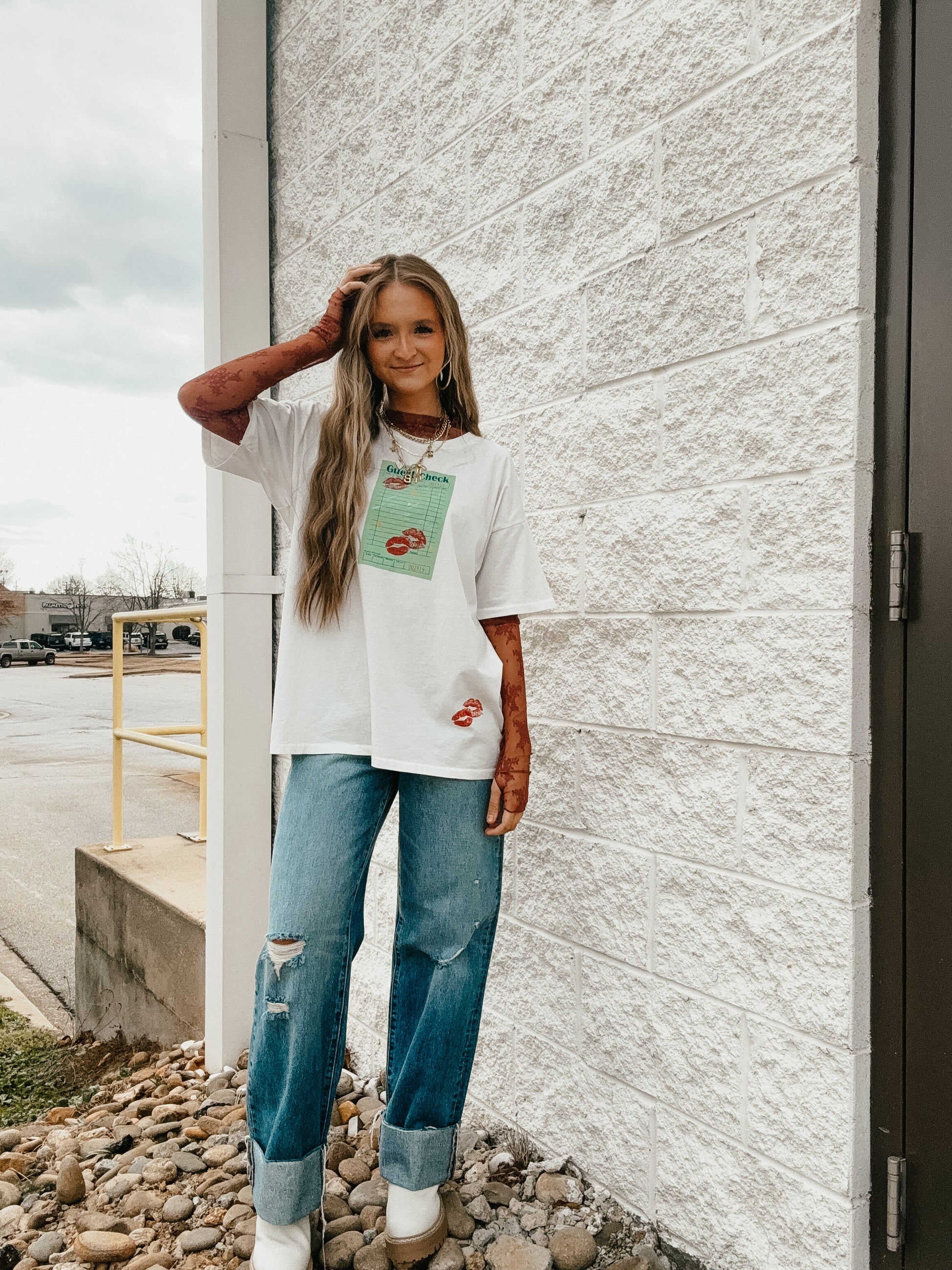 Check, please. An acquired tee that comes with receipts, stamped with scattered kisses.