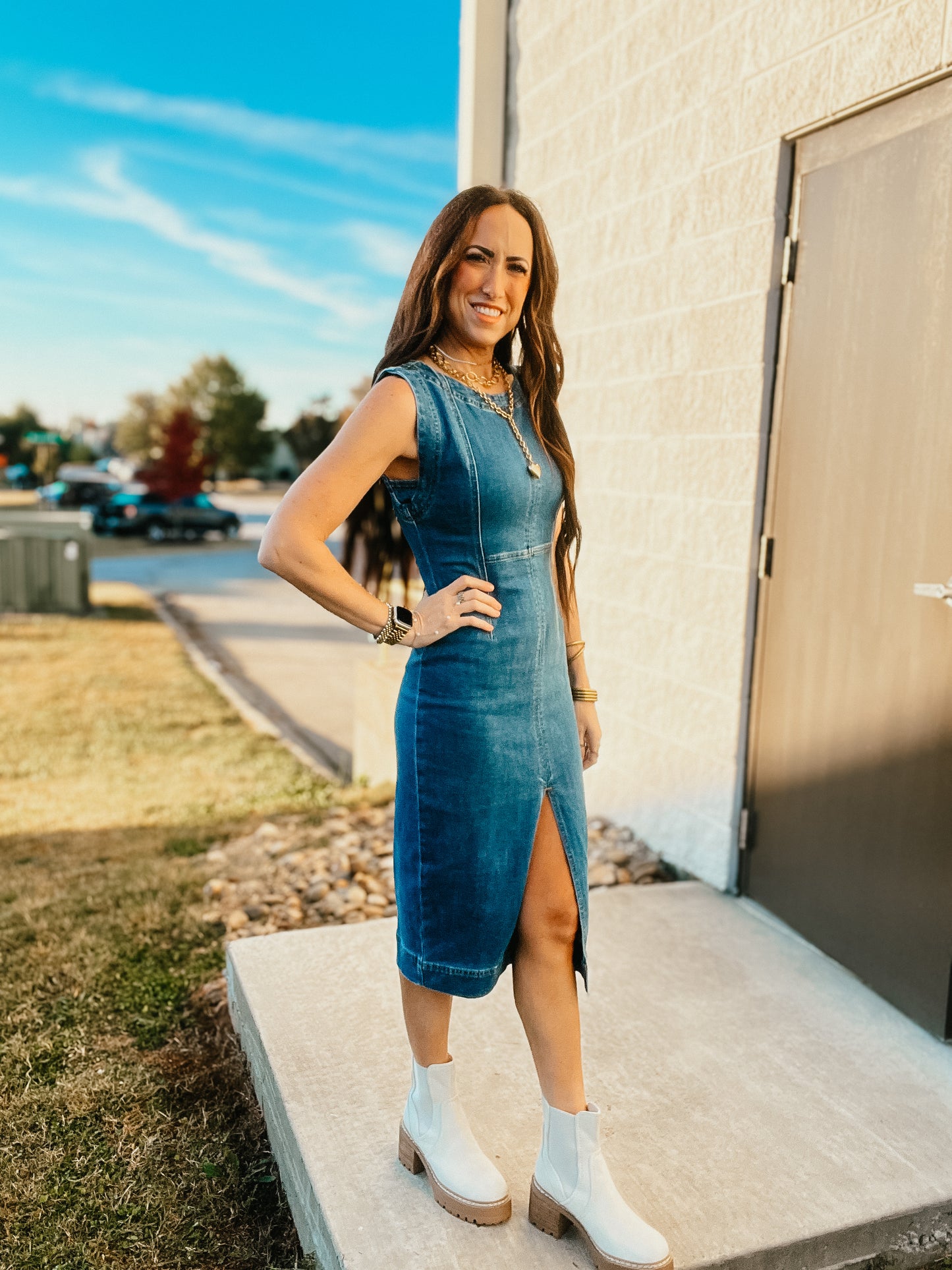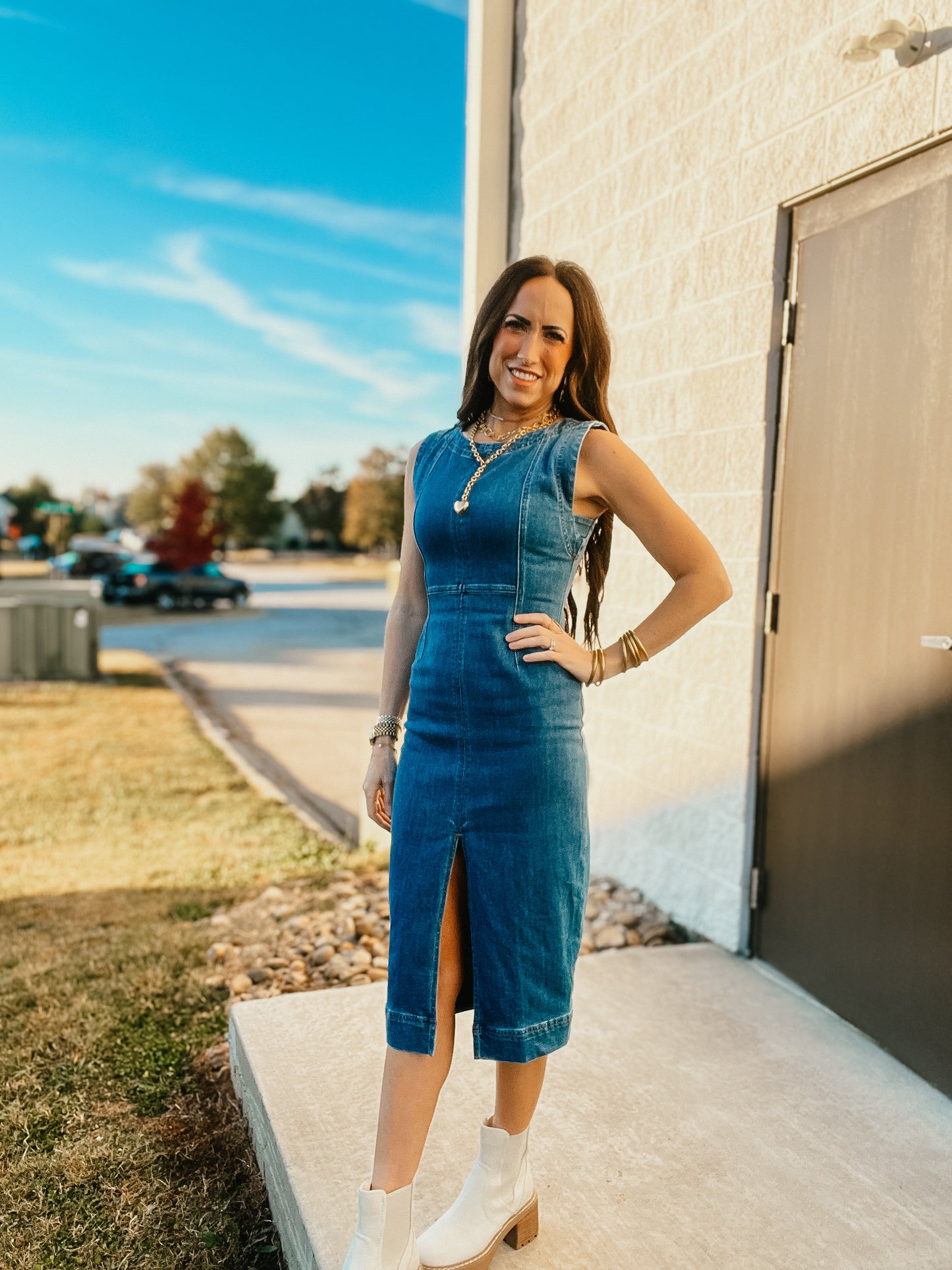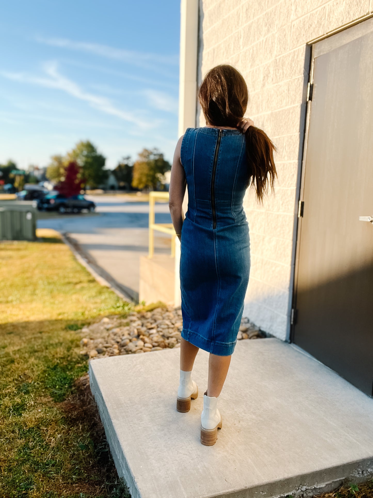 Indulge in the luxurious comfort of the Denim Dreamer Midi Dress. Crafted from soft stretchy denim fabric, this dress hugs your curves and flatters your figure. The back zipper closure ensures a sleek silhouette, while the sleeveless design offers a chic and sophisticated look. Elevate your wardrobe with this exclusive and elegant dress.