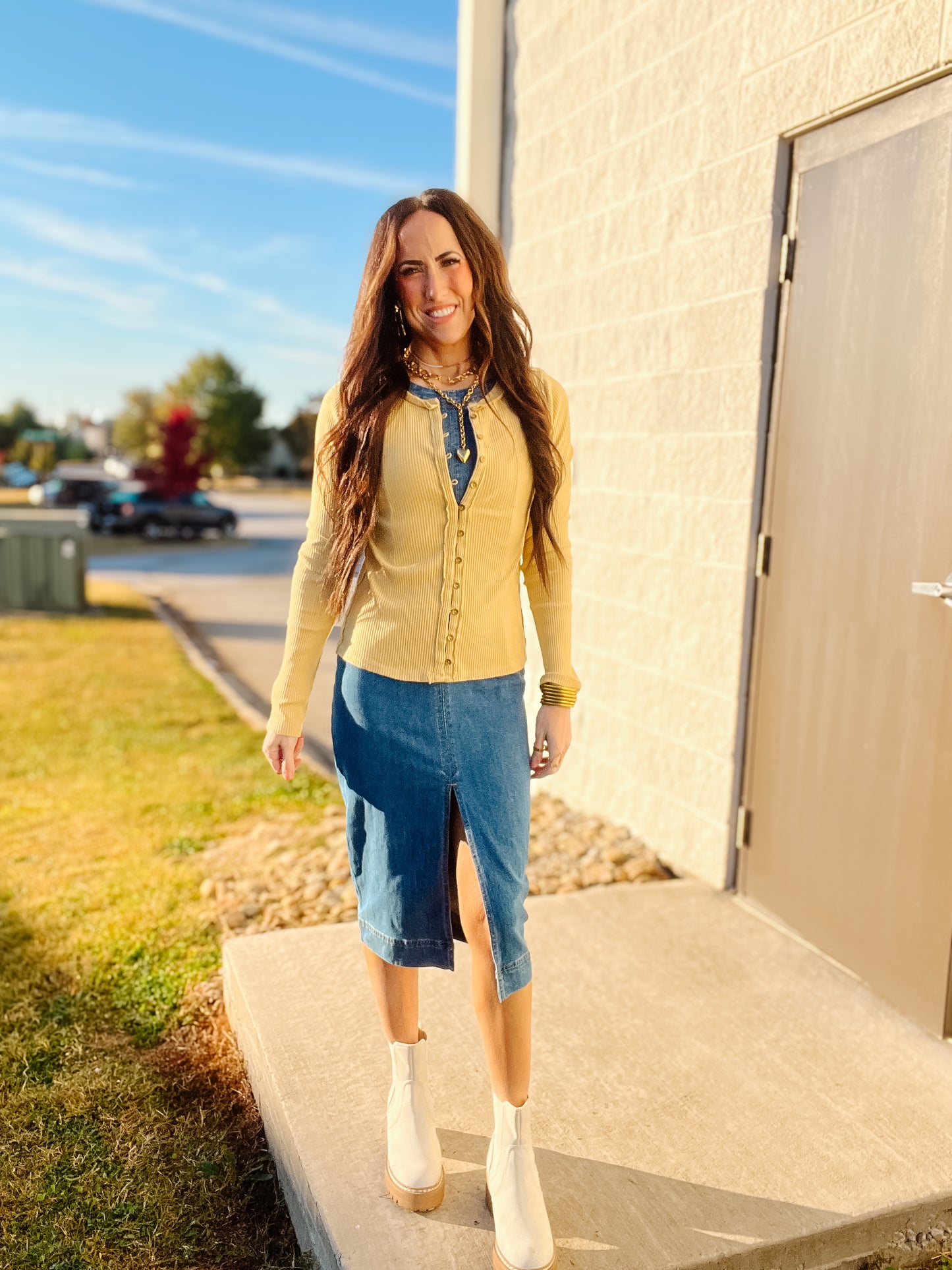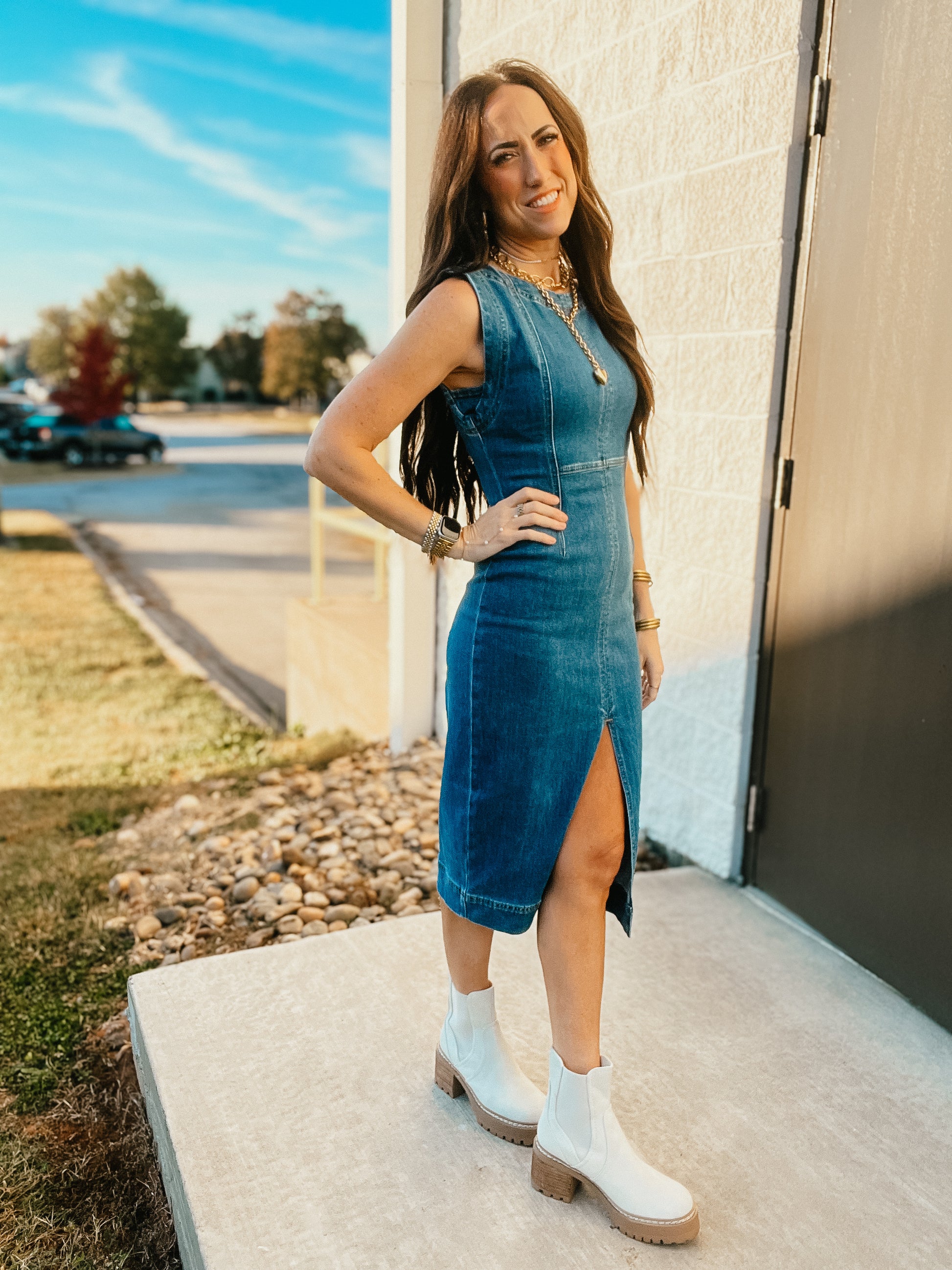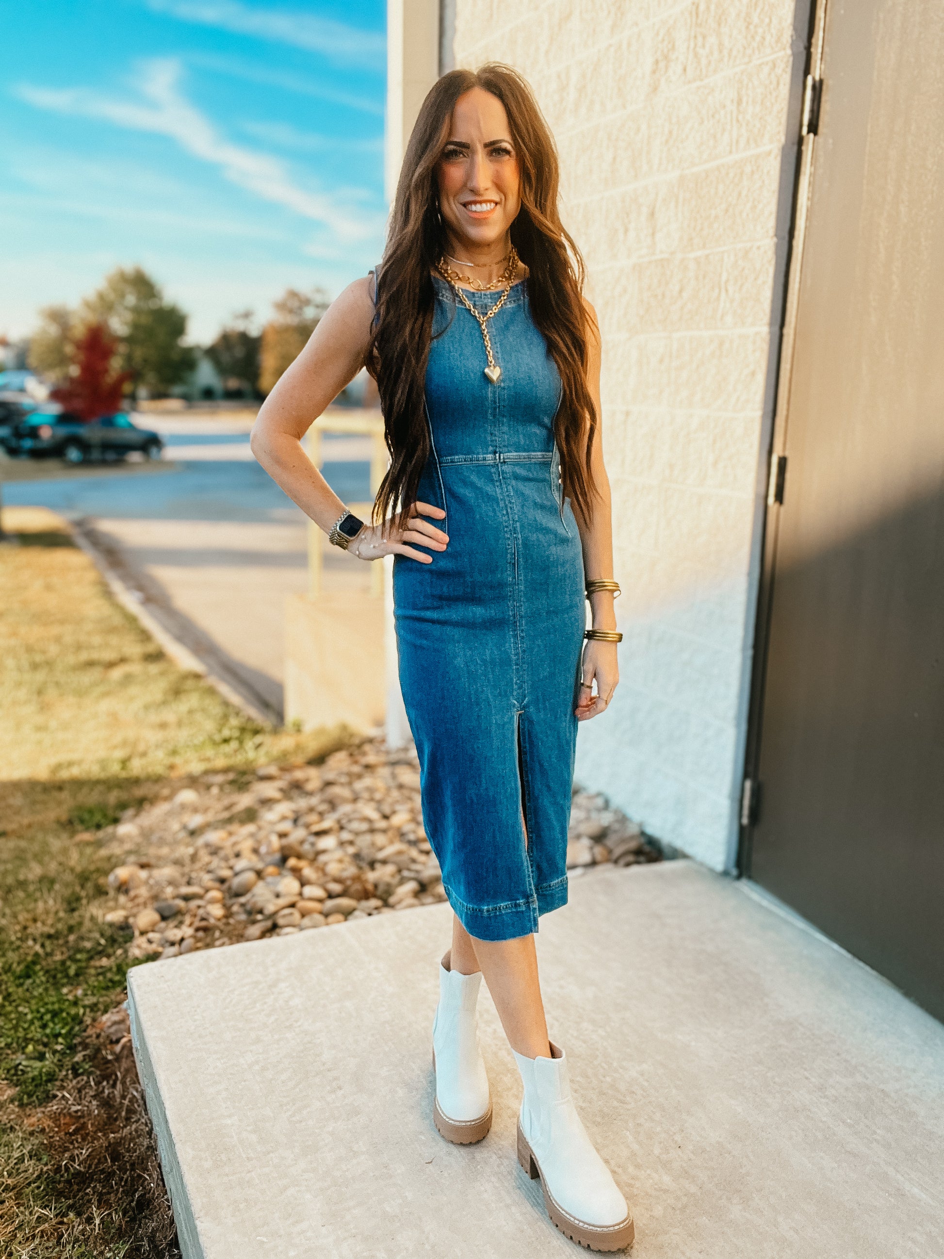 Indulge in the luxurious comfort of the Denim Dreamer Midi Dress. Crafted from soft stretchy denim fabric, this dress hugs your curves and flatters your figure. The back zipper closure ensures a sleek silhouette, while the sleeveless design offers a chic and sophisticated look. Elevate your wardrobe with this exclusive and elegant dress.