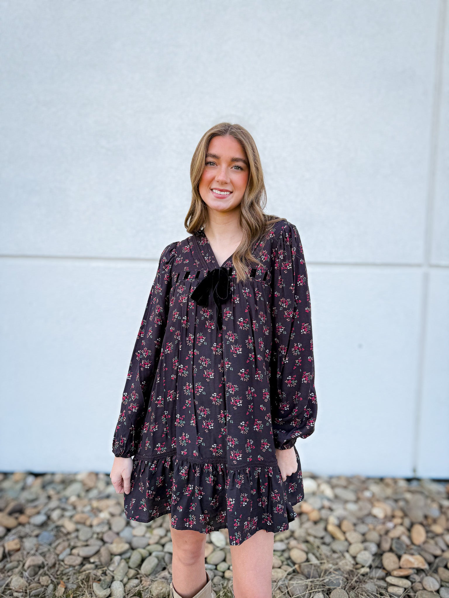 This elegant dress combines timeless sophistication with festive charm. The striking black and red floral print creates visual interest, while voluminous bubble sleeves add a contemporary touch. A luxurious velvet tie bow at the neckline serves as a refined focal point, elevating the overall design. Fully lined construction ensures comfort and durability, making this piece both beautiful and practical for special occasions or elevated everyday wear.