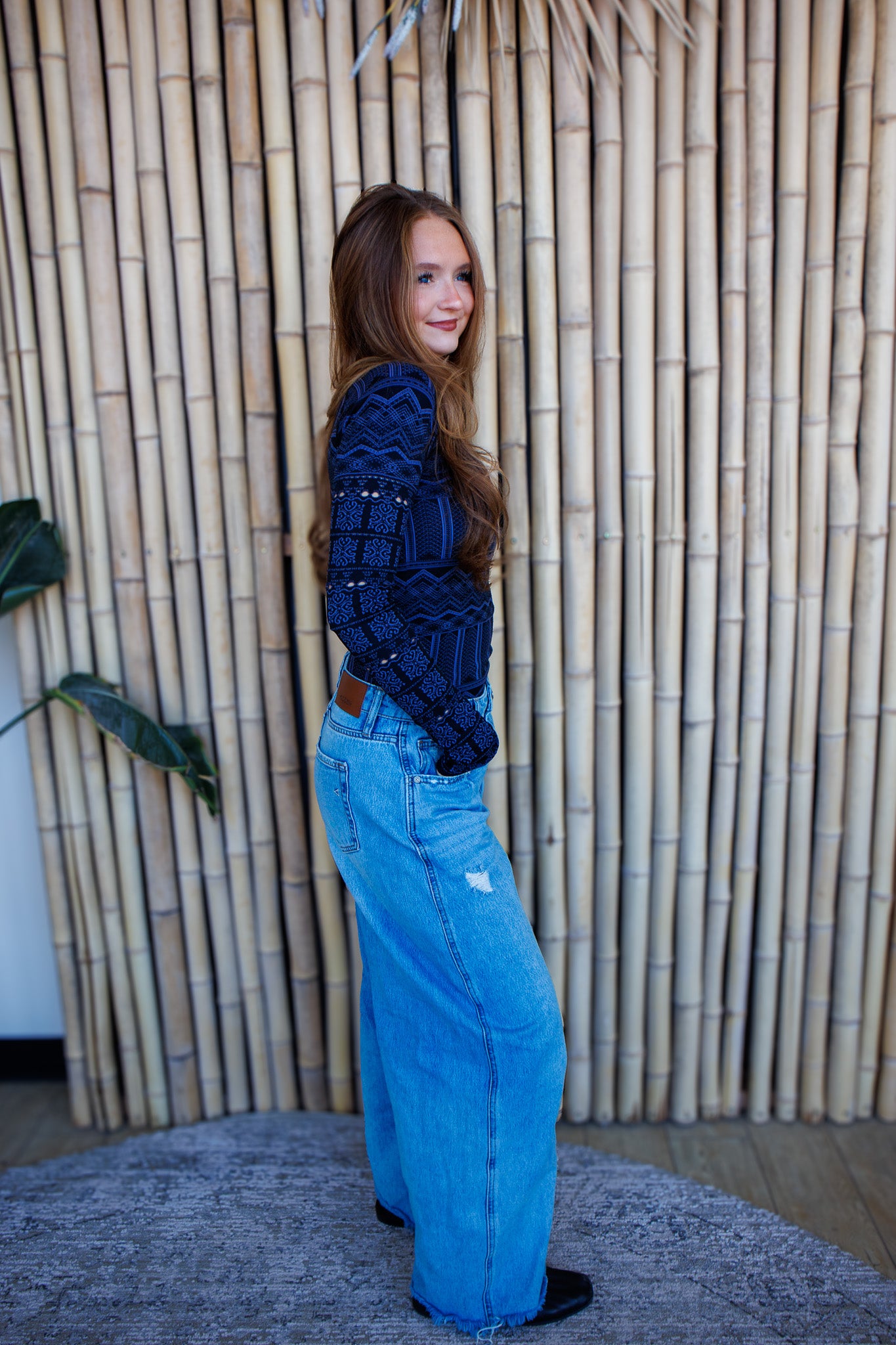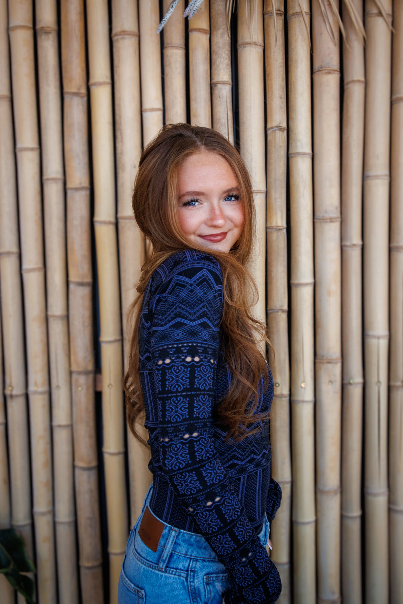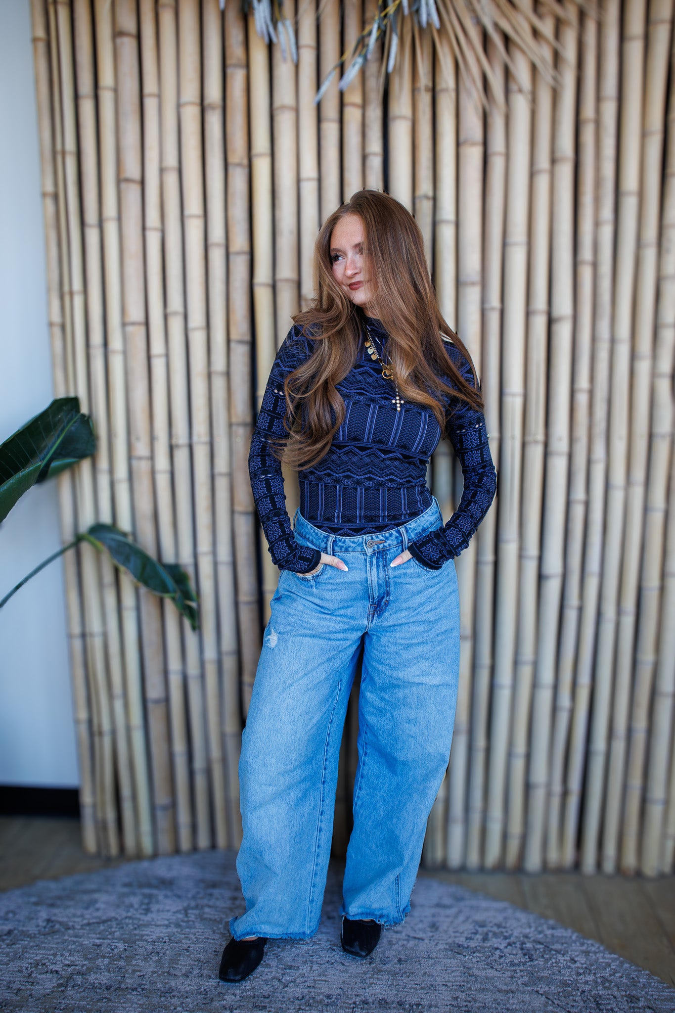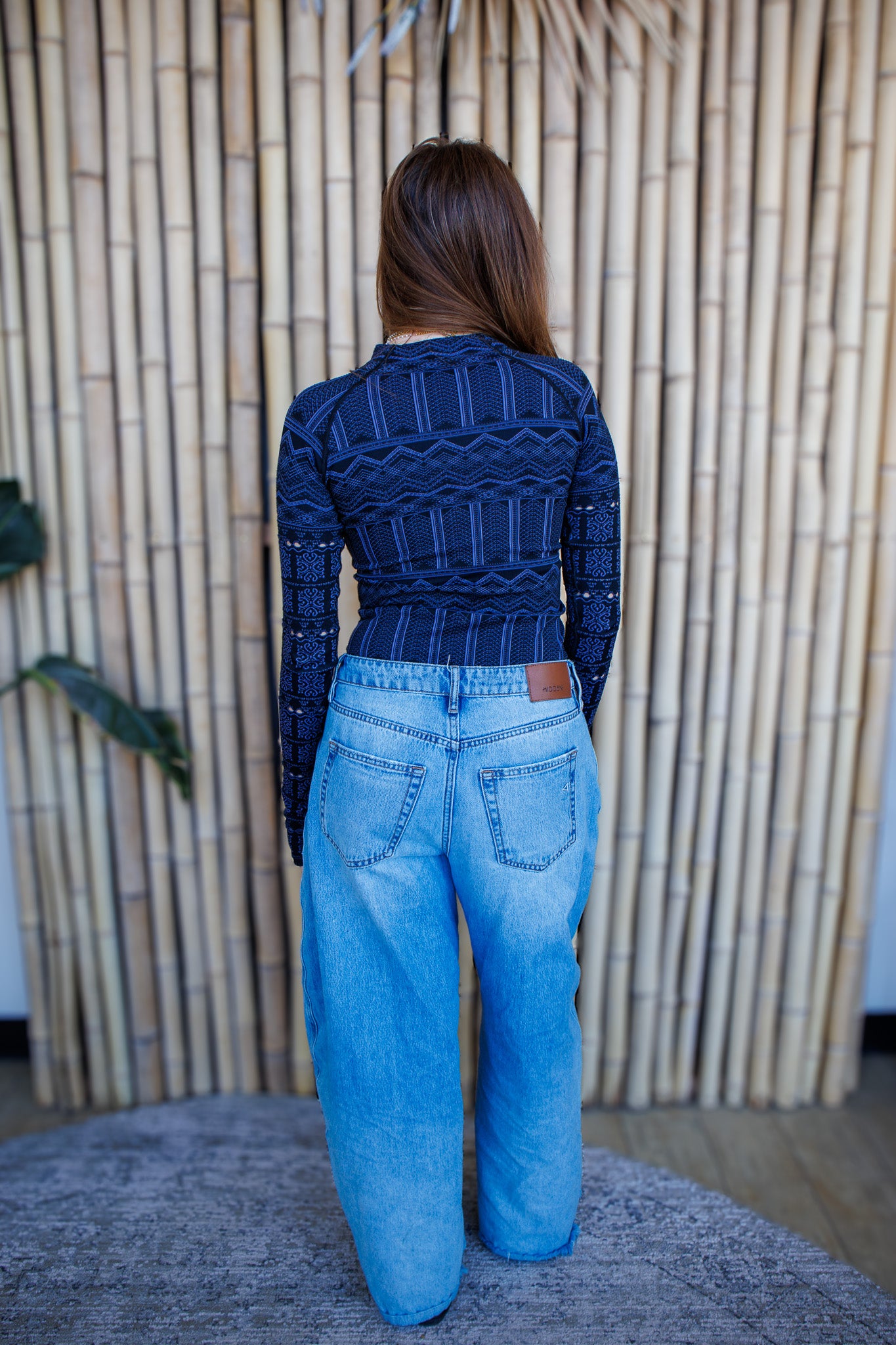 Features: Breathable, ultra-light fabrication; stretchy feel; mock neckline; long sleeves with eyelet details; jacquard detailing throughout; rib-knit hem.