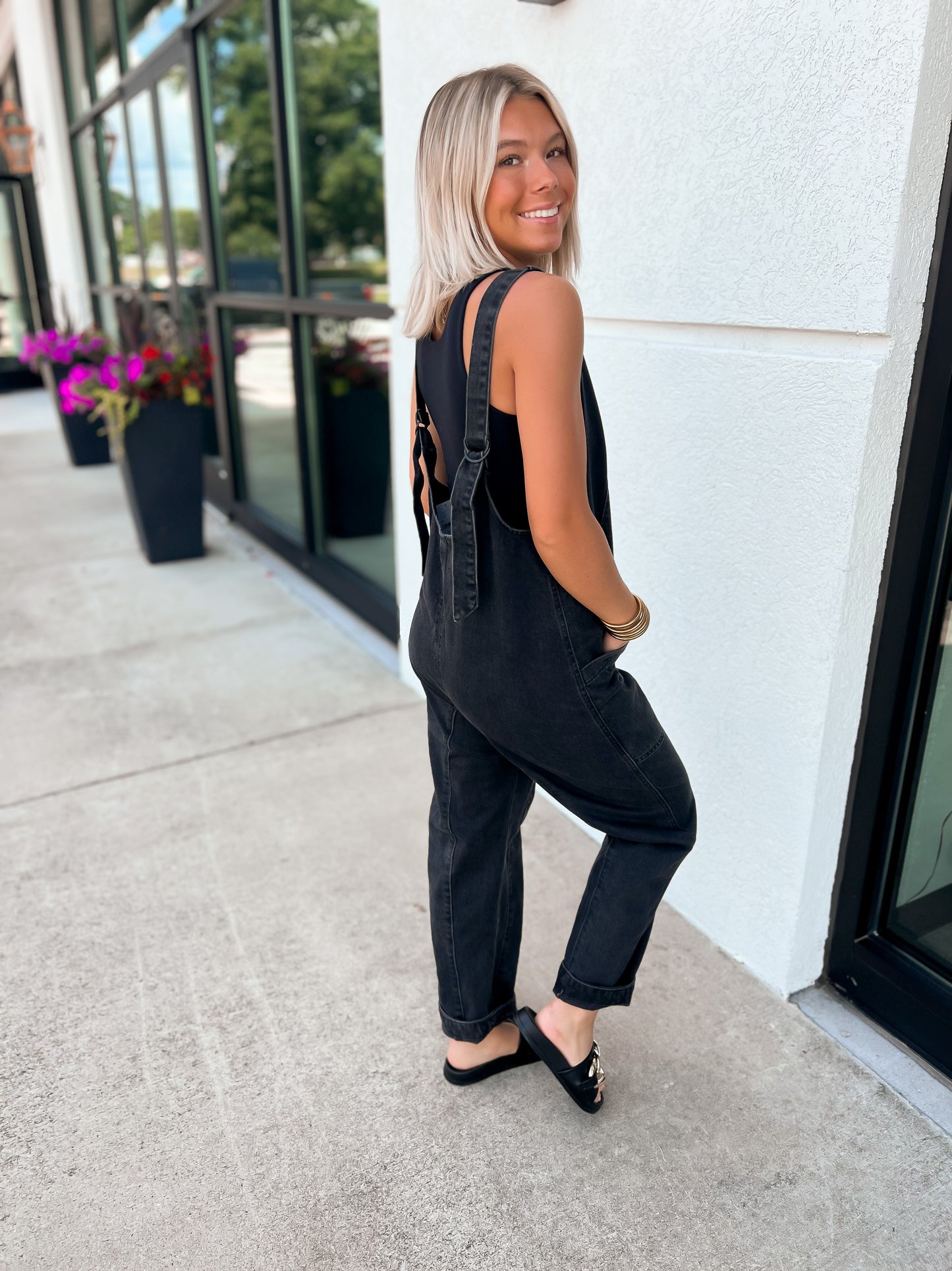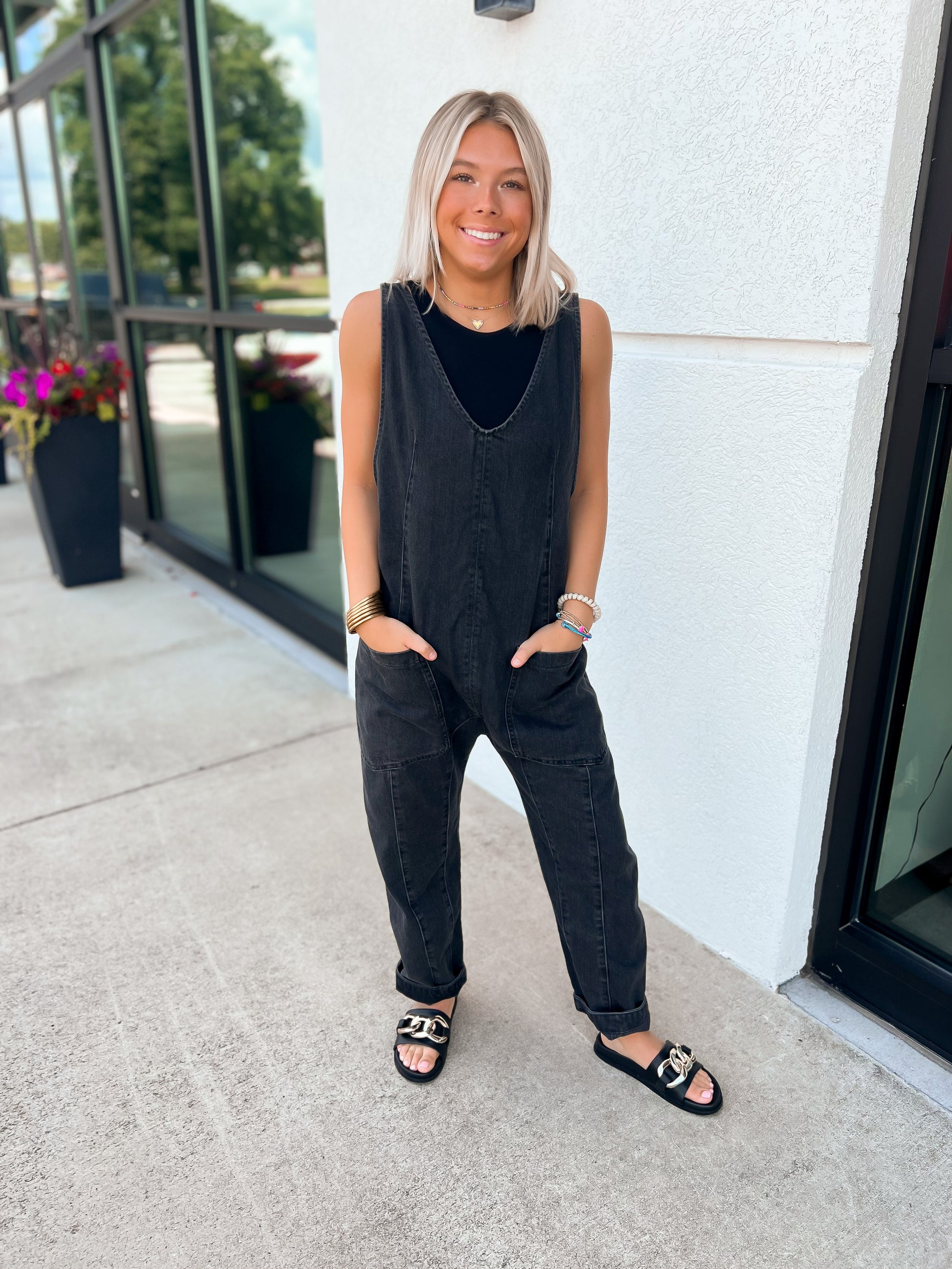 Elevate your casual wardrobe with this mineral black denim jumpsuit. It features a relaxed fit and cropped ankle-length style, perfect for effortless chic. The harem legs and low scoop neckline add a modern twist. Ideal for pairing with a graphic tee and sneakers.