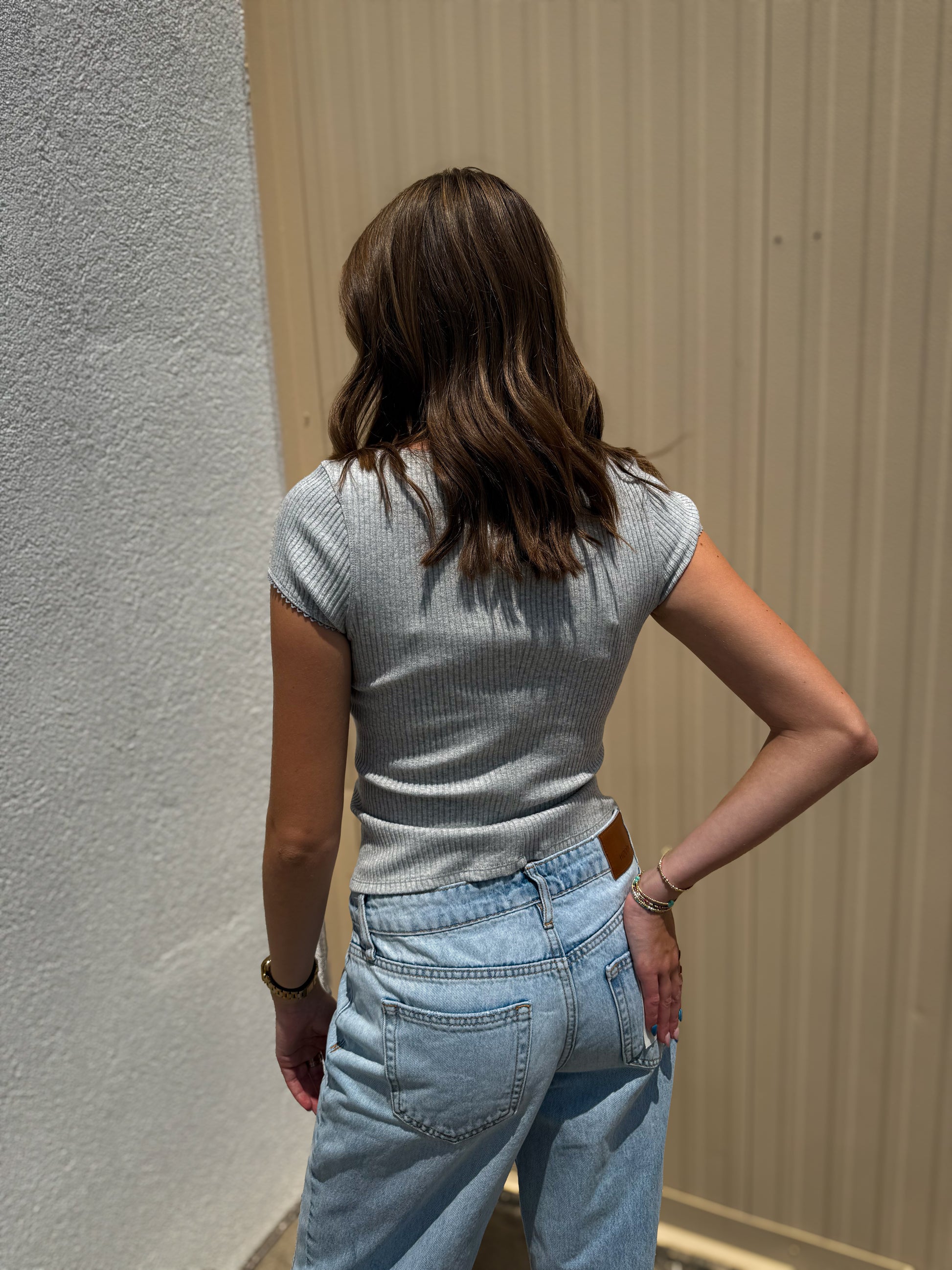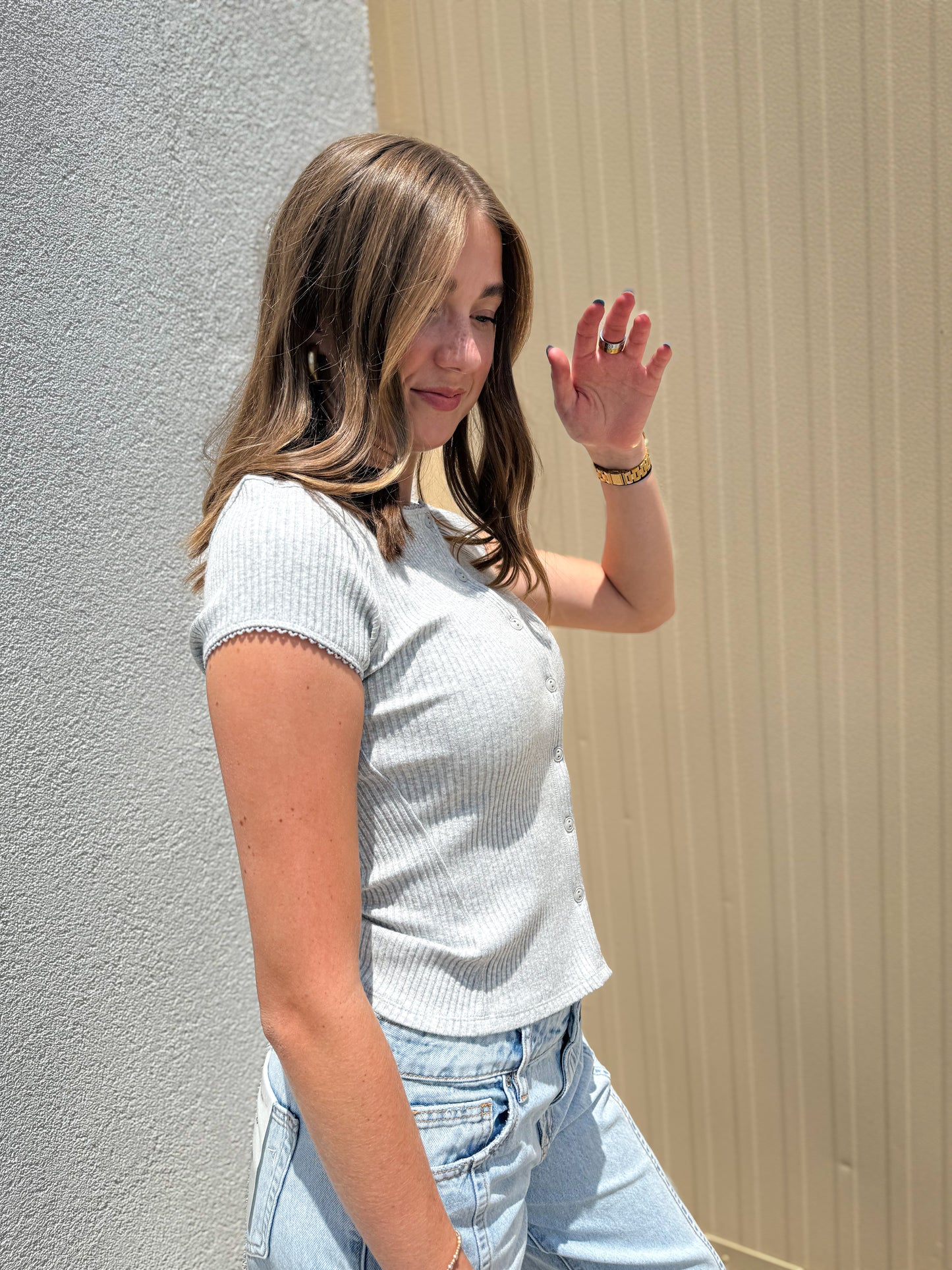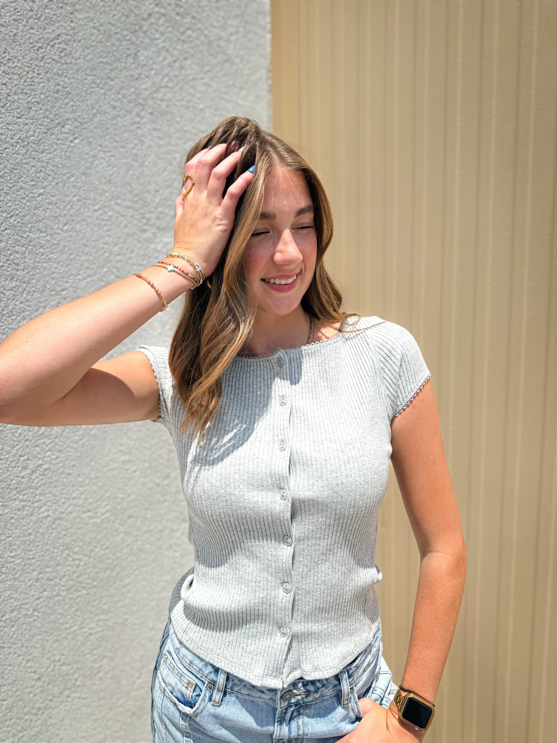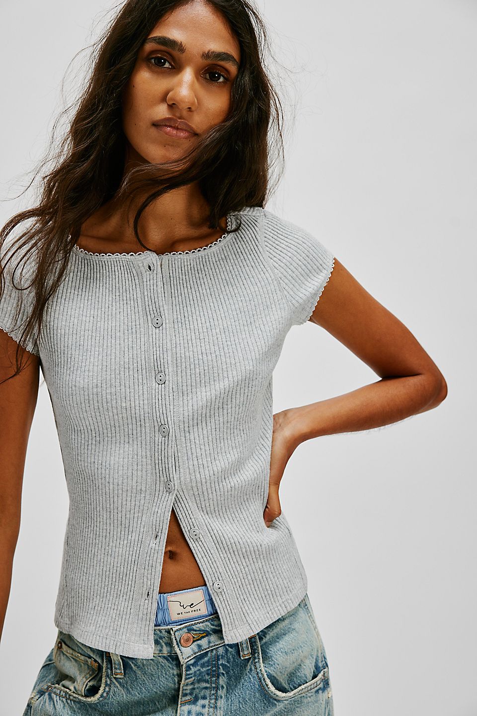 Features: Ribbed swit fabrication, crew neckline, button-front closure, capped sleeves, picot trim