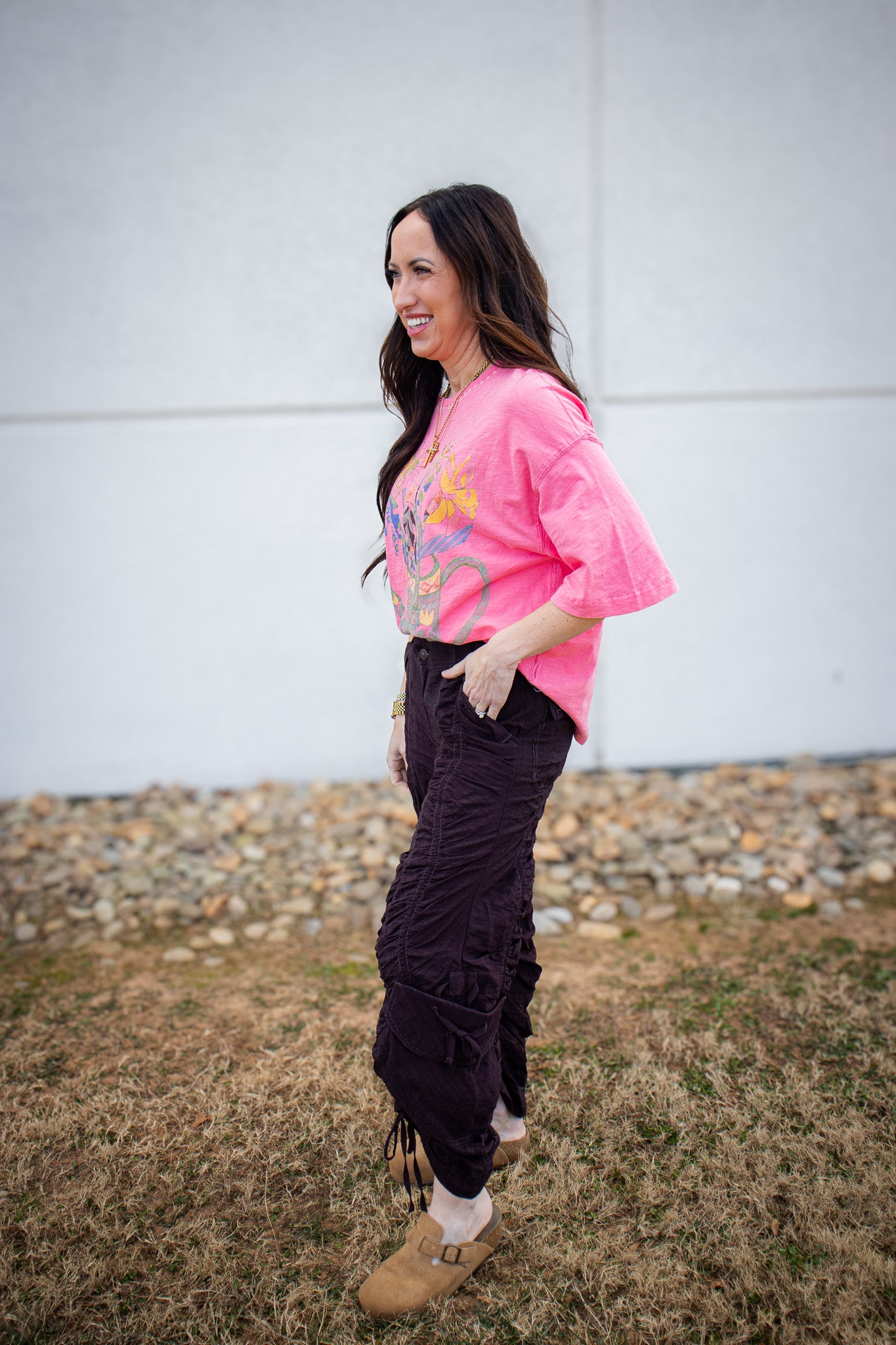 All-over shirring reinvents the classic cargo style of these staple pants.