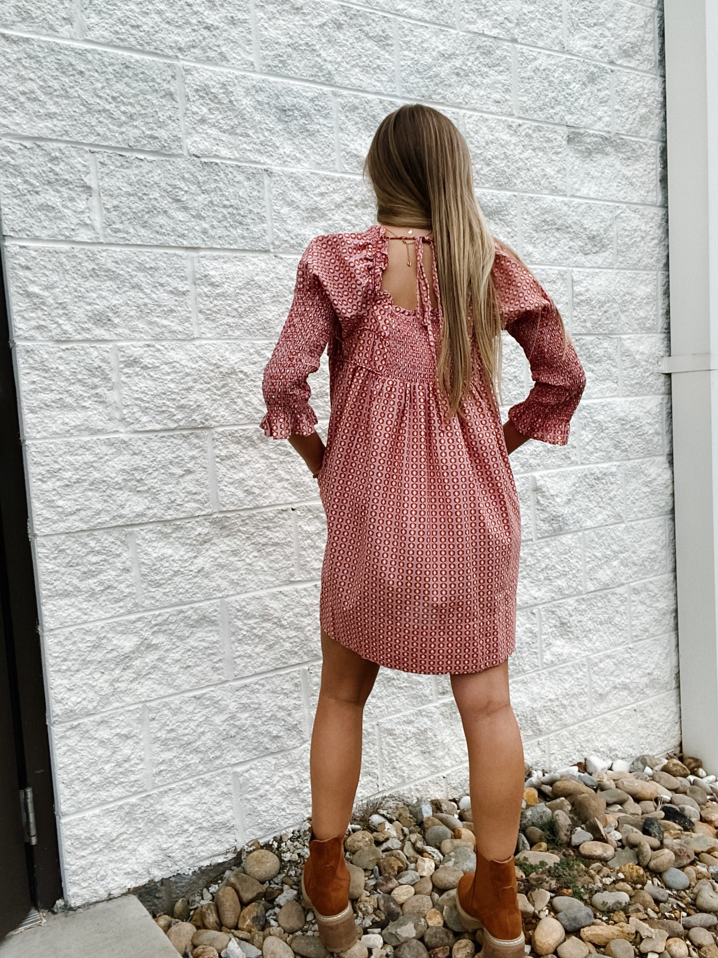 Features: Printed cotton fabrication, sweetheart-neckline, gathered bust detail with functional tie, puffy ¾ sleeves with smocked detail, adjustable tie at back, smocked panel, lined