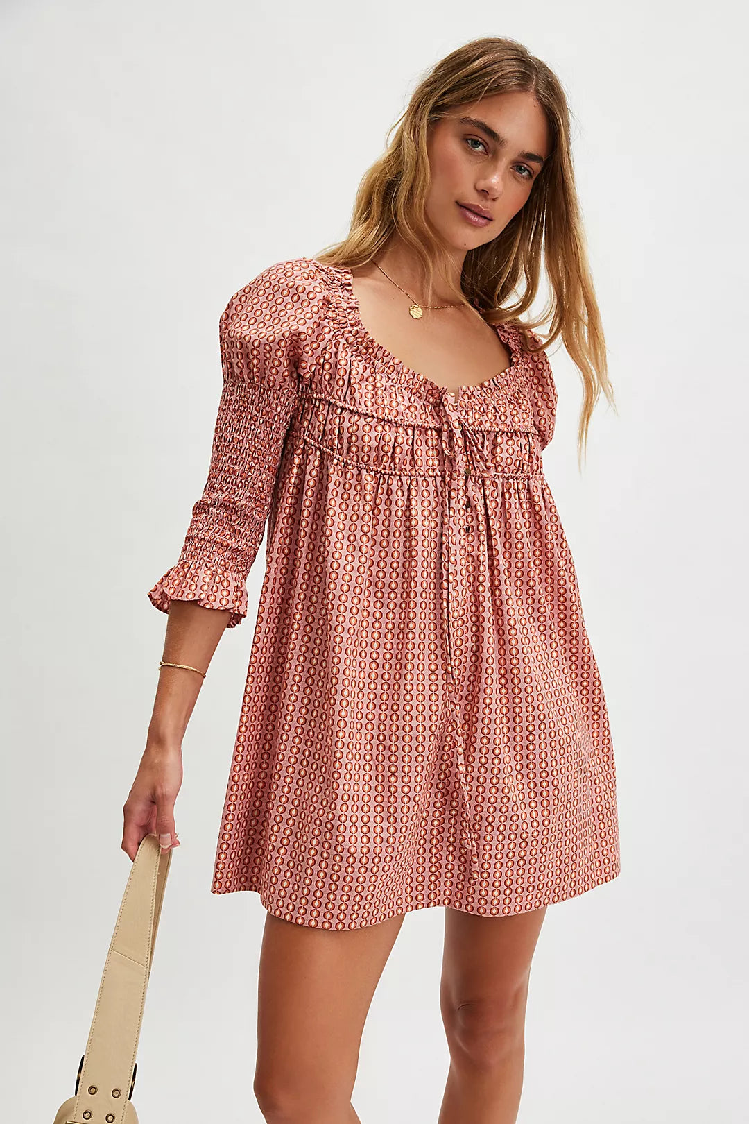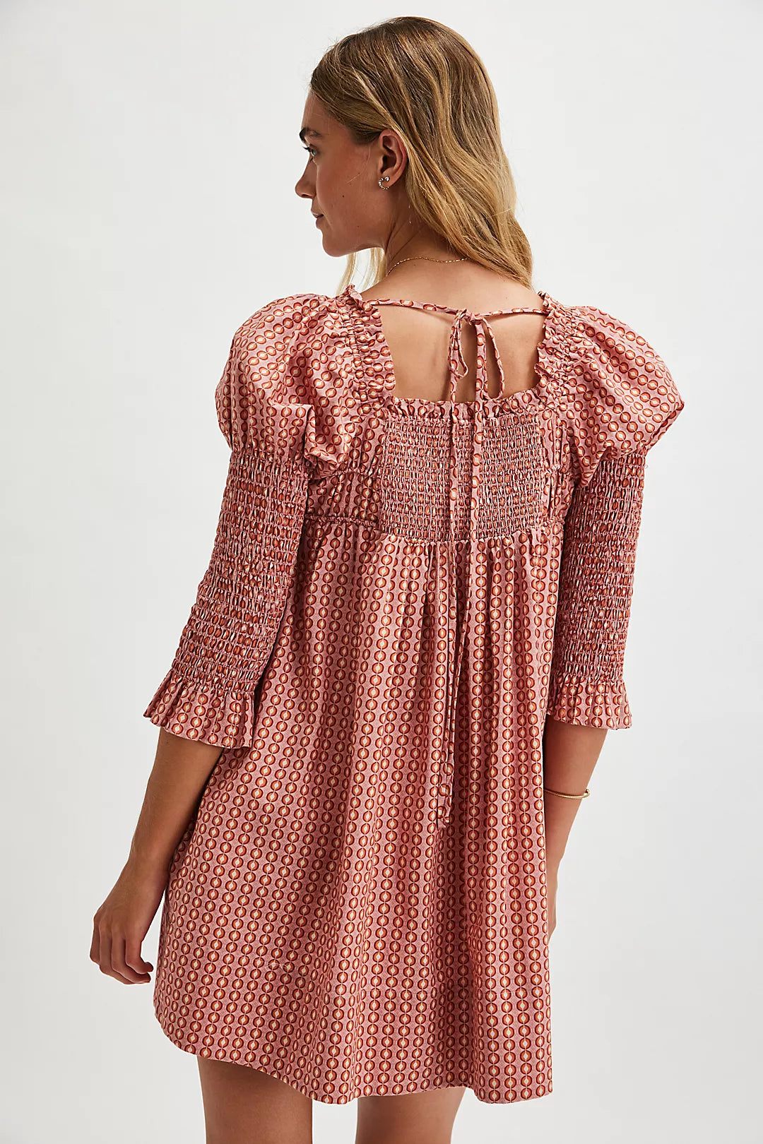So simple in a swingy silhouette, this mini features a printed cotton fabrication and shapeless silhouette with gathered detail at the bust and playful puffy sleeves.