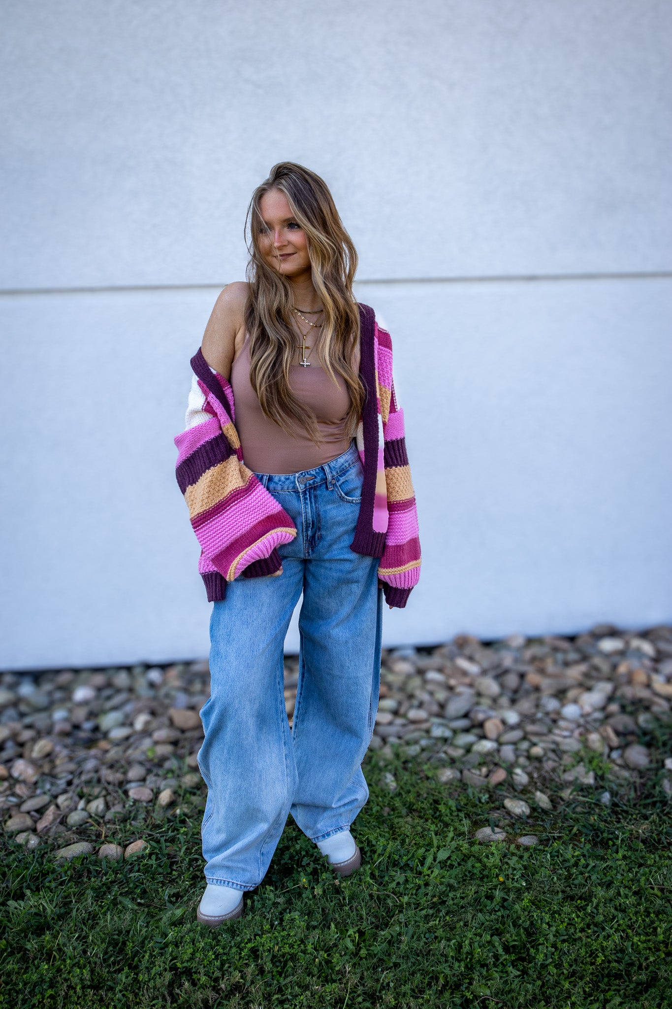 Elevate your wardrobe with the Golden Cranberry Stripe Cardigan, featuring a cozy knit fabric in an elegant blend of ivory, pink, gold, and maroon stripes. The chunky balloon sleeves add a trendy, voluminous touch while providing warmth and comfort. Perfect for layering, this cardigan combines timeless style with modern flair to keep you chic through every season.