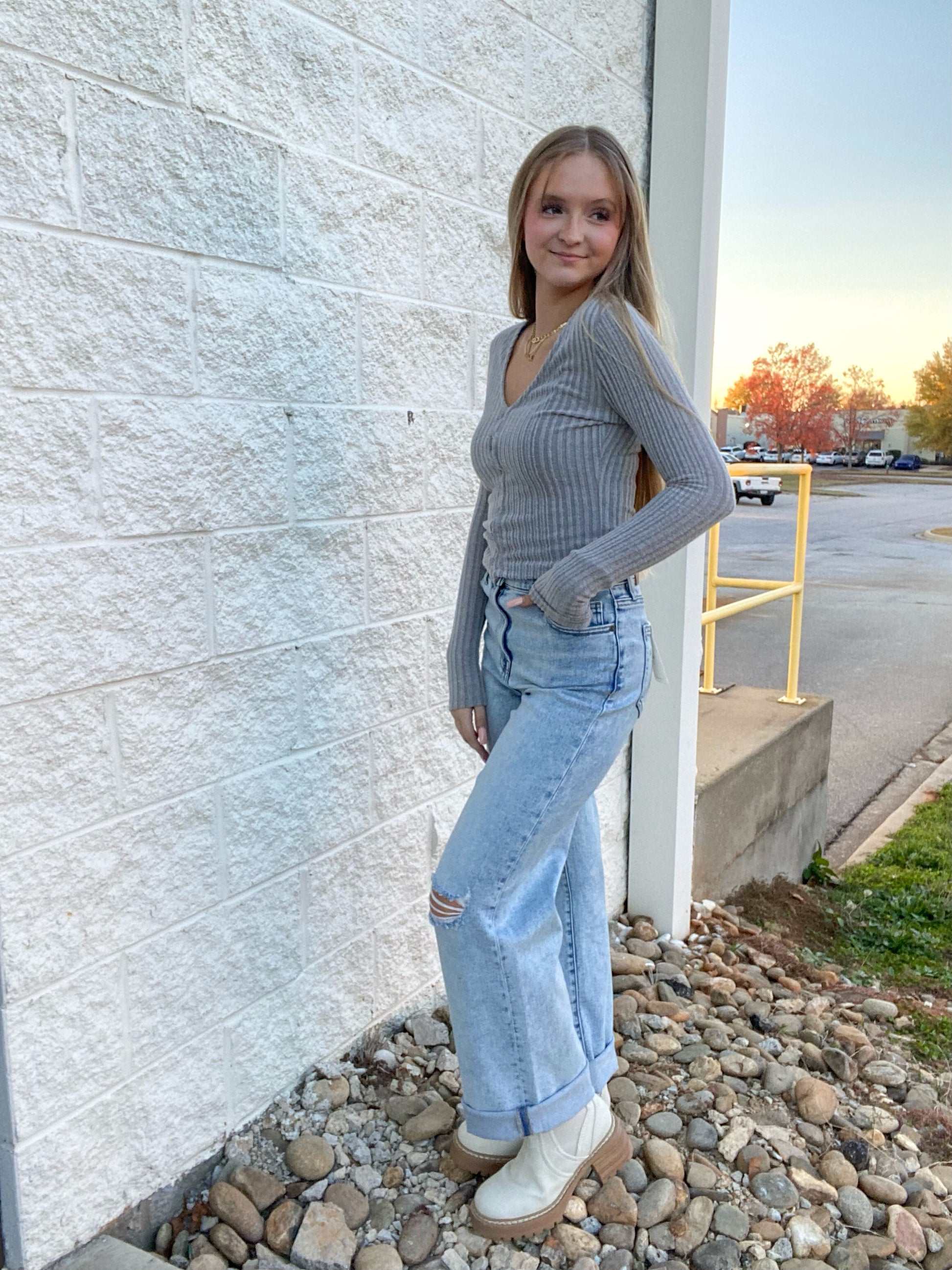 Embrace the cozy comfort of the Grey Day Dream Long Sleeve Top. Made with a ribbed material, this long sleeve top is perfect for chilly days. Its heather grey color and v-neck design add a touch of style, while the front button details elevate its look. Stay warm and stylish with this must-have piece!