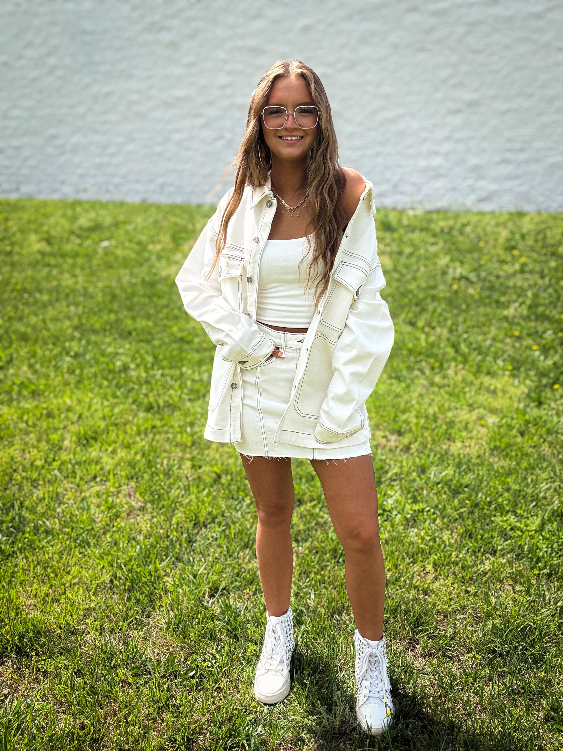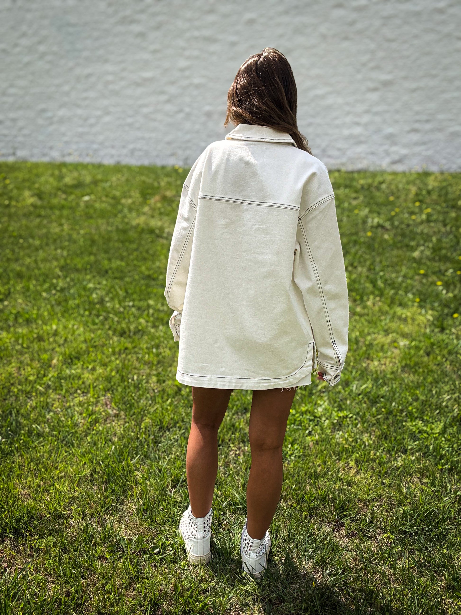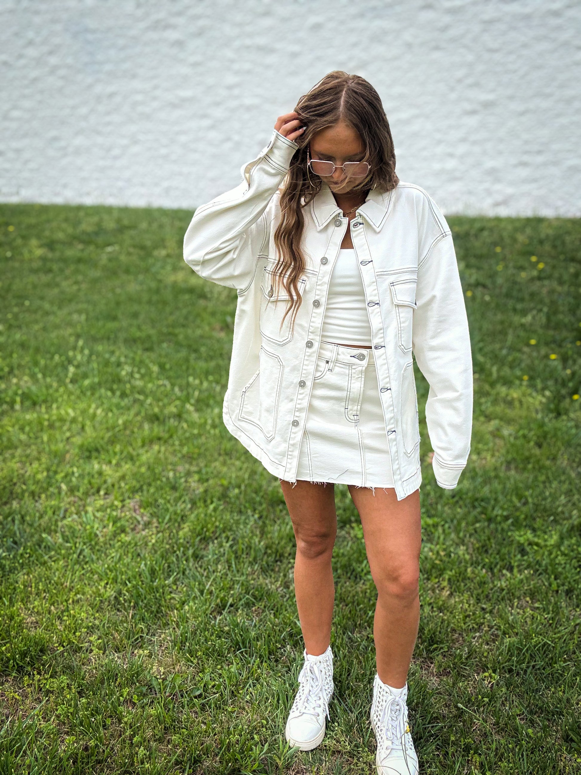 Our Pearl Wash Oversized Shacket is designed in a playful oversized fit. It features a pearl off white color with contrast trim stitching, long sleeves, and a collared neckline. Made from a super soft fabric, this shacket features an and an oversized fit for a laid-back look. Plus, the front pocket detailing adds a touch of practicality and edge to this must-have piece. The drop shoulders and chest pockets give it a statement piece feel. Complete with cuffed sleeves, this shacket can be worn as a layered or statement piece. Pair with our Peyton High Rise Denim Mini Skirt in Pearl to complete the look!