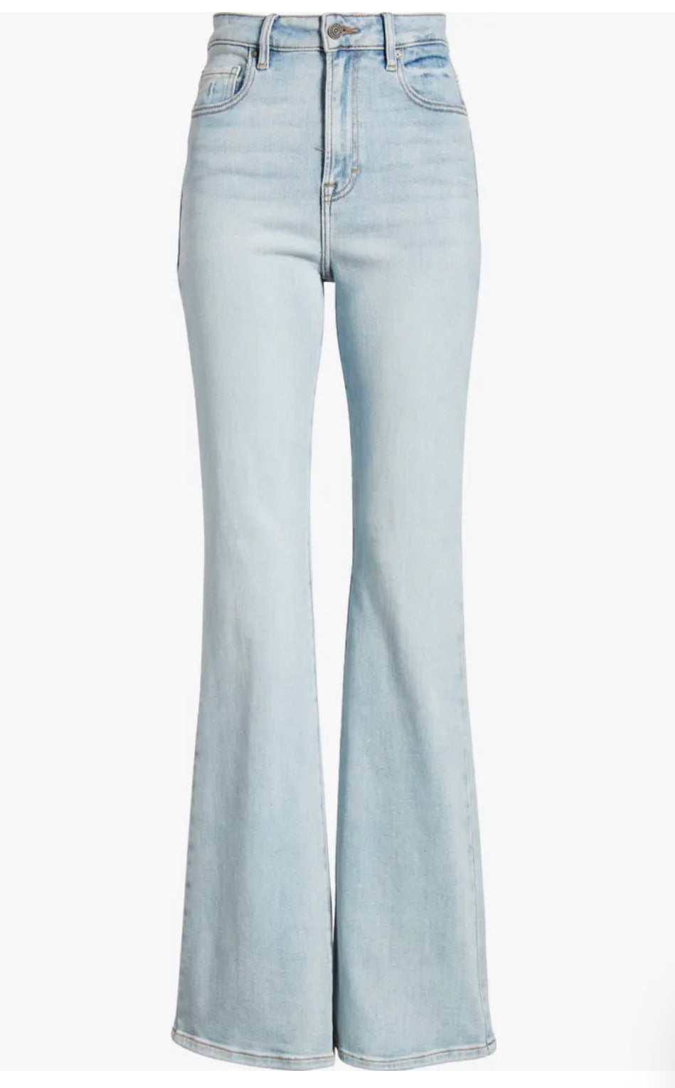 Cleanly styled for a casual-chic look, these light-wash flare jeans are made from stretchy denim with a high waist and full-length legs.