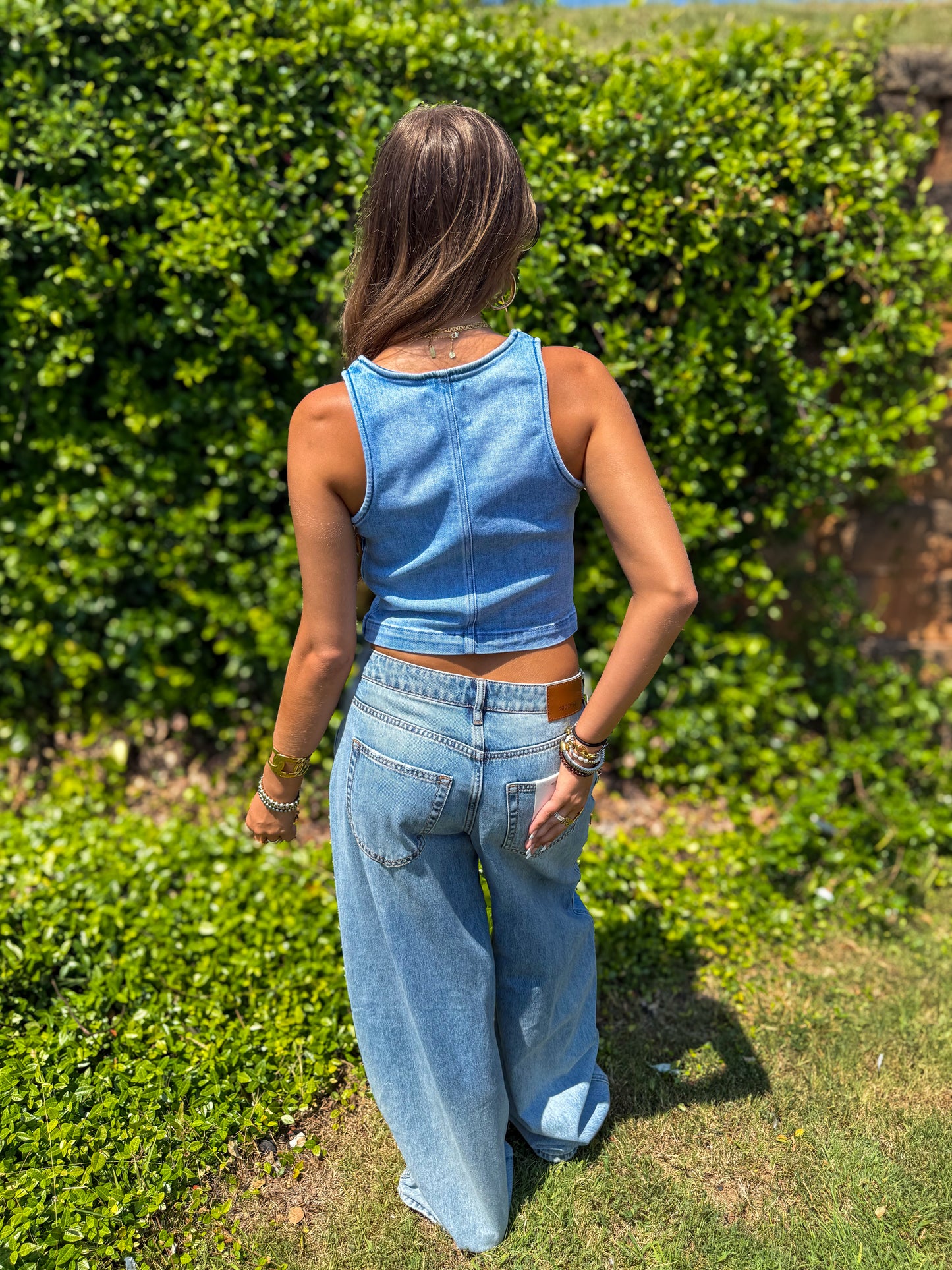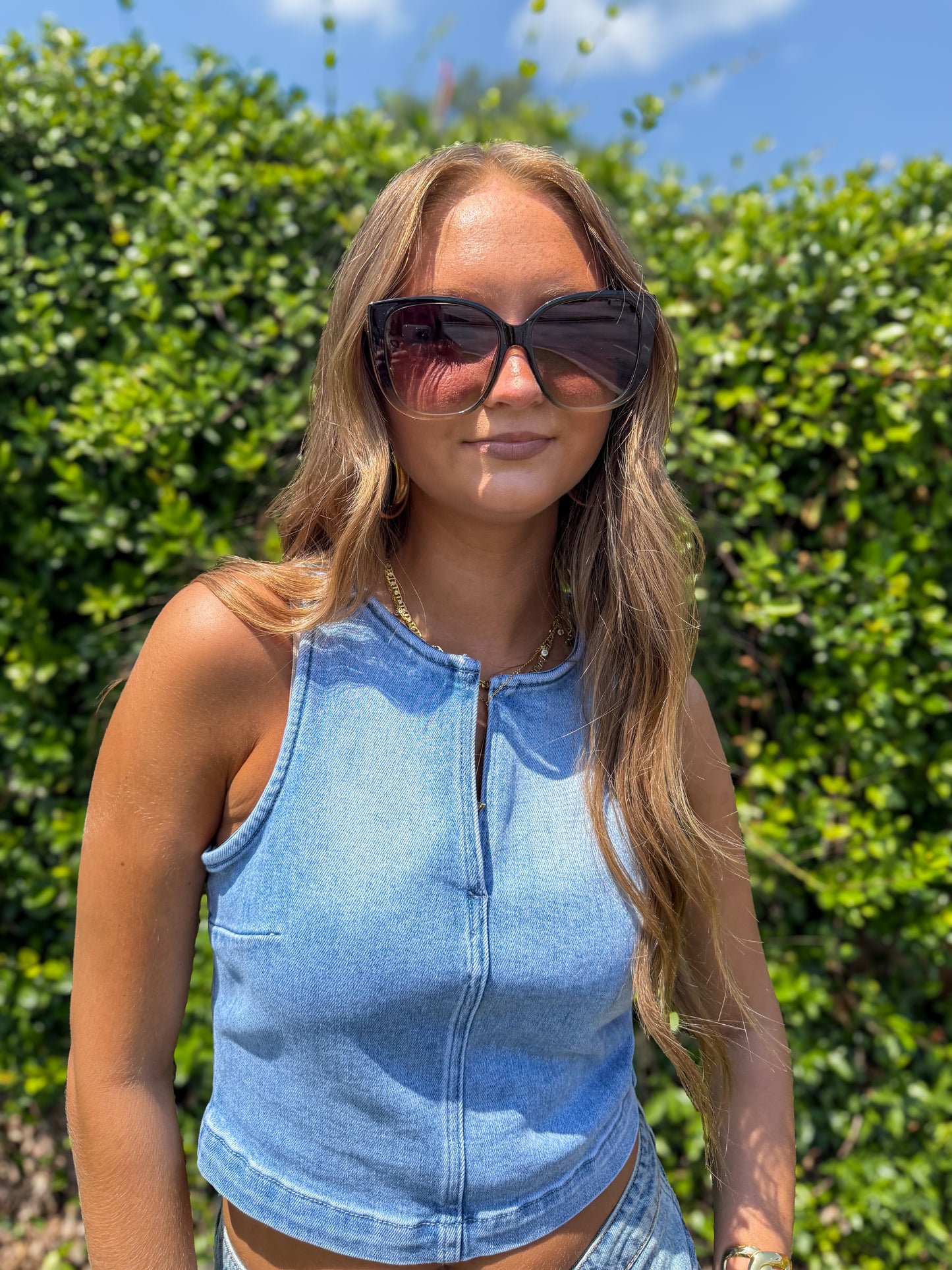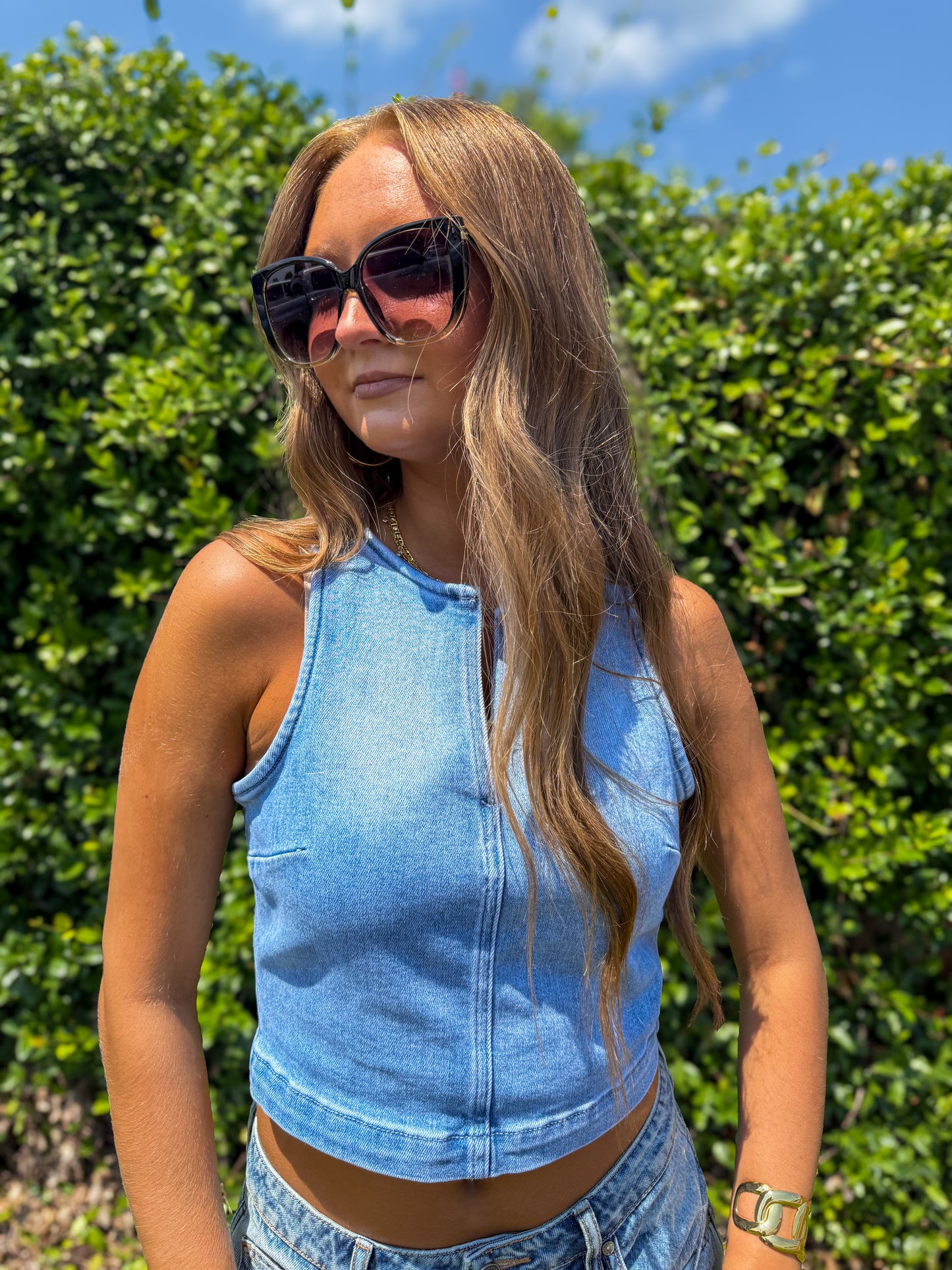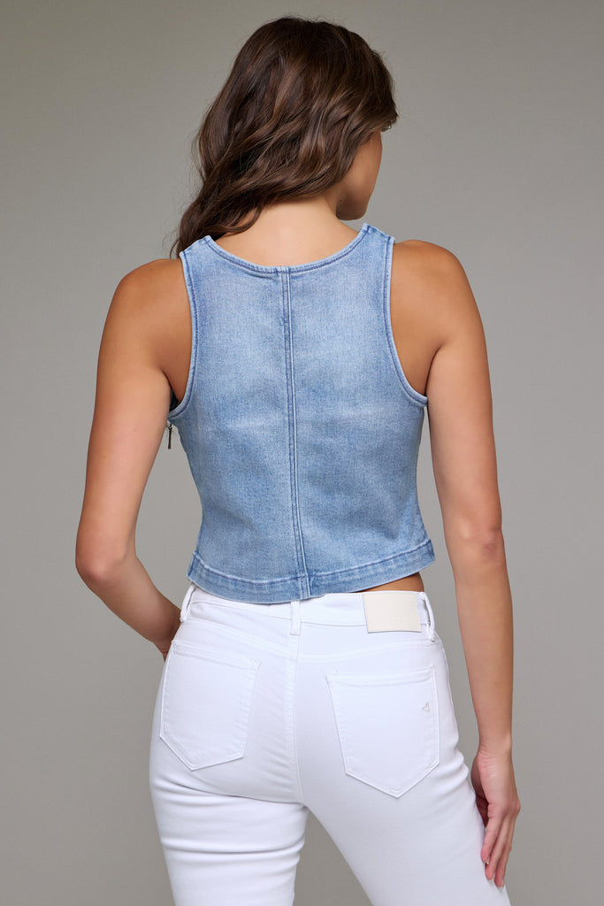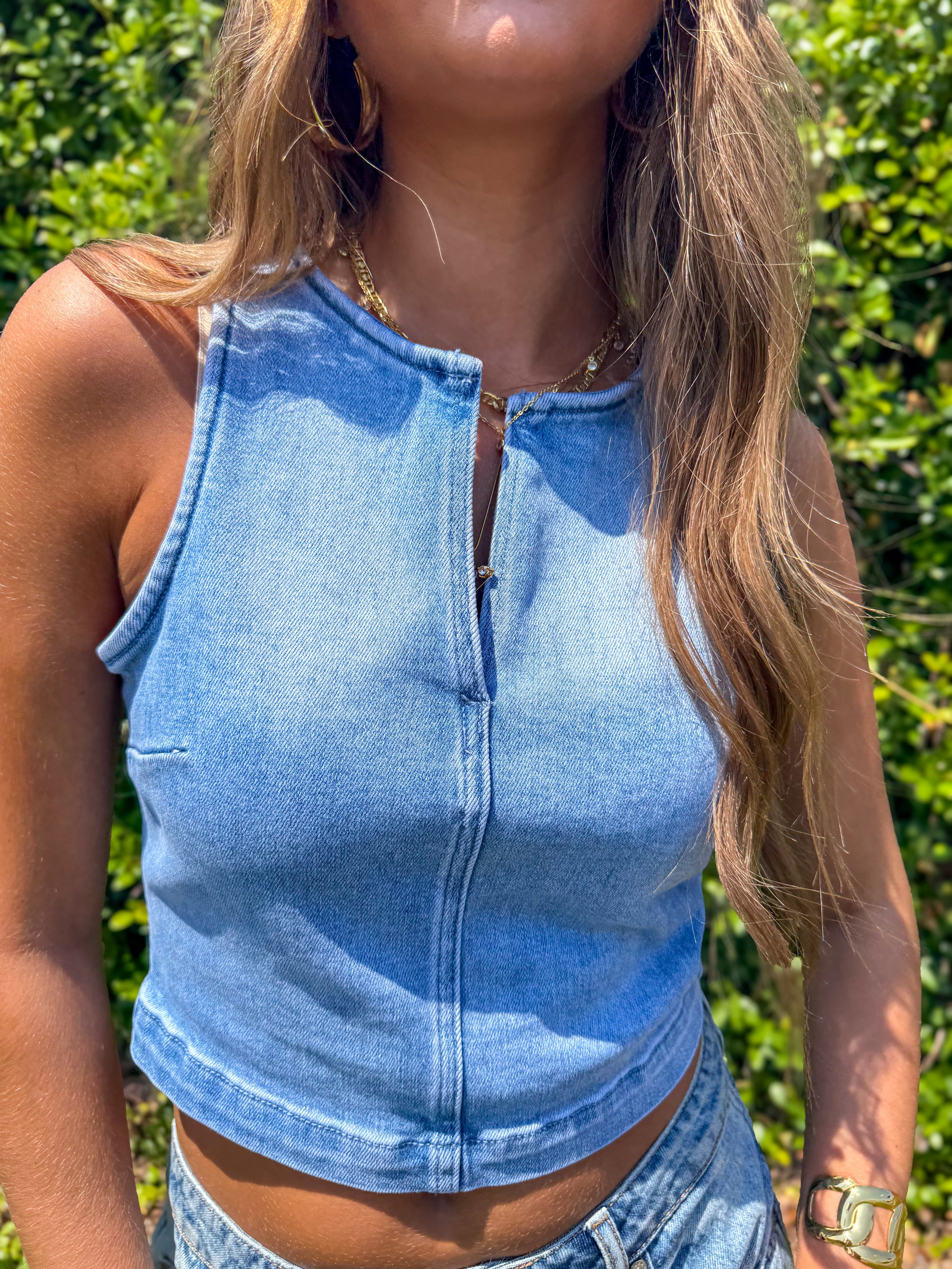 Hidden - Light Wash Crew Neck Denim Stretch Tank Top