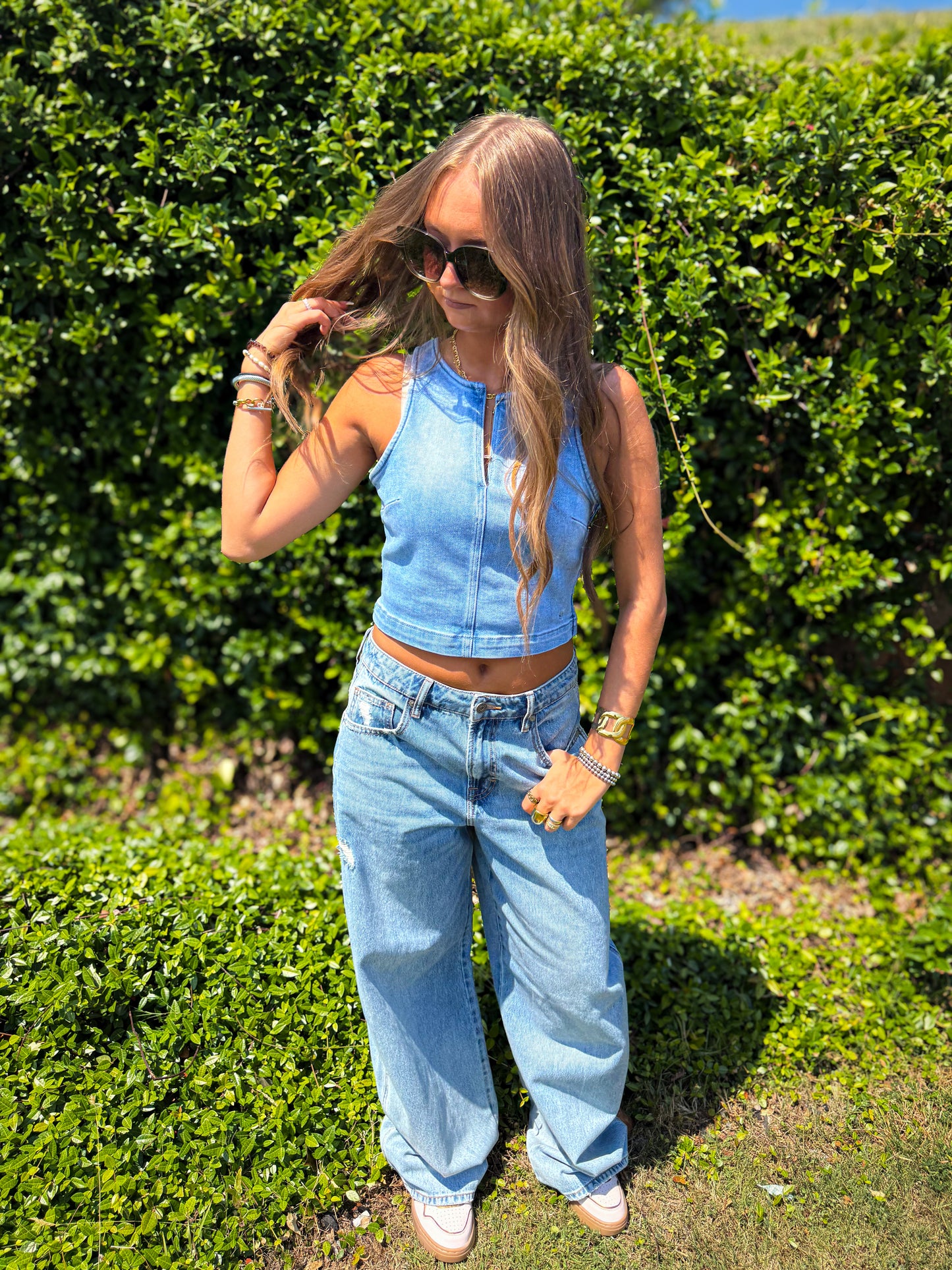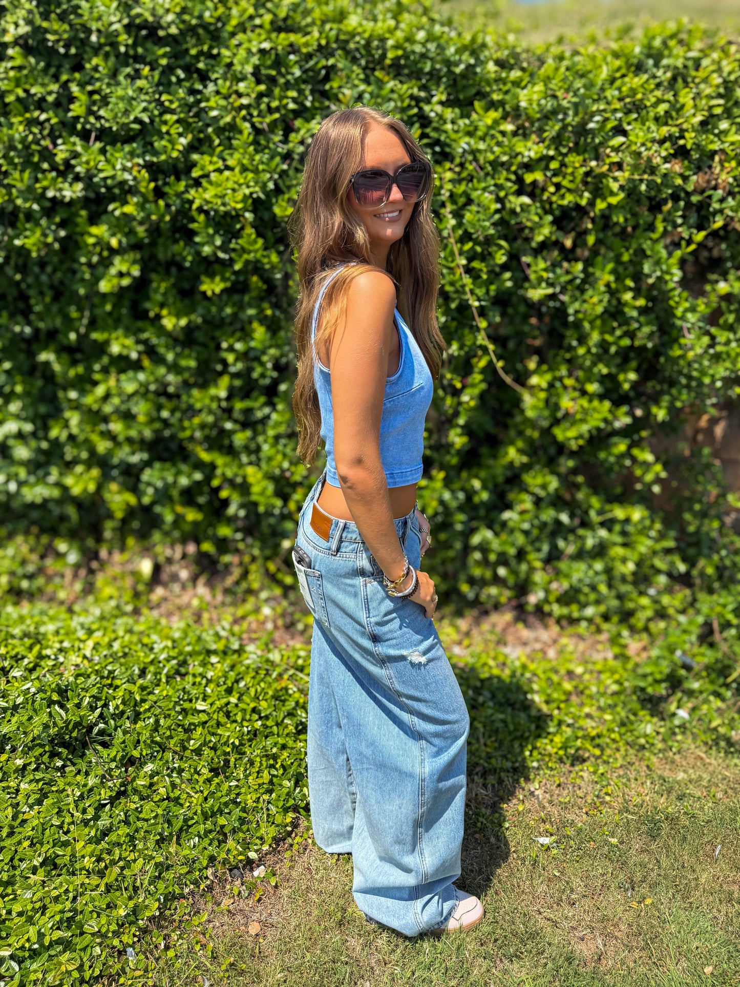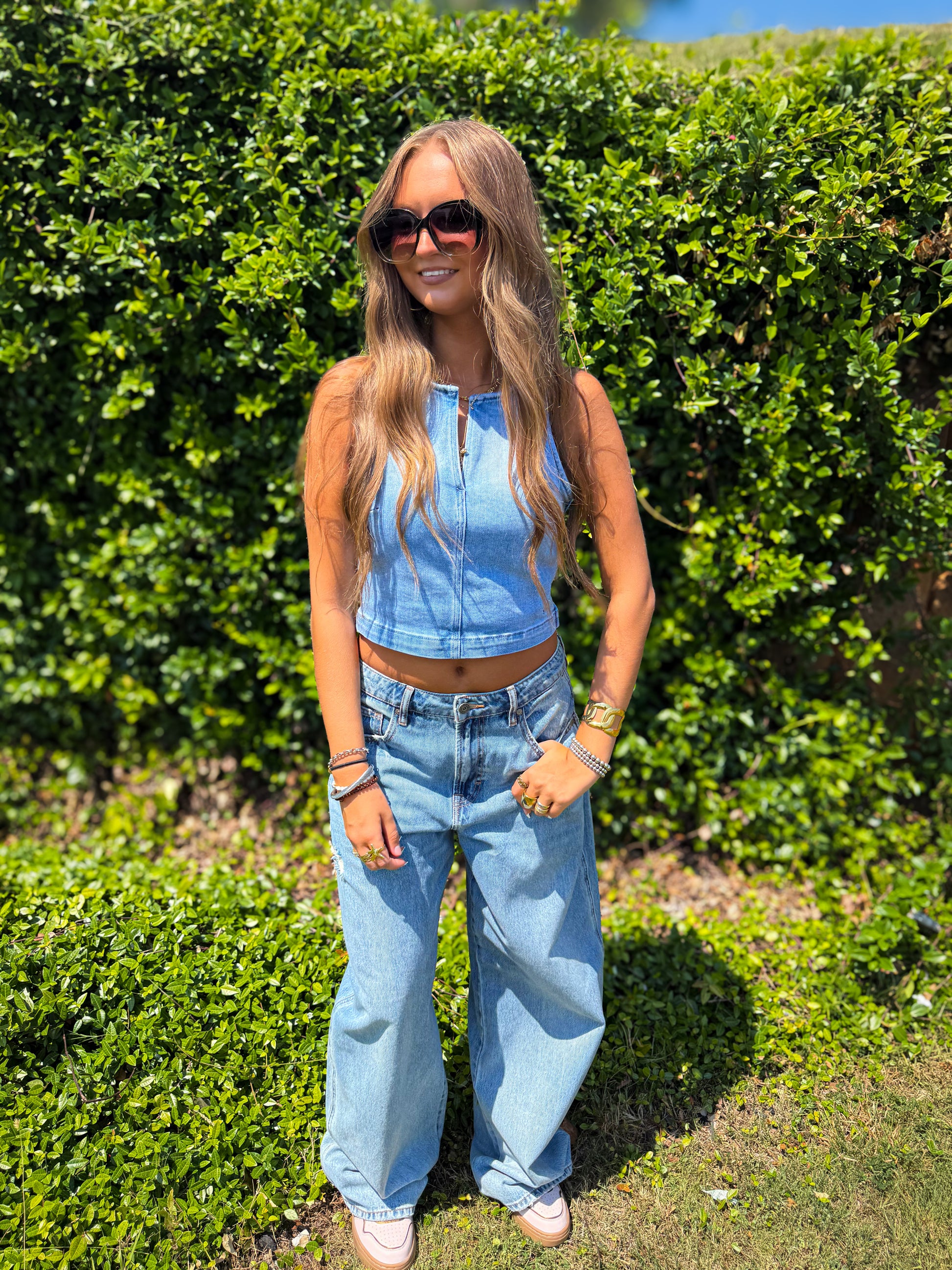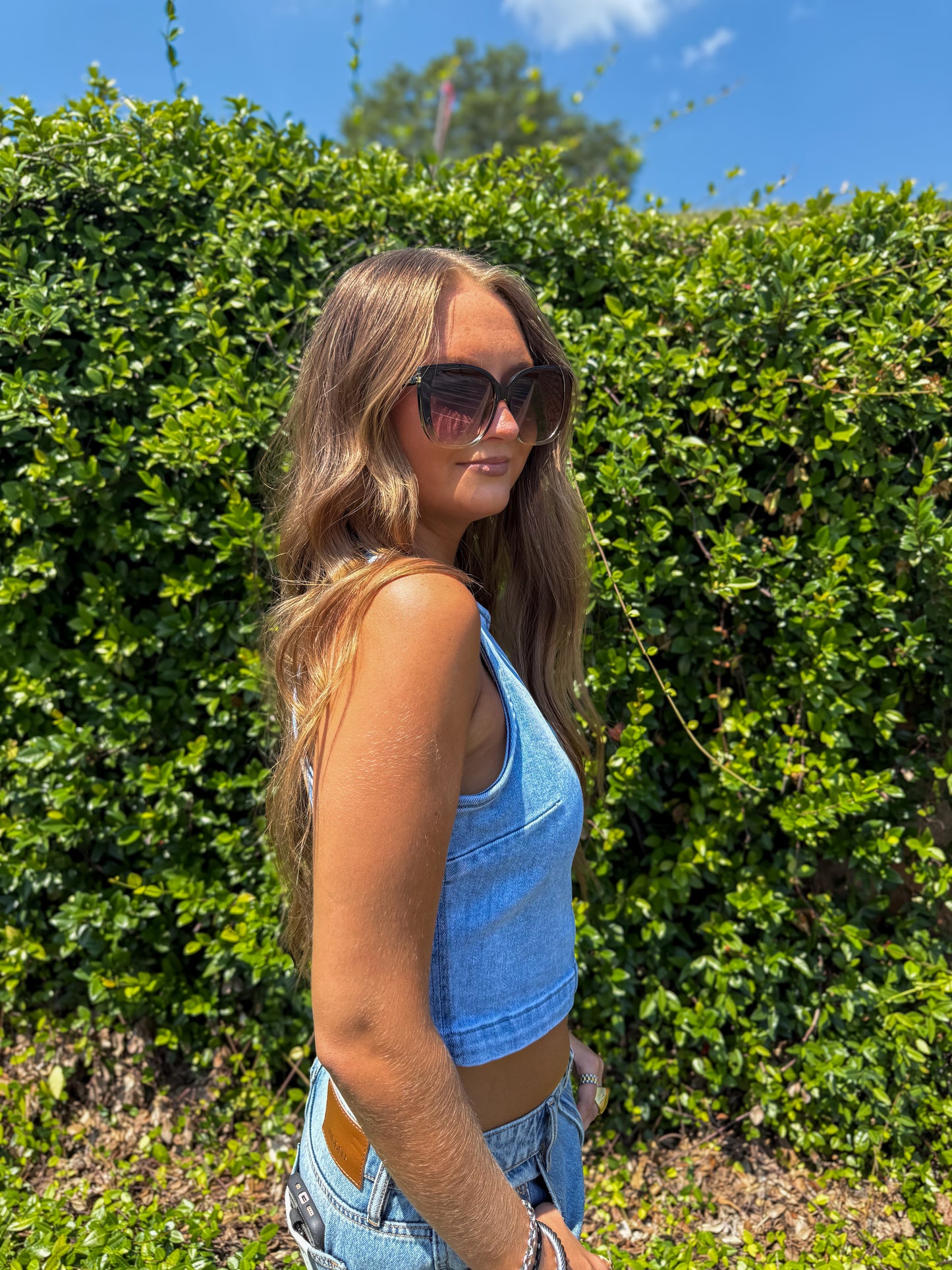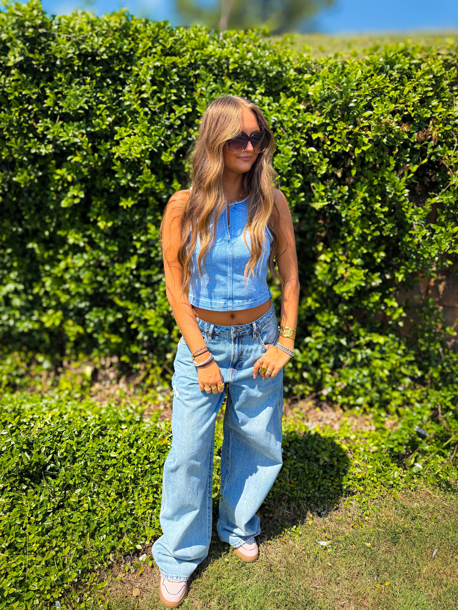 Hidden - Light Wash Crew Neck Denim Stretch Tank Top