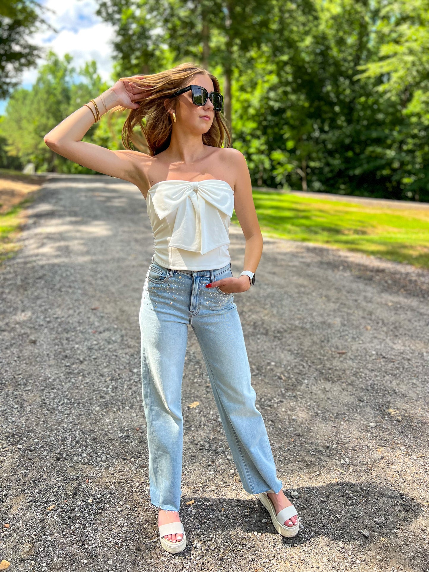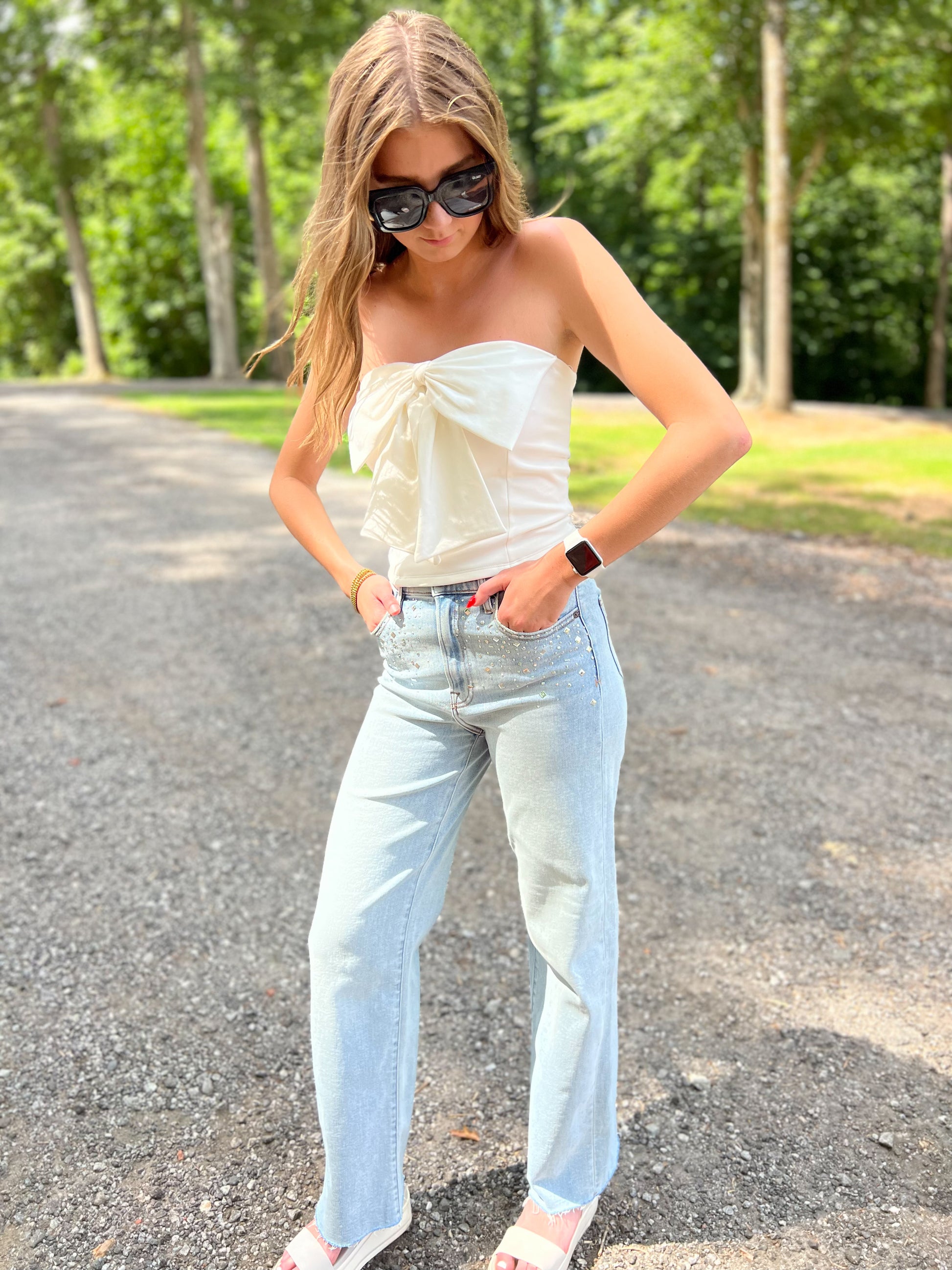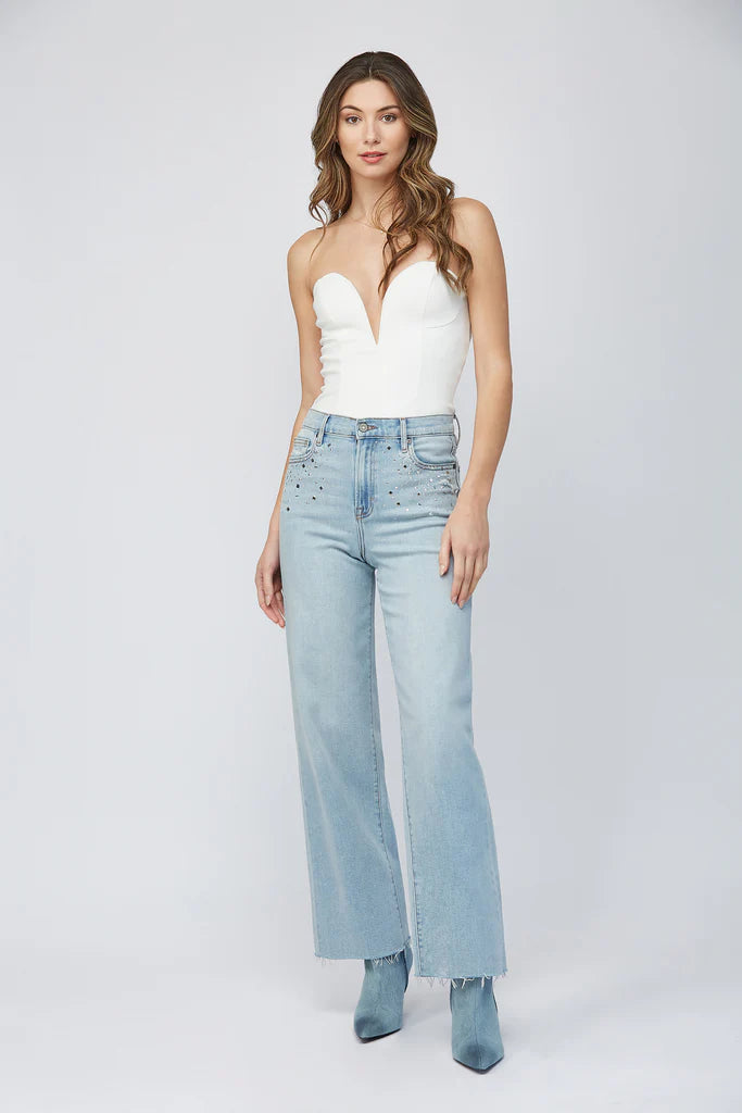 YOUR FAVORITE LOGAN DAD JEANS NOW COME WITH A LITTLE SPARKLE. THIS RHINESTONE STUDDED STYLE FEATURES OUR BEST-SELLING STRETCH FABRIC AND ELEGANT WIDE-LEG FIT.