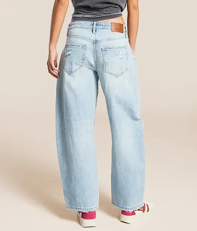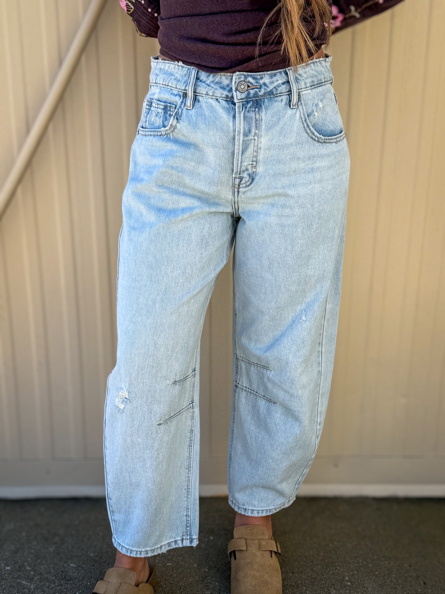 Elevate your denim collection with our Hidden - SAMMIE Barrel Jean. This light wash jean features subtle distressing for a touch of edge, while the barrel fit offers a flattering silhouette. Upgrade your style game with these on-trend jeans!
