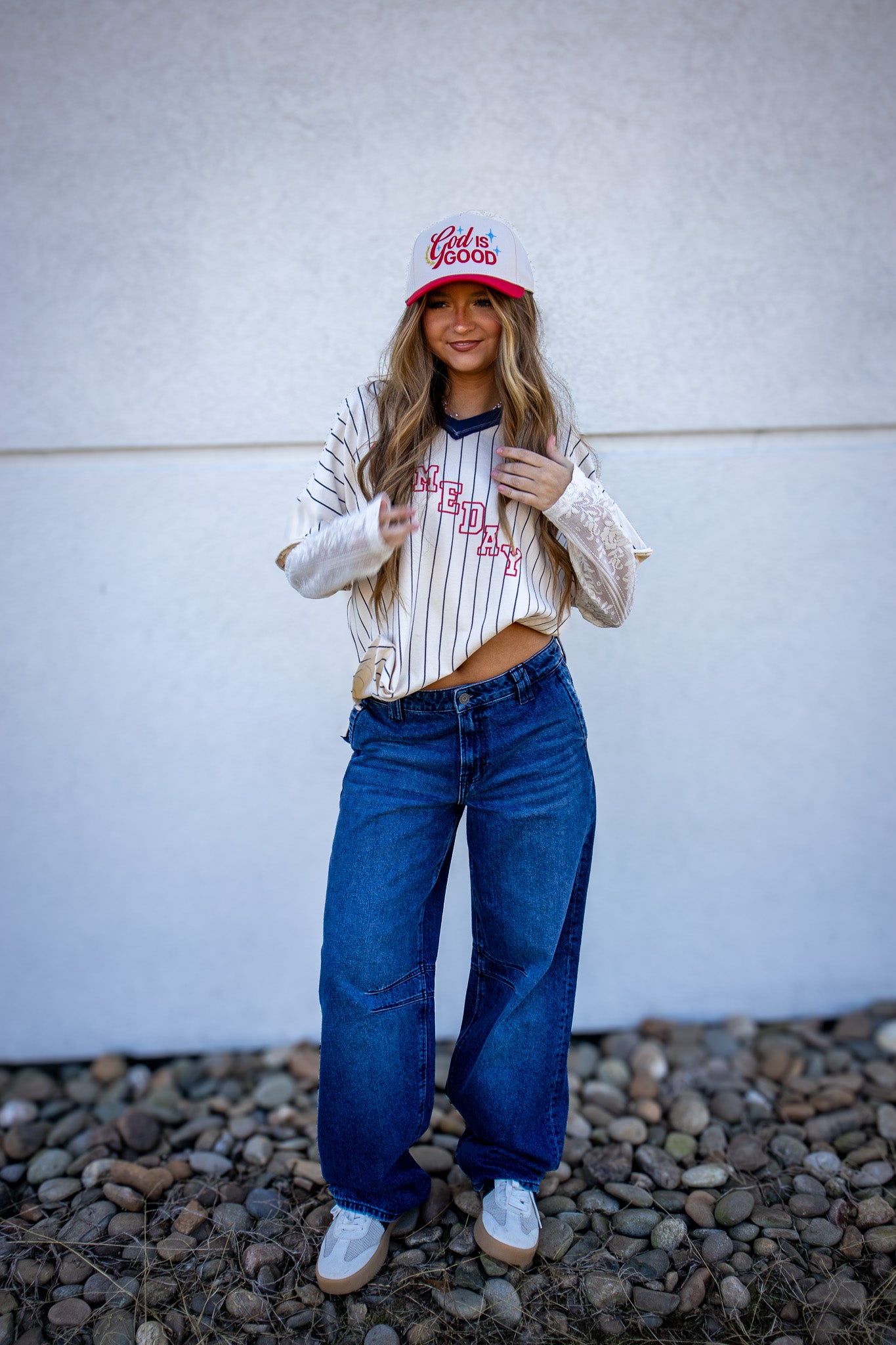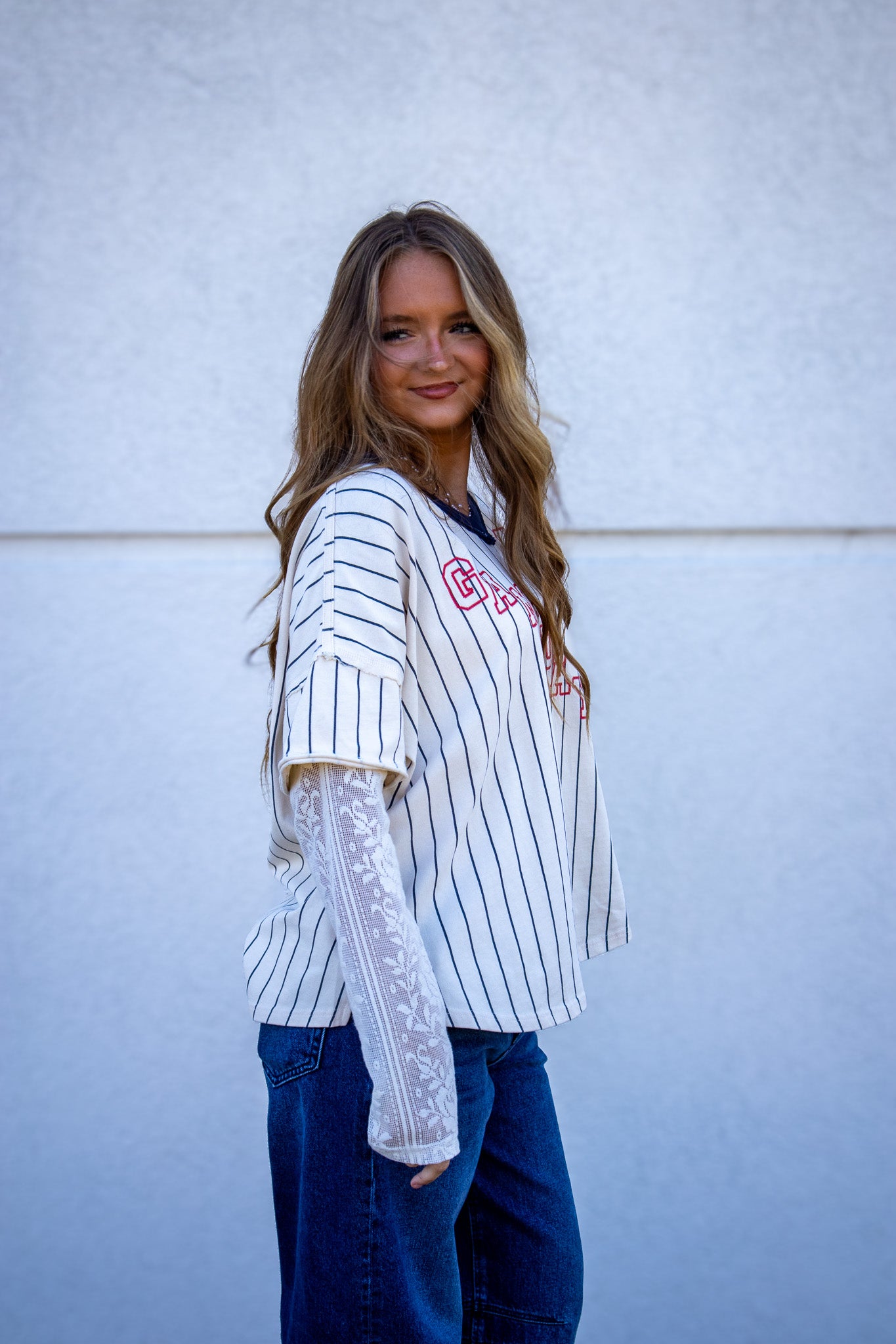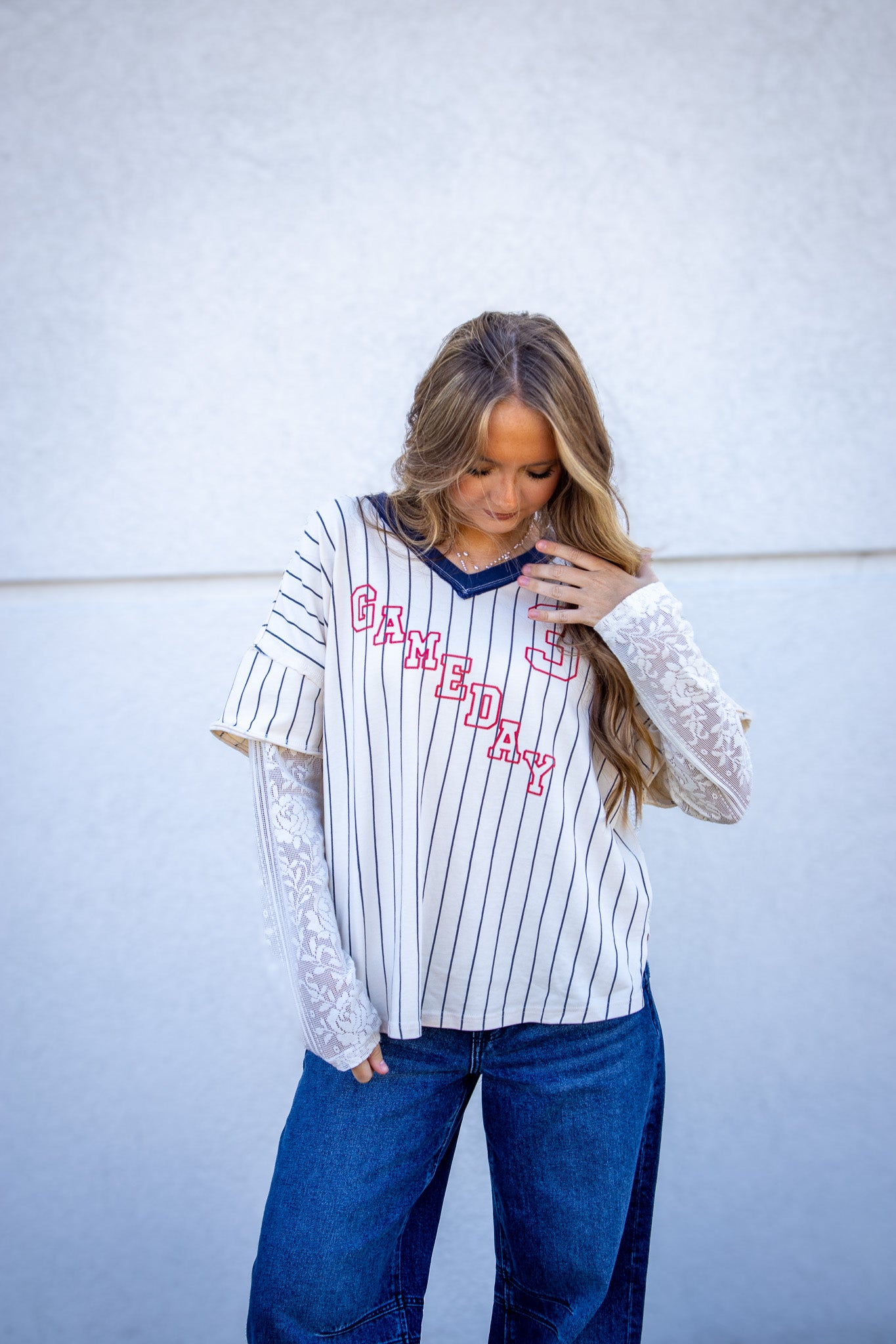 Game day just got a style upgrade. This varsity-inspired top combines classic athletic vibes with feminine flair—featuring a bold gameday graphic, crisp varsity stripes, and a flattering V-neckline. Layered lace long sleeves add an elegant touch that takes you seamlessly from the stands to dinner. Perfect for showing your team spirit with undeniable sophistication.