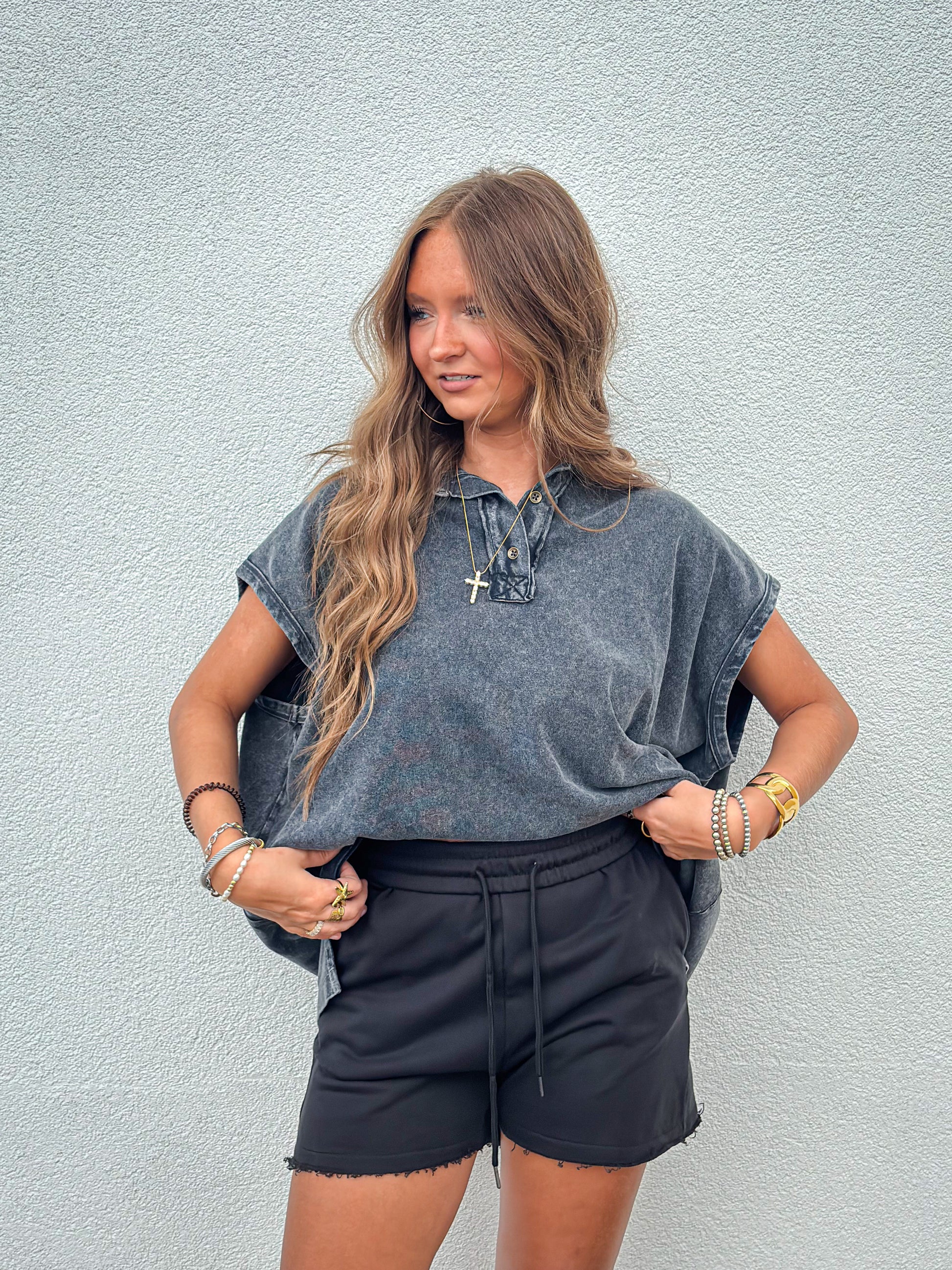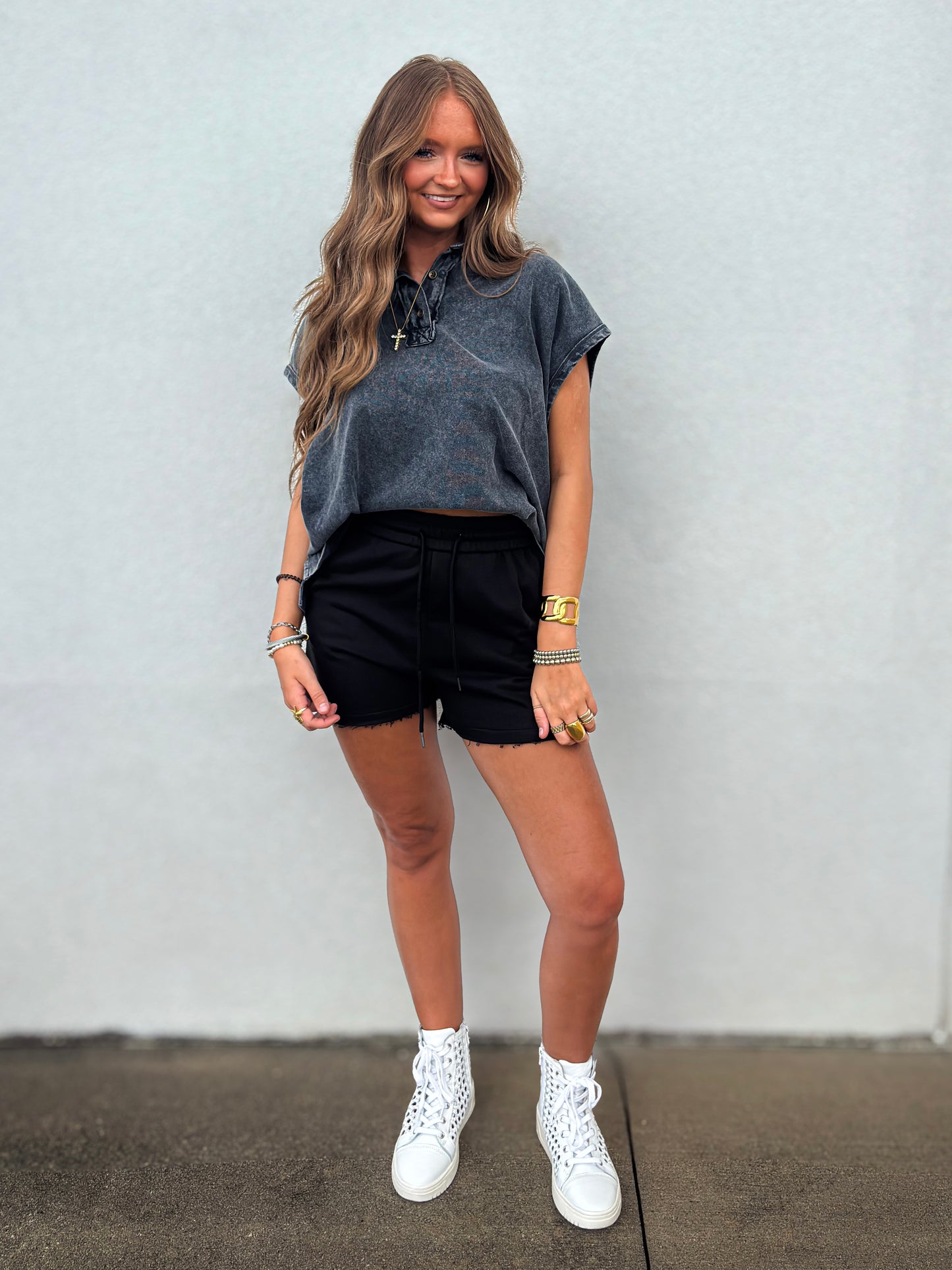 Experience ultimate comfort and style with our Lazy Day Sweat Shorts in black. Featuring an elastic waistband and adjustable drawstring, these mid length shorts are perfect for any casual day. With a raw hem and convenient pockets, you'll never want to take them off!