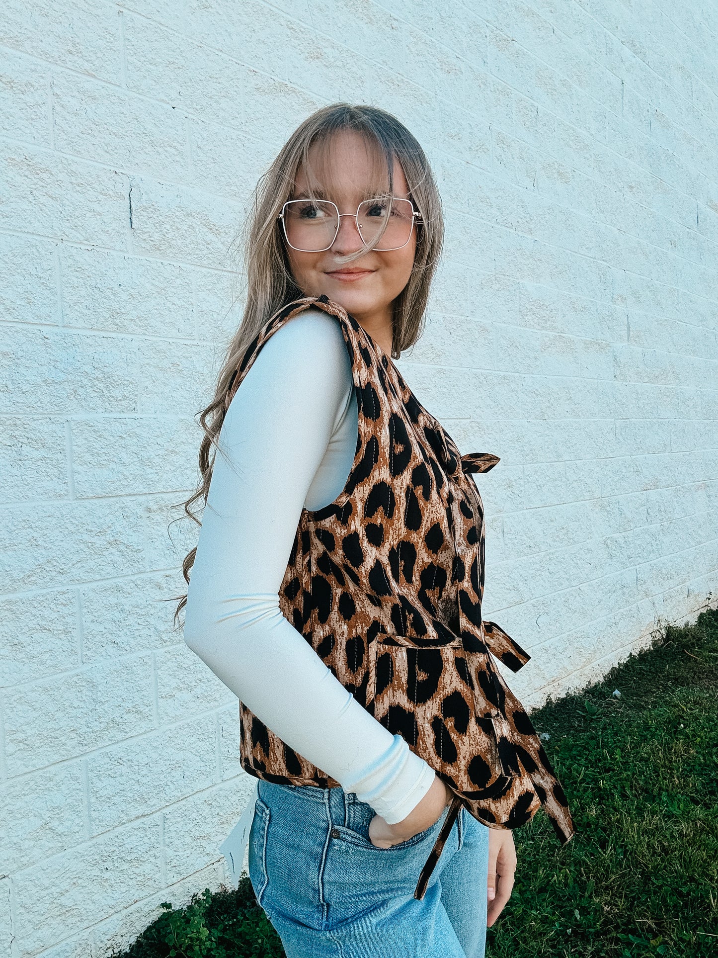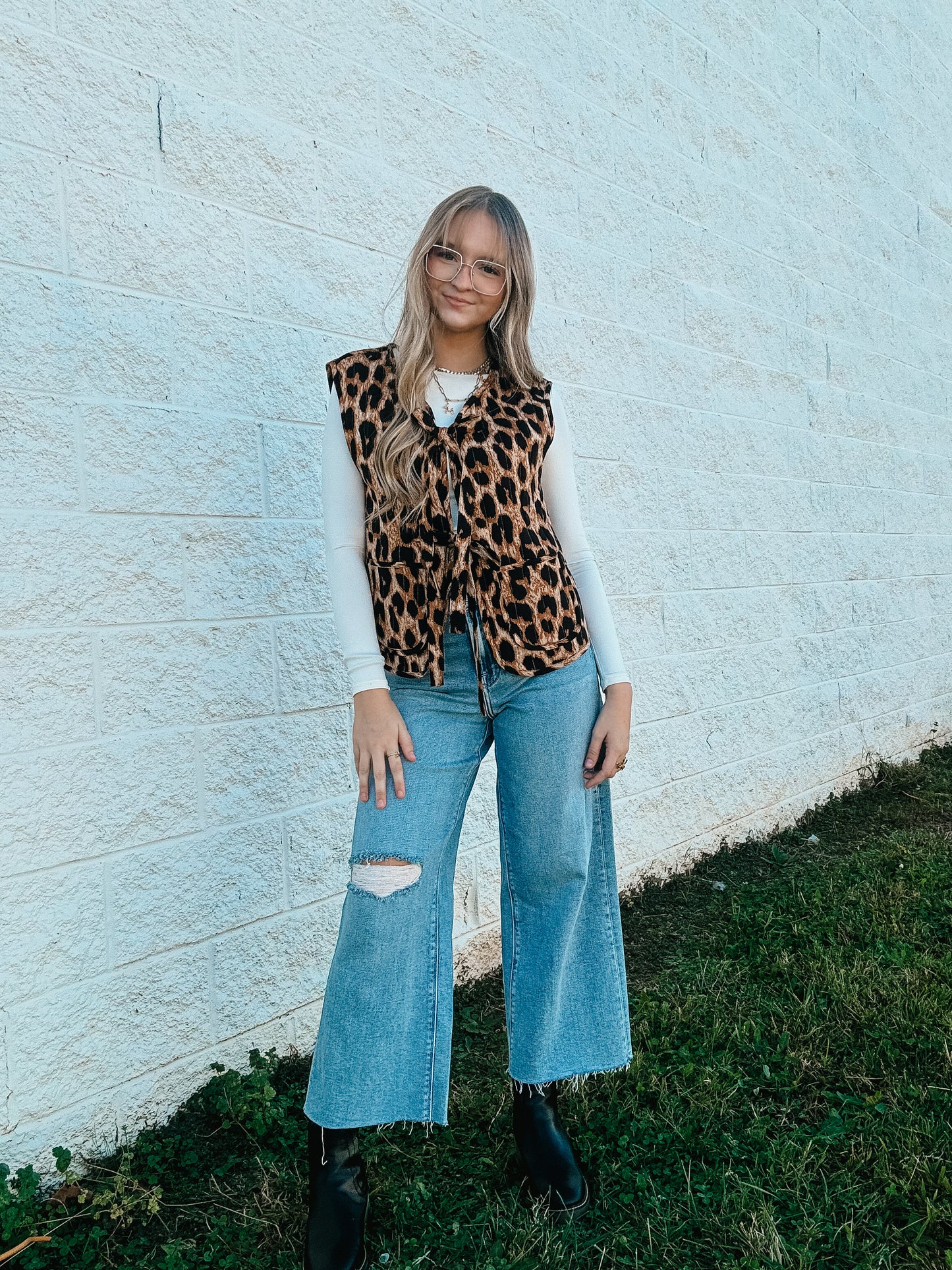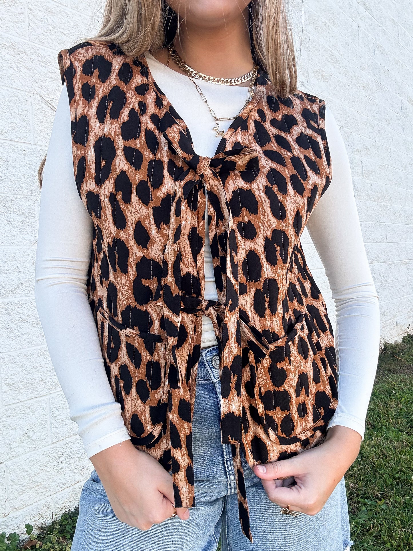 Introducing our Leopard Quilted Vest with Bow Ties! Make a statement with the bold and fierce leopard print. This vest features a relaxed fit and rounded-neckline with tie-front closures and round hemline. Stay warm and stylish with the added quilted design and convenient front tie closures. Stand out from the crowd and add a touch of glamour to any outfit.