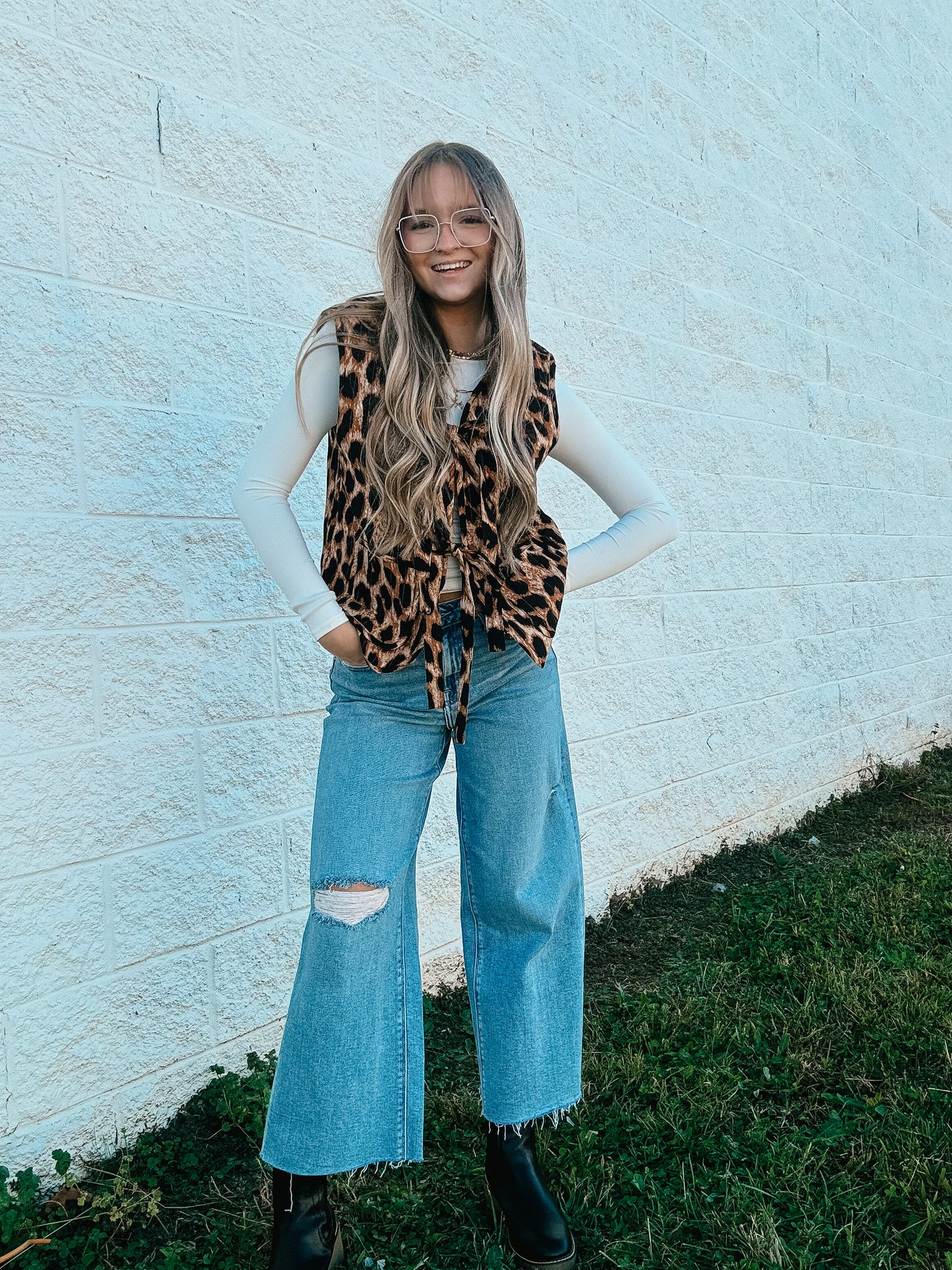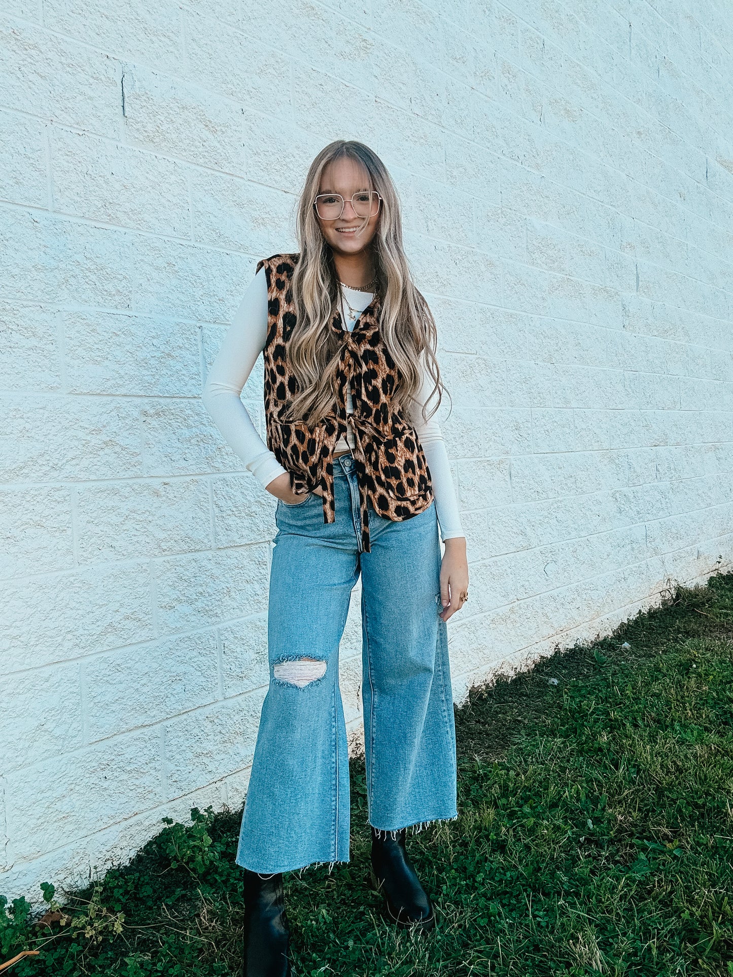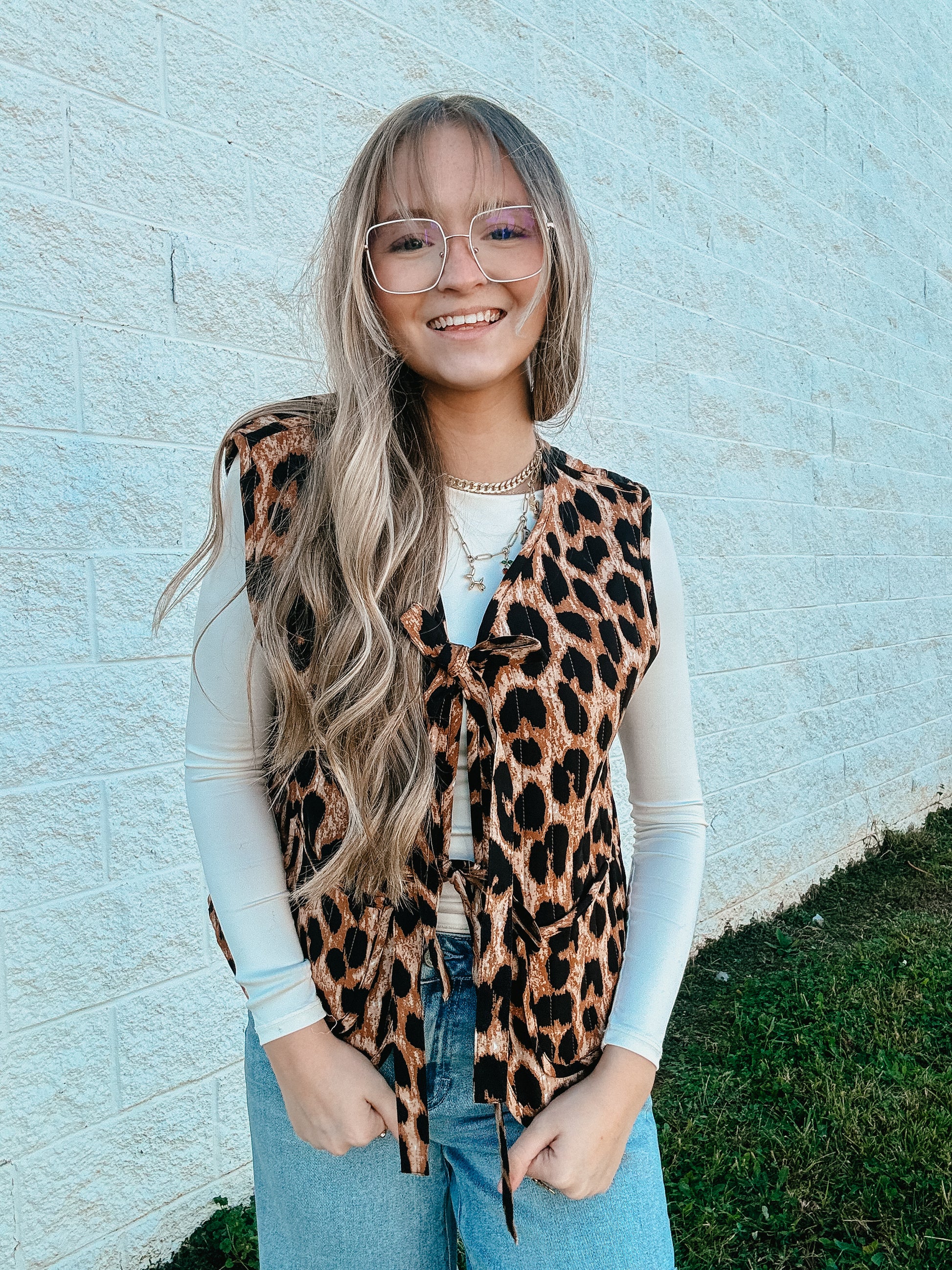 Introducing our Leopard Quilted Vest with Bow Ties! Make a statement with the bold and fierce leopard print. This vest features a relaxed fit and rounded-neckline with tie-front closures and round hemline. Stay warm and stylish with the added quilted design and convenient front tie closures. Stand out from the crowd and add a touch of glamour to any outfit.