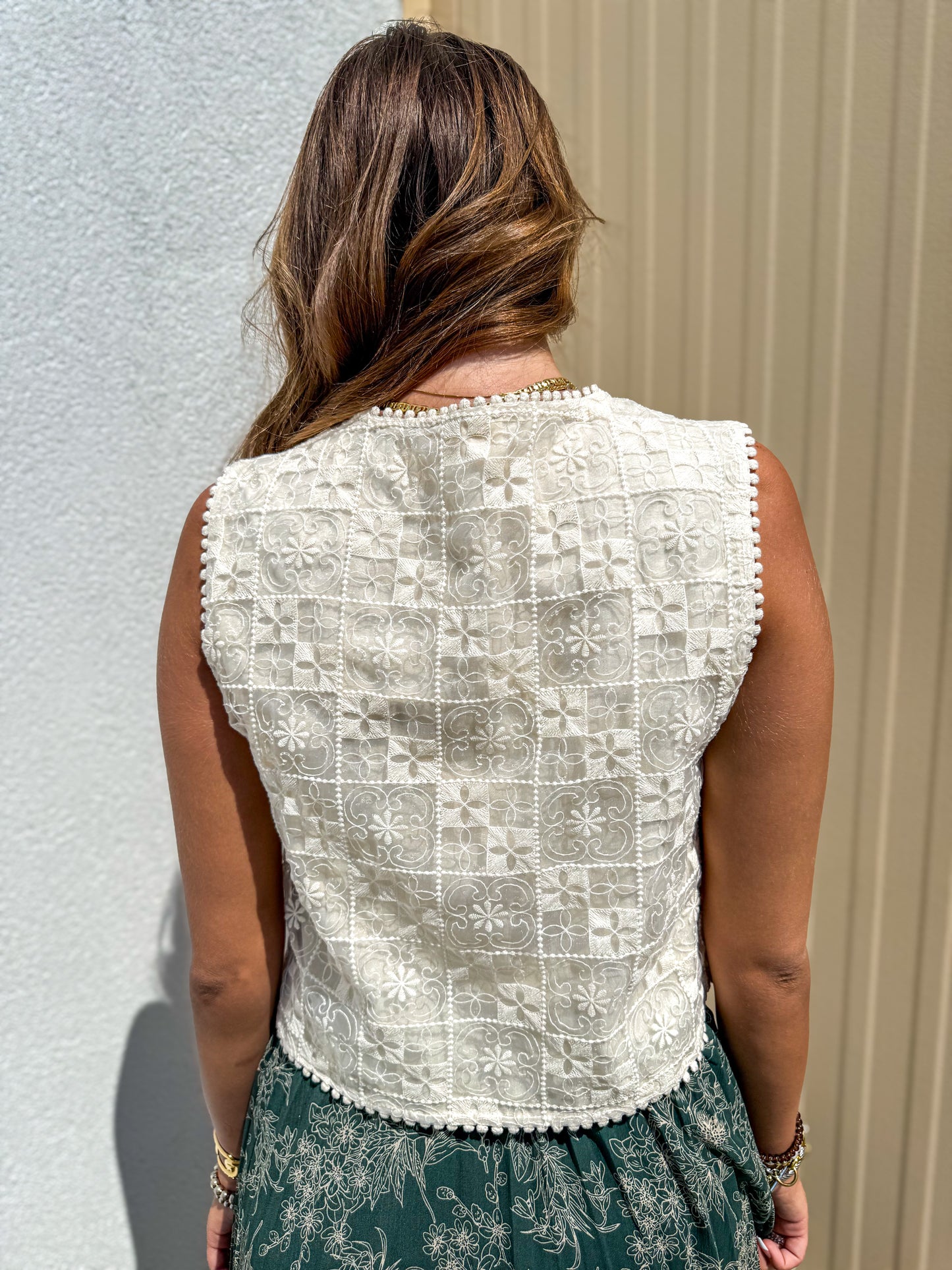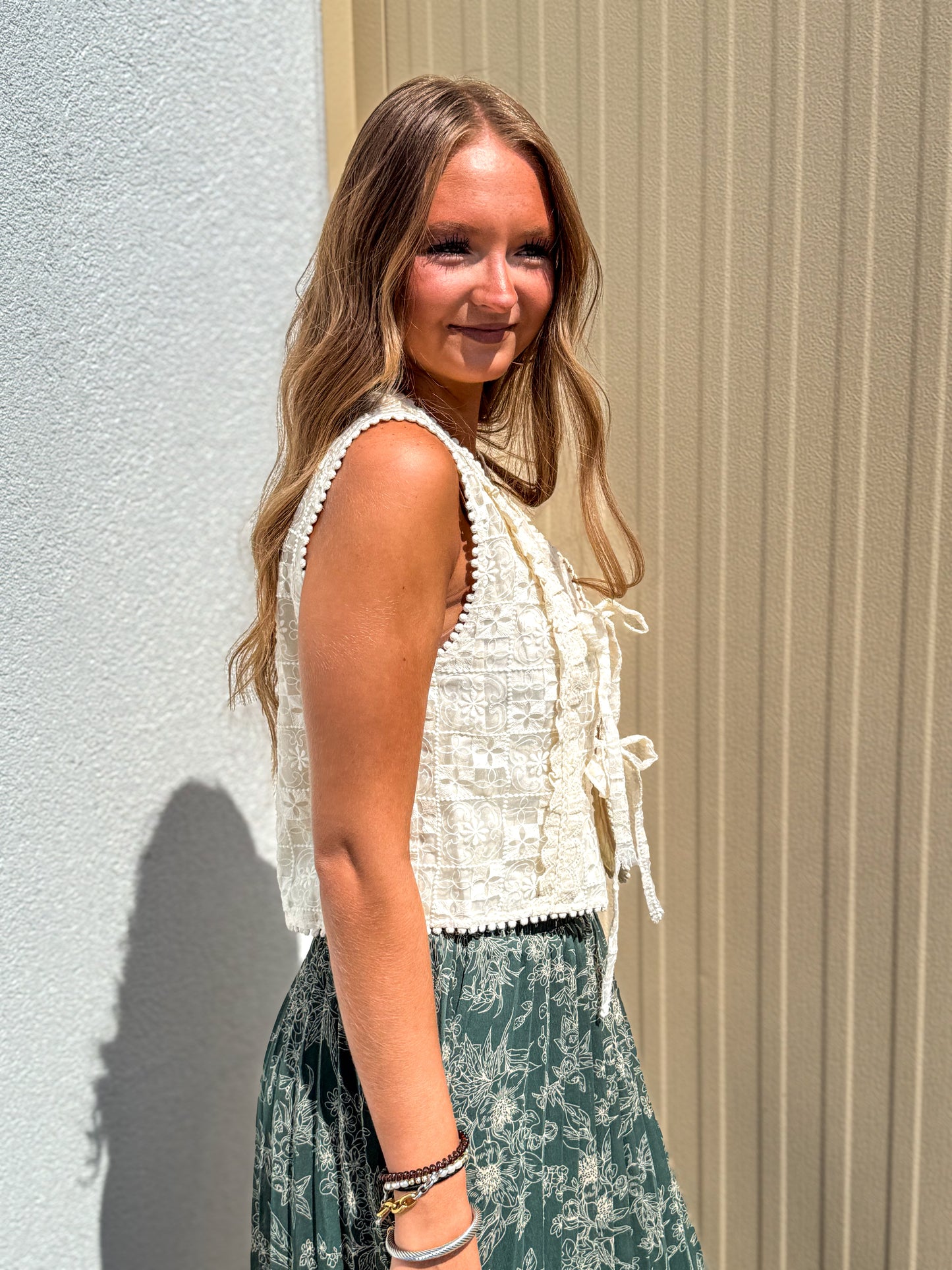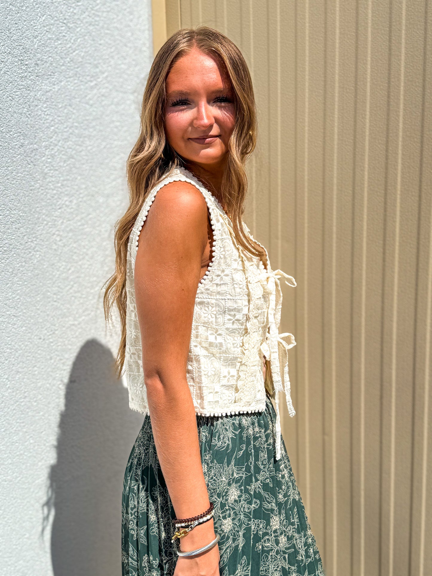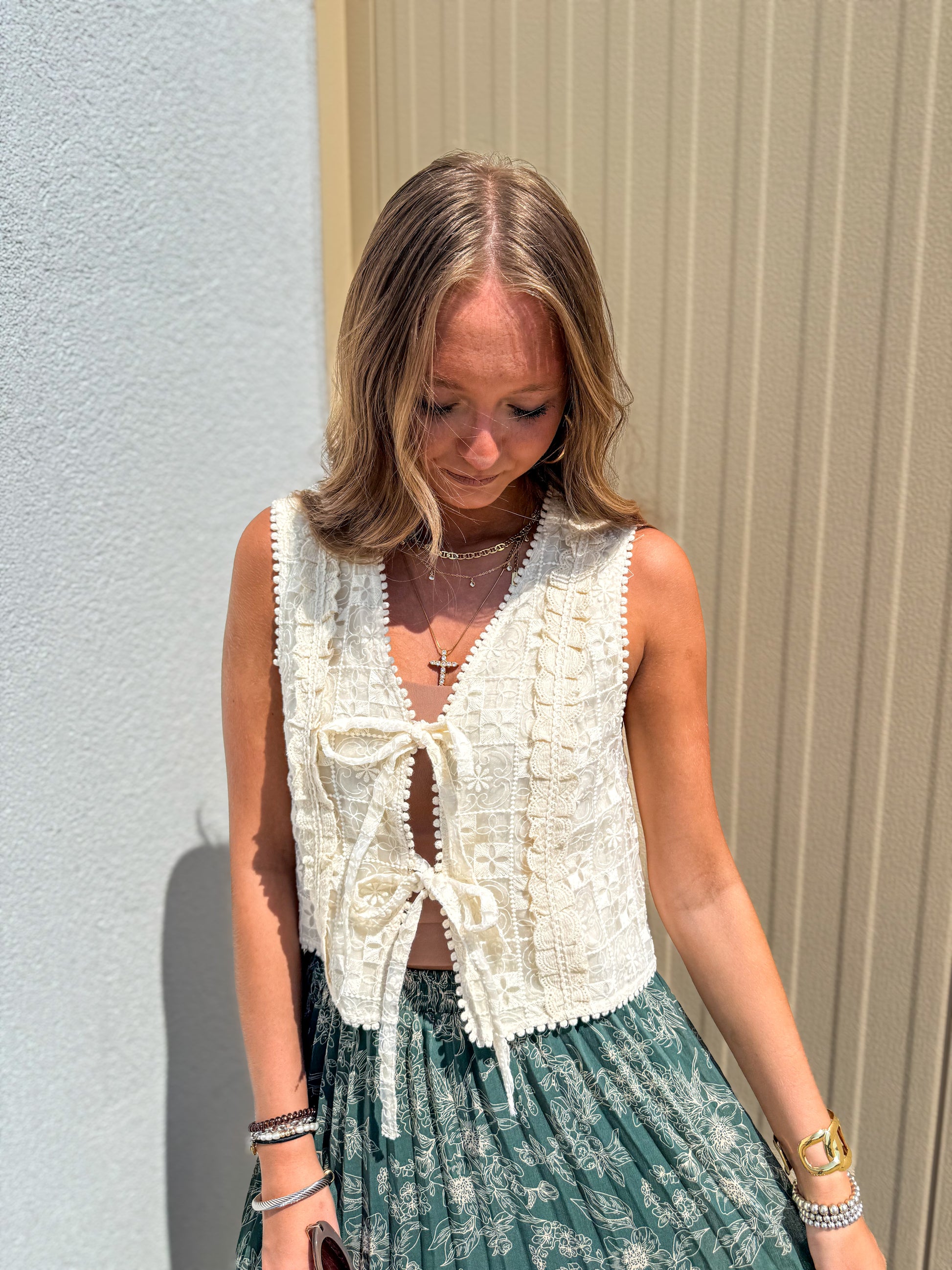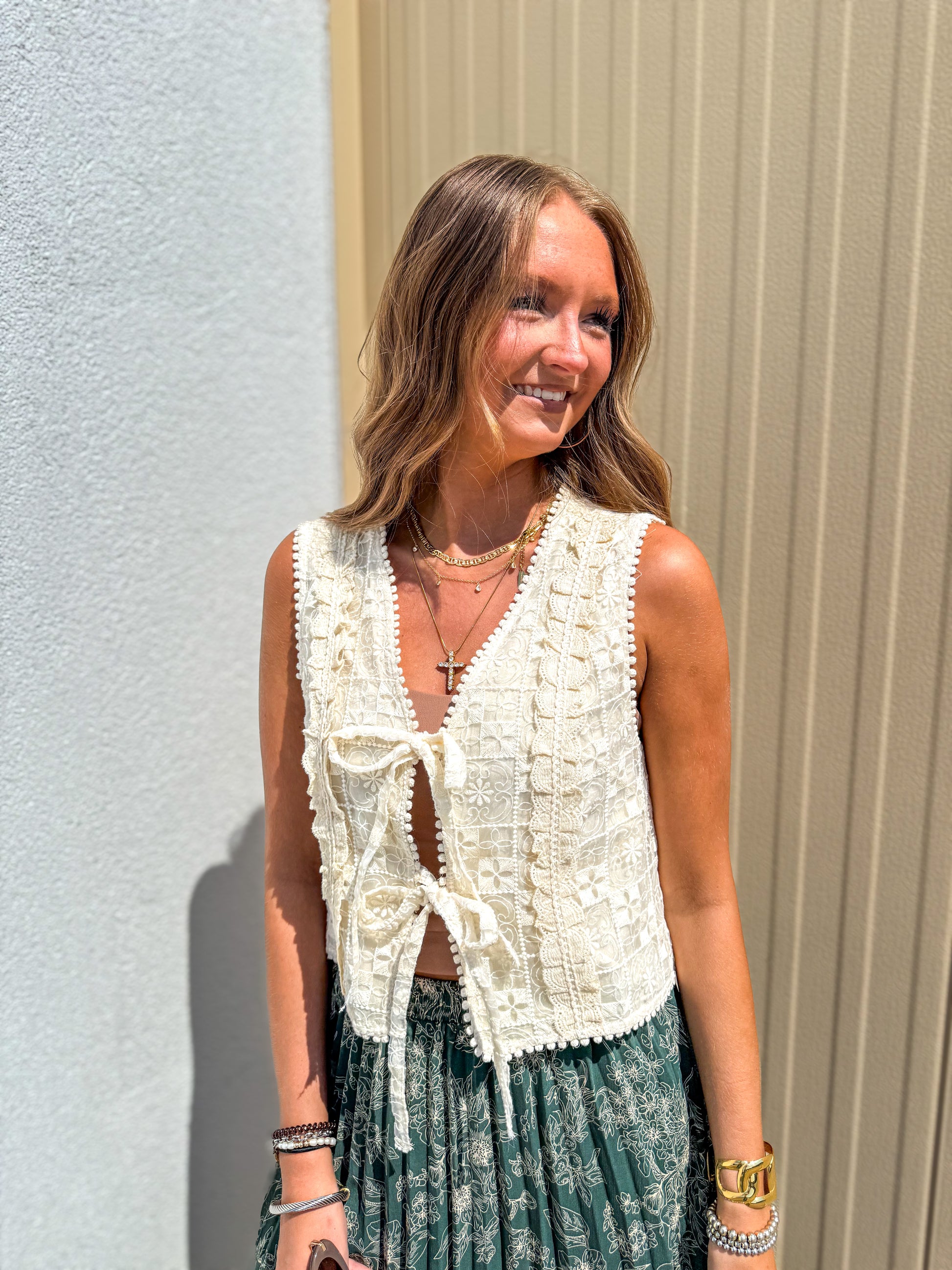 Elevate your wardrobe with the Lucky Lace Ivory Eyelet Vest, featuring delicate lace and intricate eyelet trim for a timeless, feminine look. Two front ties offer adjustable styling, while the fully lined design ensures comfort and quality. Its soft ivory hue makes it a versatile piece perfect for layering or wearing on its own.