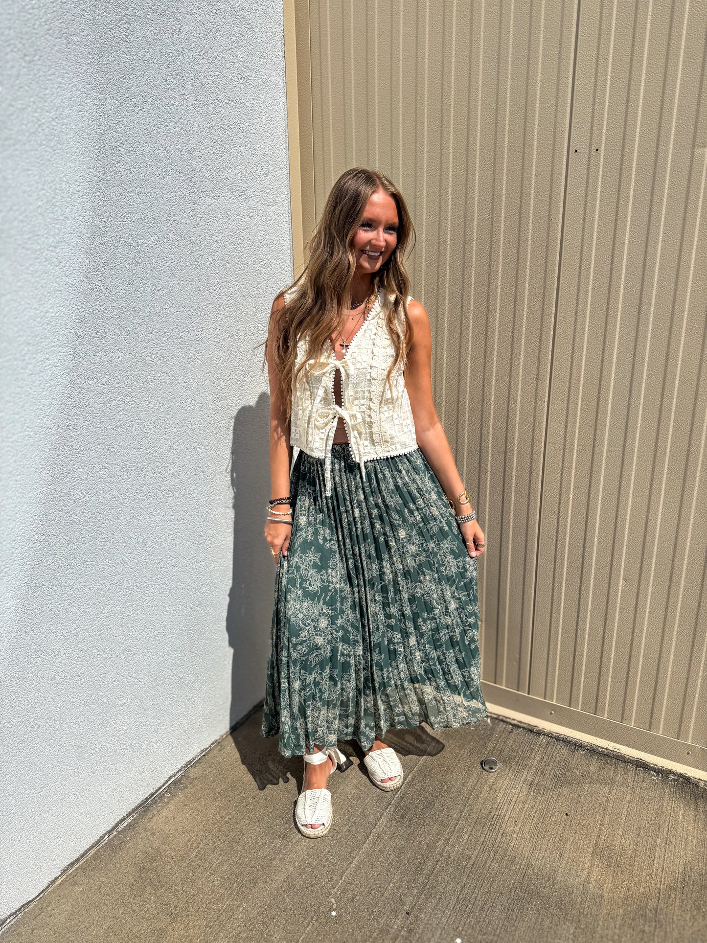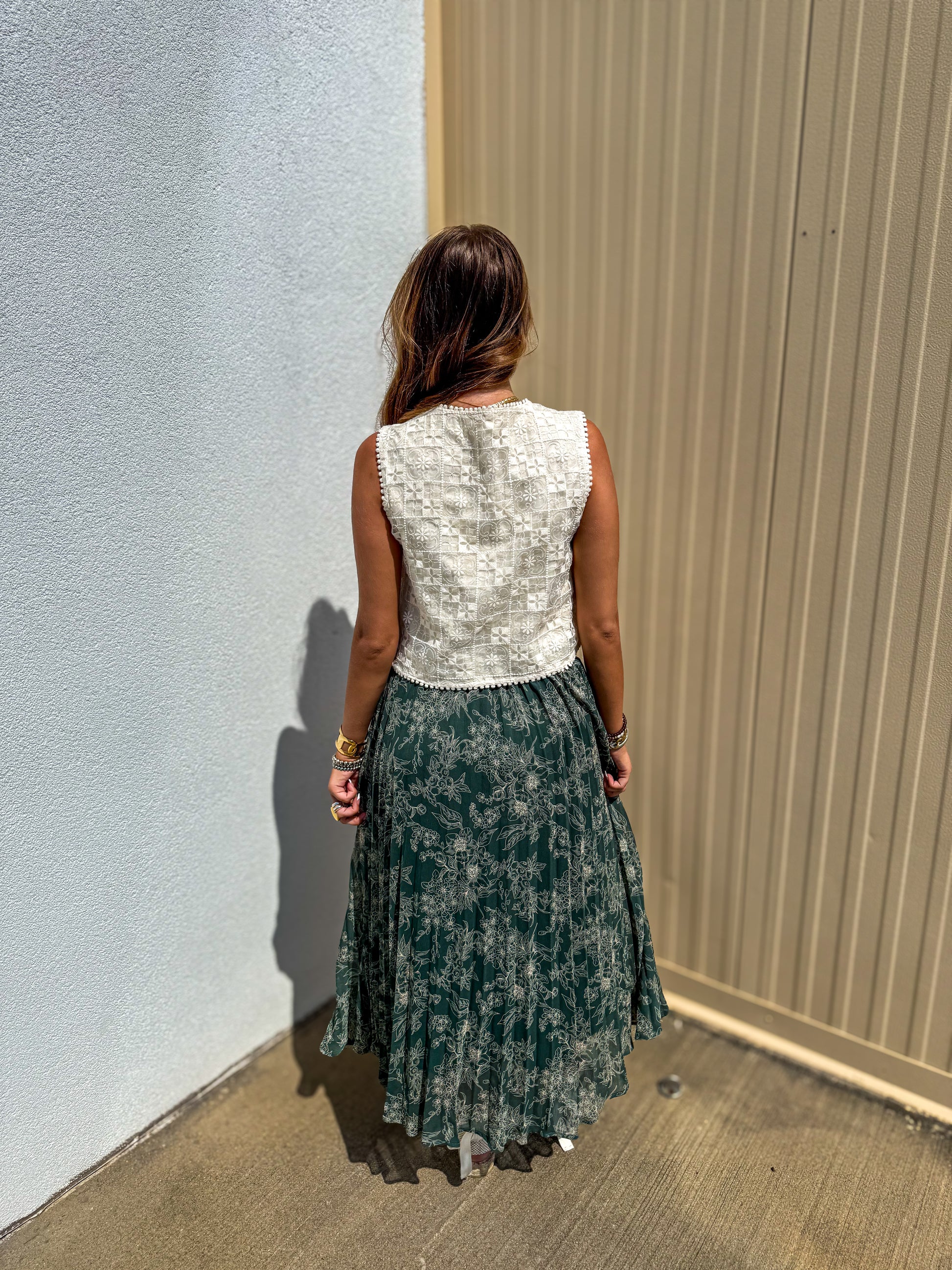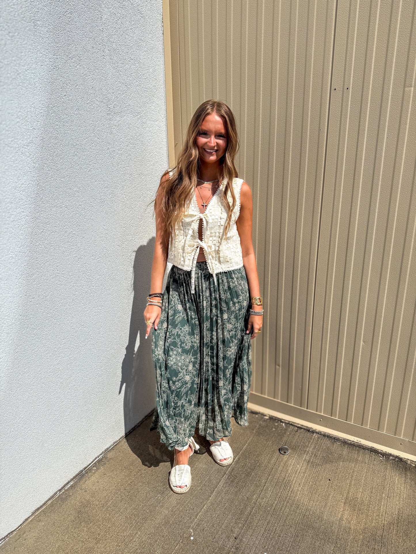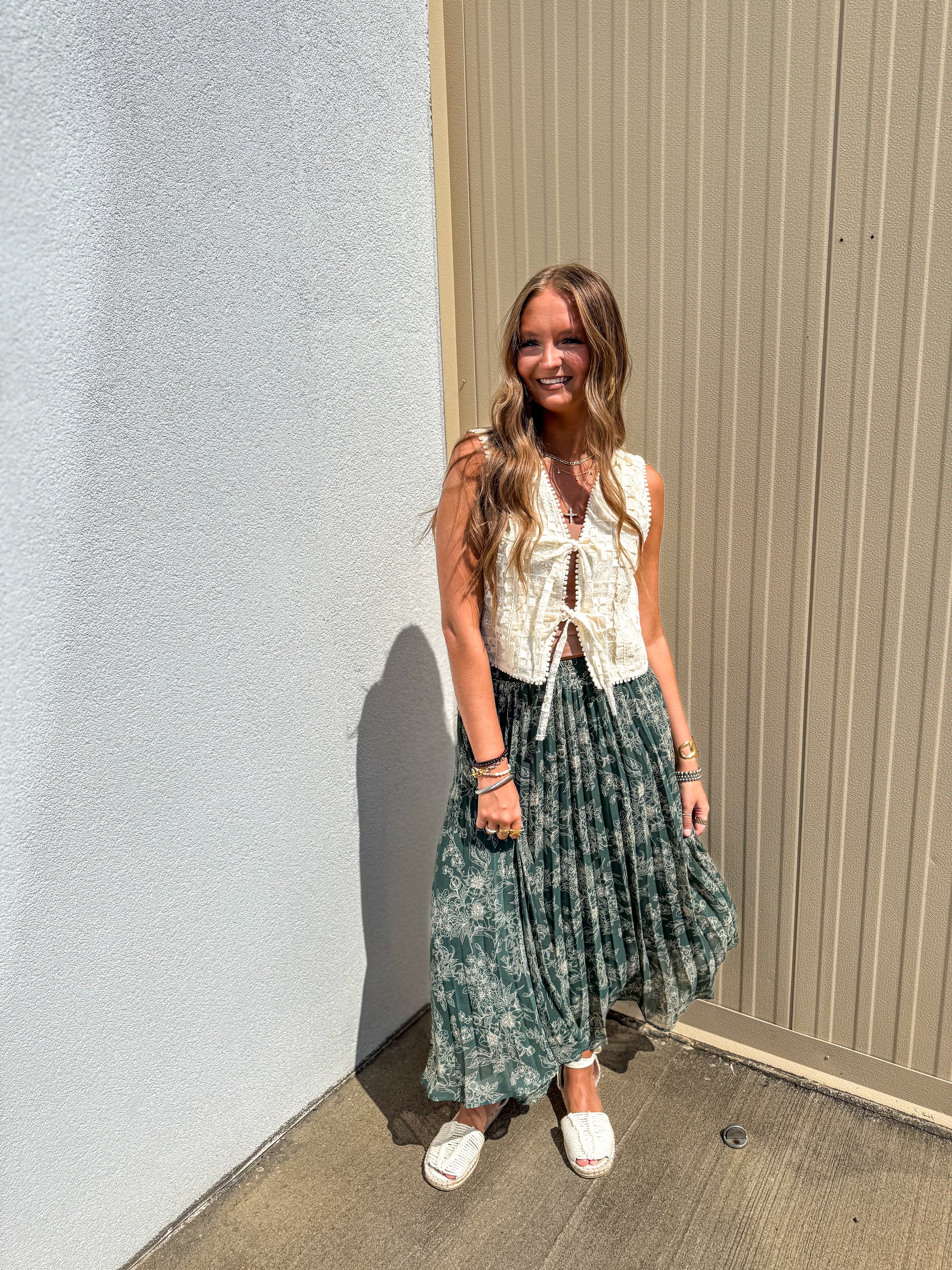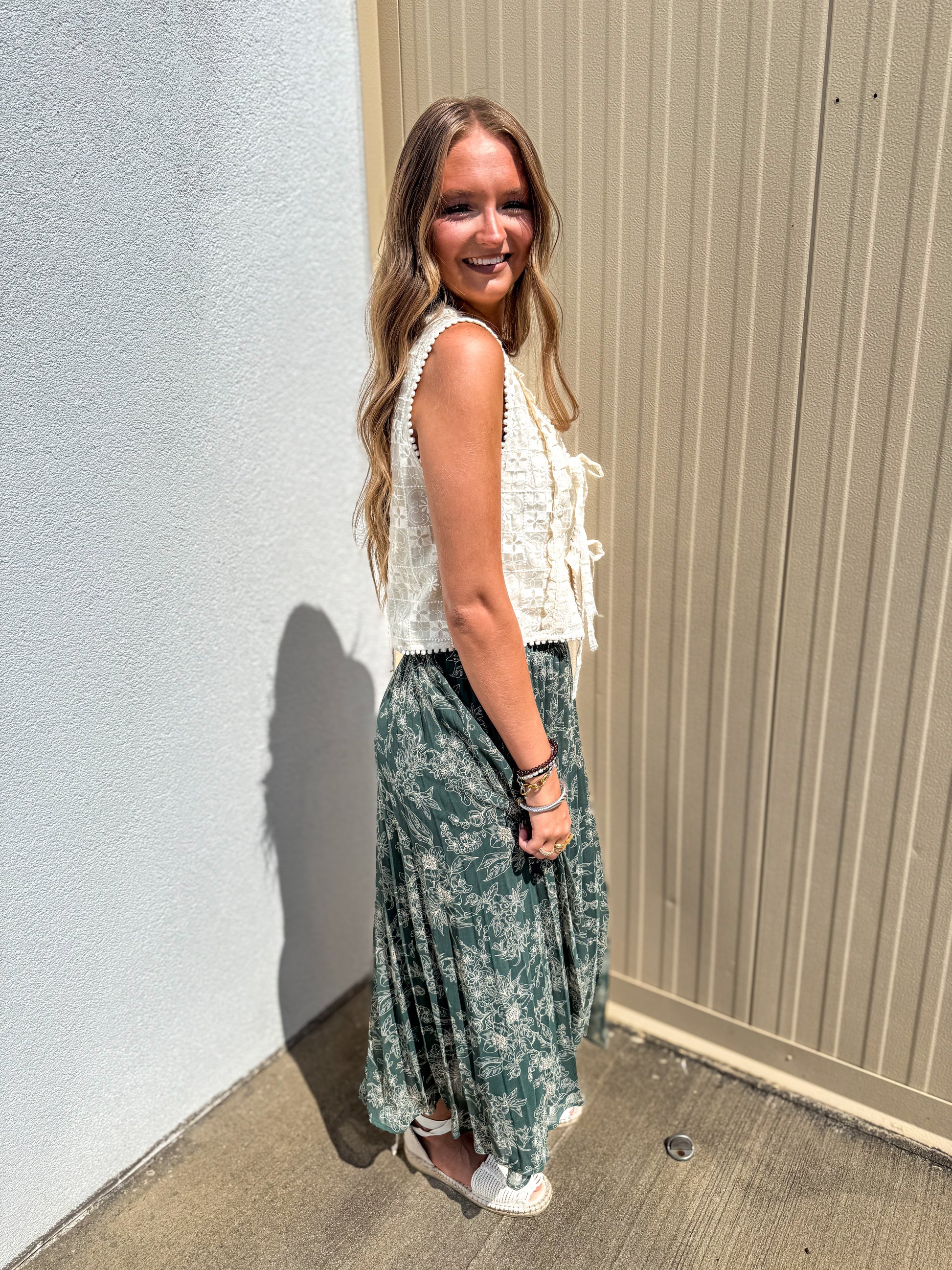 Elevate your wardrobe with the Lucky Lace Ivory Eyelet Vest, featuring delicate lace and intricate eyelet trim for a timeless, feminine look. Two front ties offer adjustable styling, while the fully lined design ensures comfort and quality. Its soft ivory hue makes it a versatile piece perfect for layering or wearing on its own.