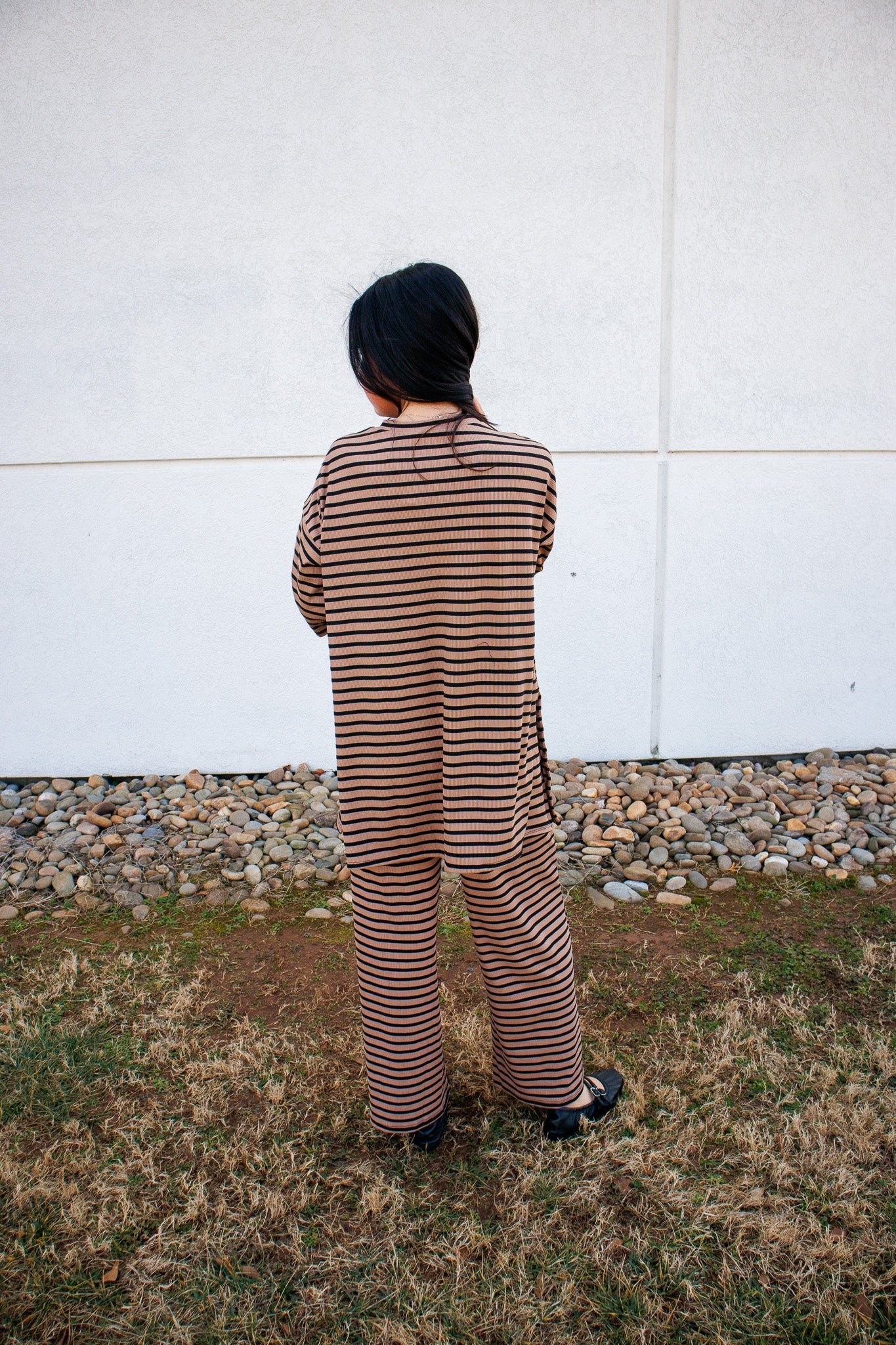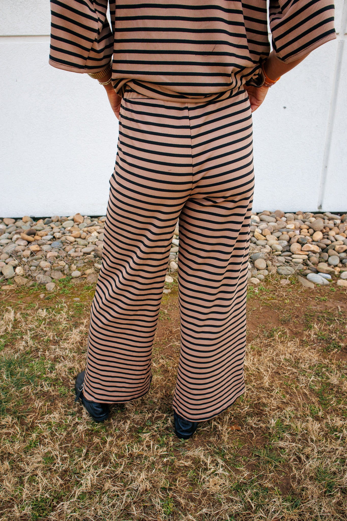 This striped set is the definition of laid-back luxury. Designed in a soft ribbed knit with a flattering drape, it gives you that perfectly oversized, throw-on-and-go feel while still looking styled and intentional. The relaxed top features an easy, flowy silhouette with elbow-length sleeves, while the matching high-rise pants offer a comfortable elastic waistband and a wide-leg fit that elongates your shape.