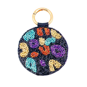 Beaded leopard keychain. Keychain is black beaded, with red, purple, gold, and teal spots.