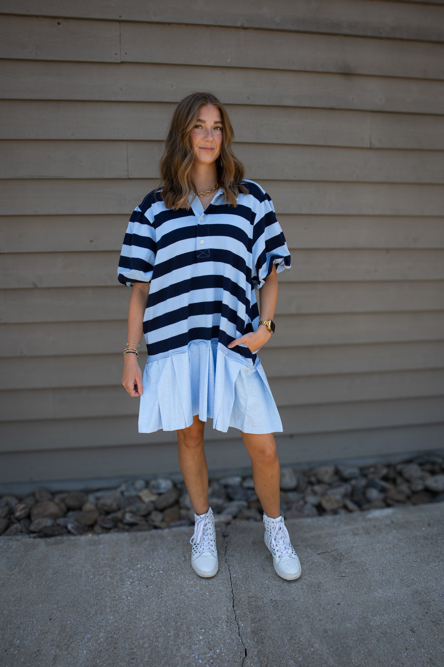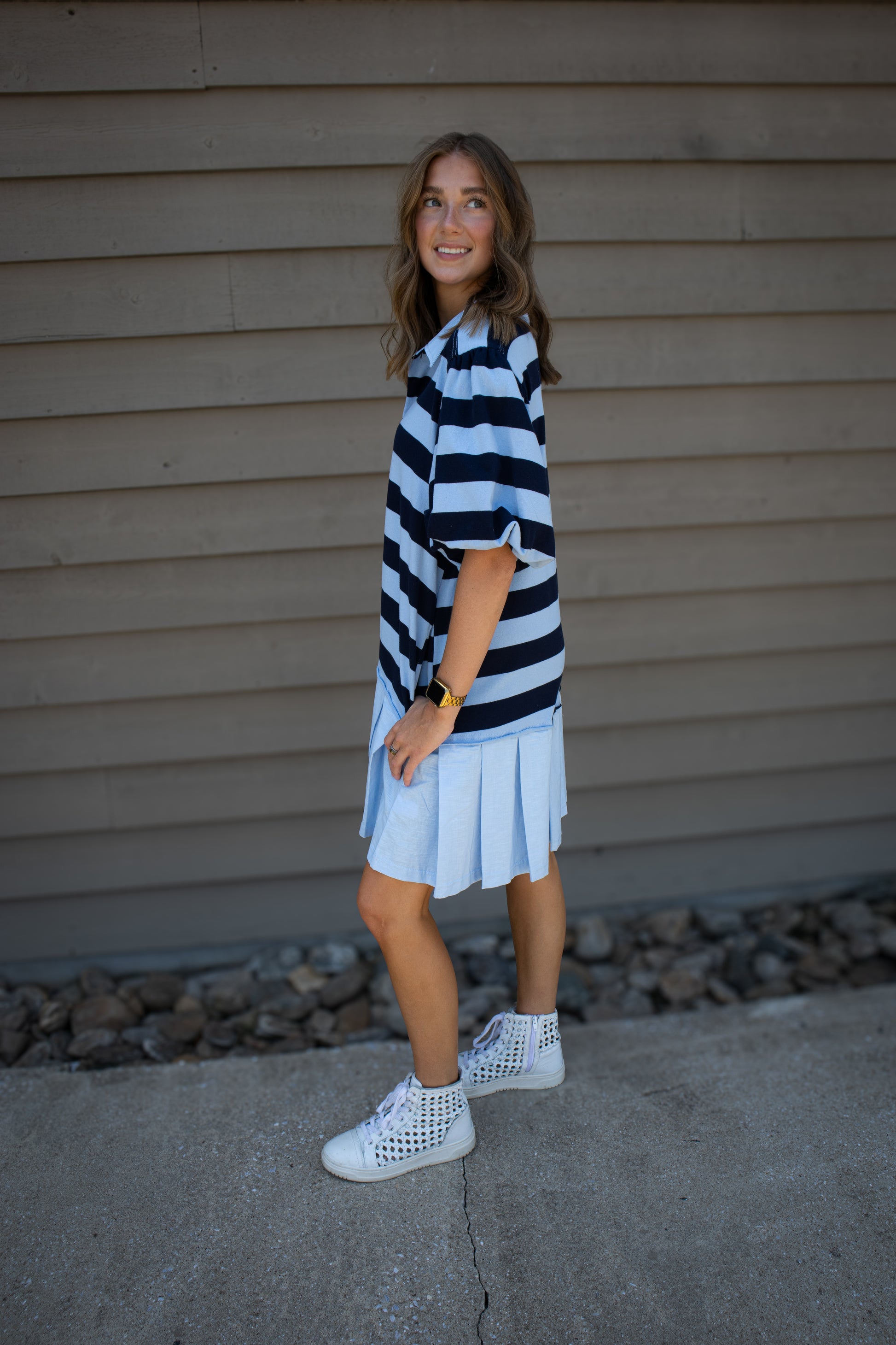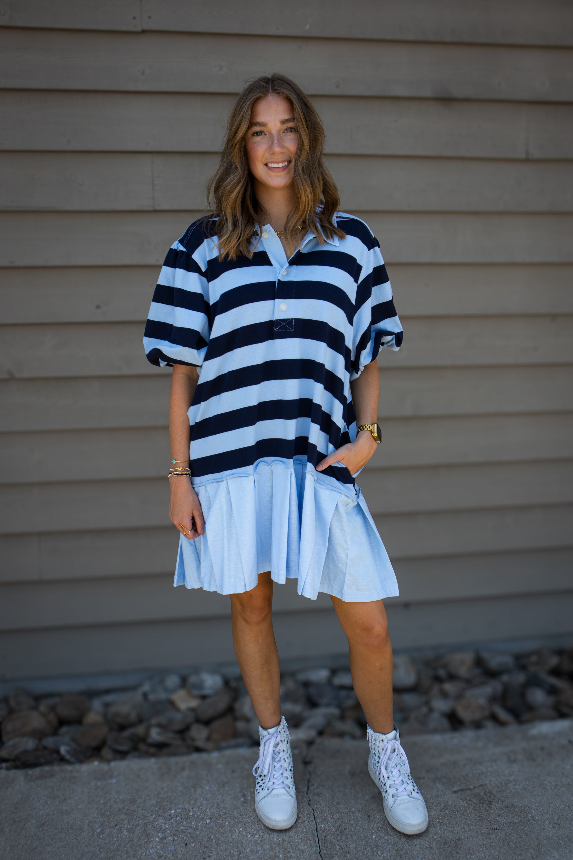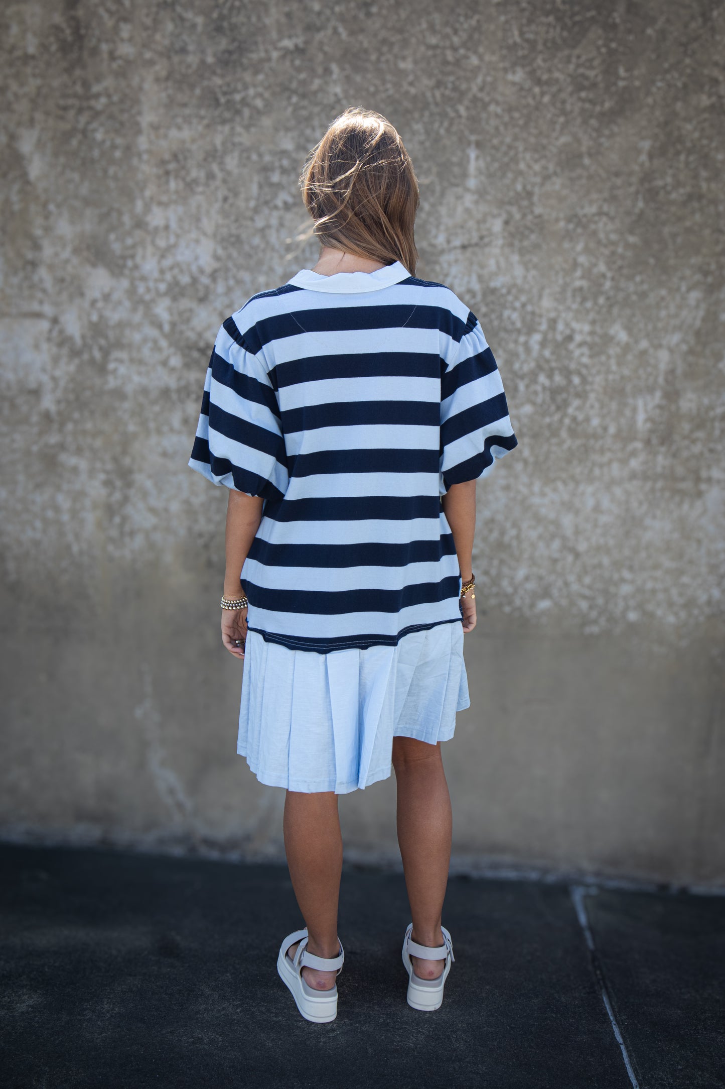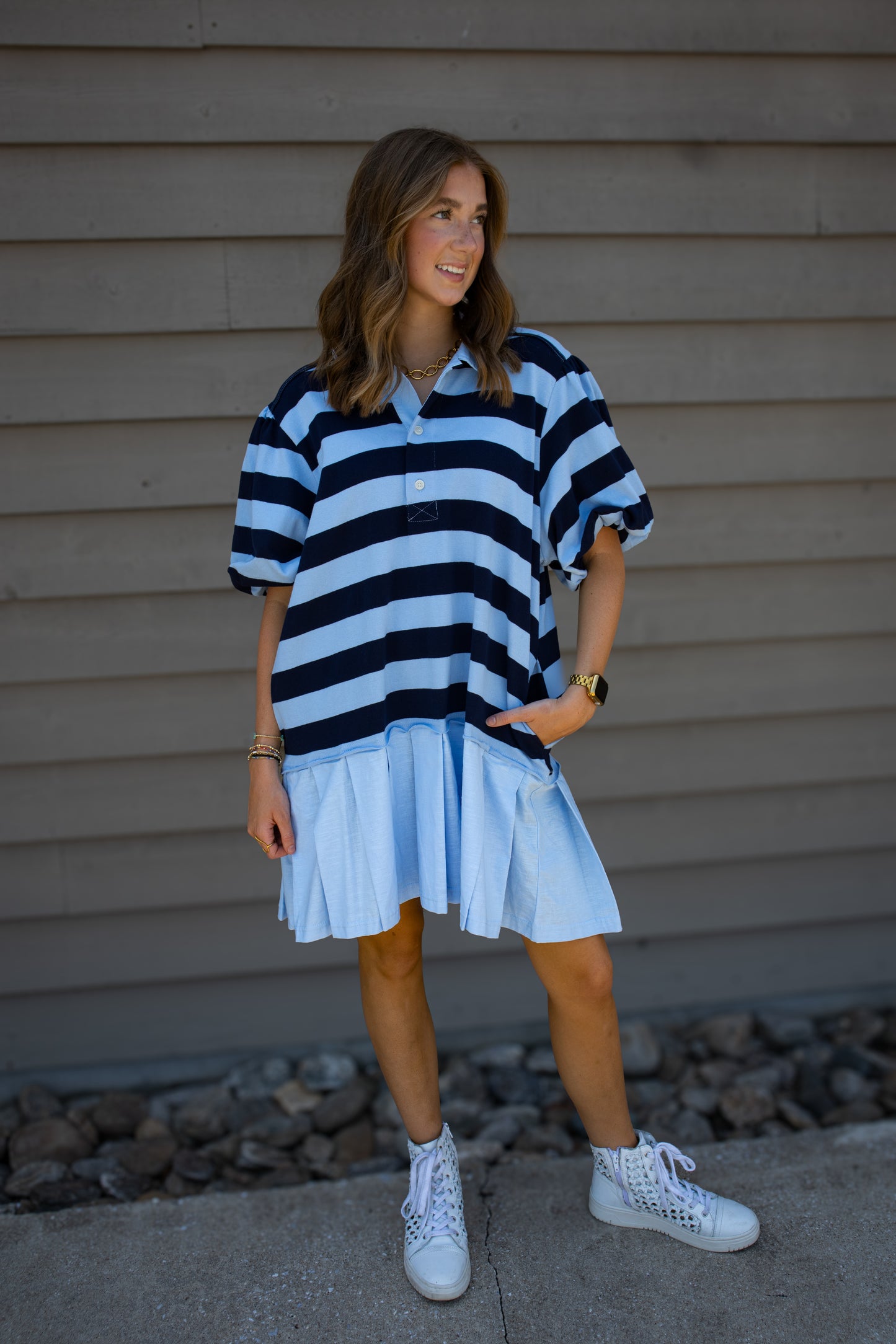 Introduce nautical vibes into your wardrobe with this stylish dress. The blue stripe detail and collar neckline exude sophistication, while the bubble sleeves and pleated bottom add a touch of playfulness. Embrace comfort and style with this versatile piece.