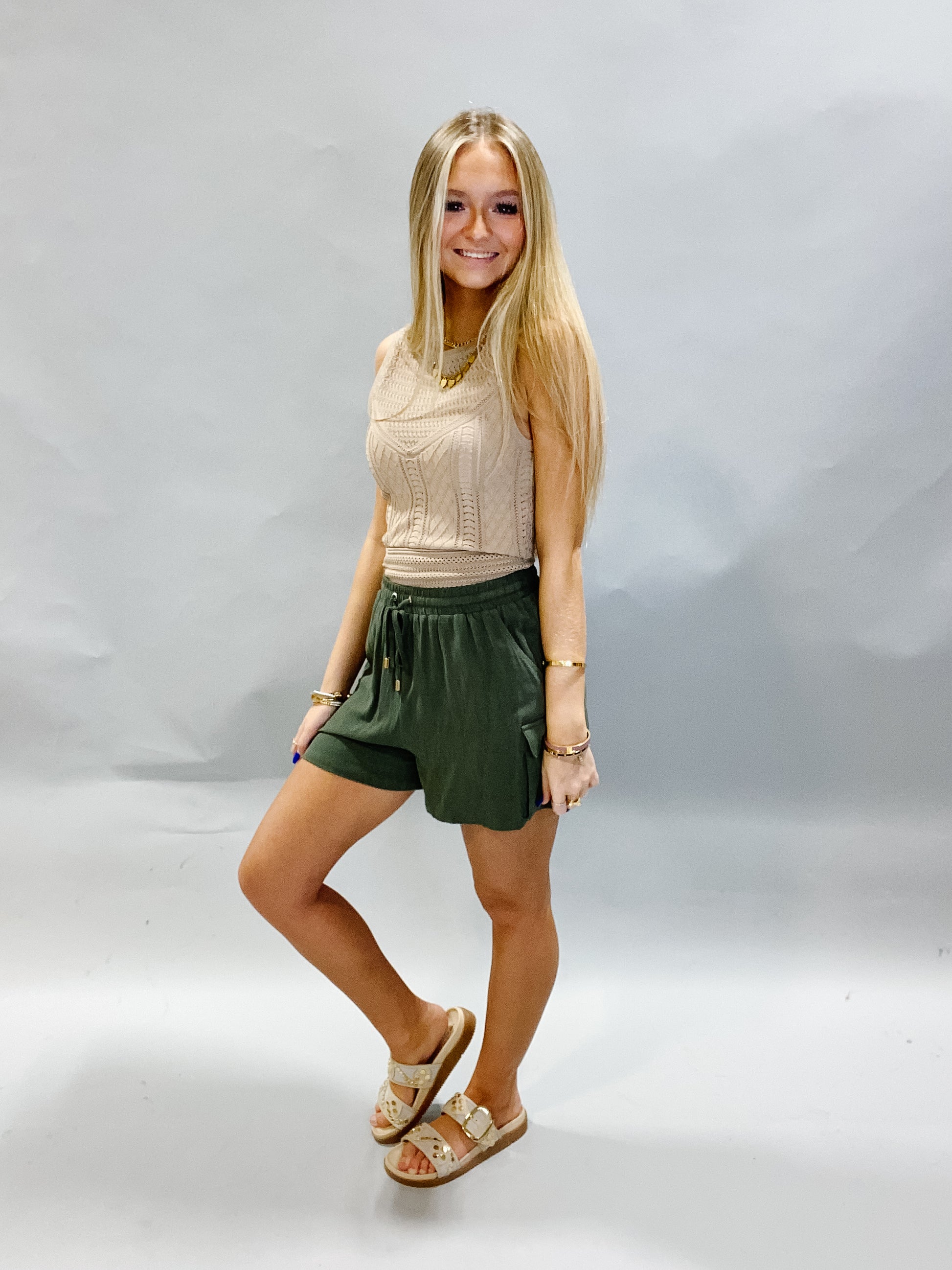 Upgrade your summer wardrobe with our Olive Linen Cargo Shorts. These shorts feature an elastic waistband for a comfortable fit, as well as side cargo pockets adorned with gold buckles for a touch of elegance. The adjustable drawstring with gold detail adds both style and function to these lightweight linen shorts.