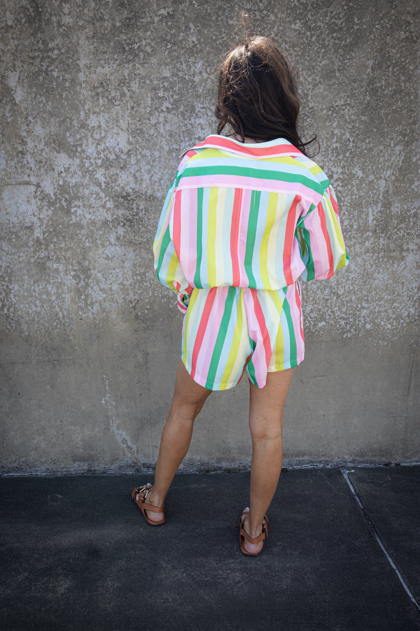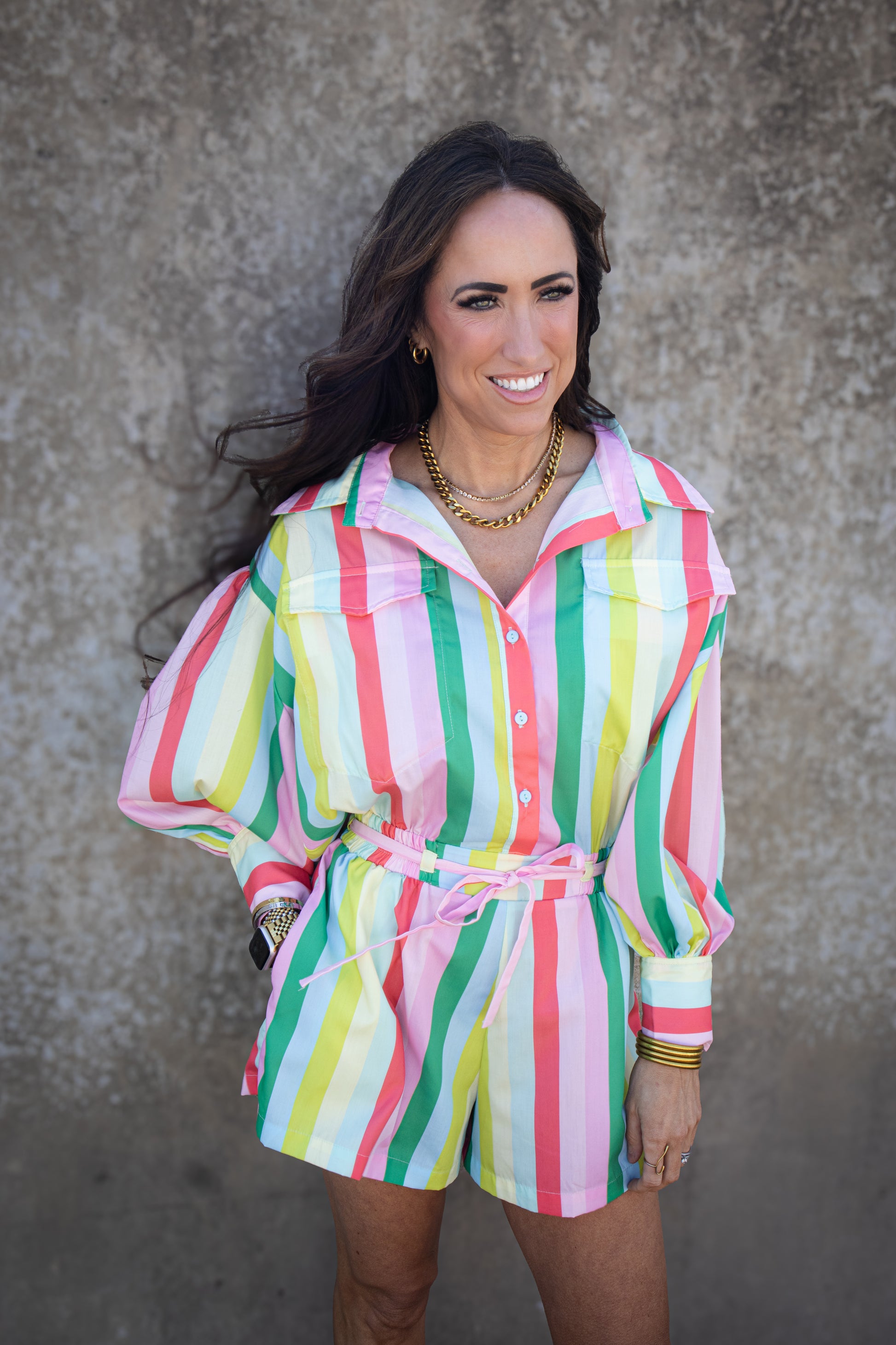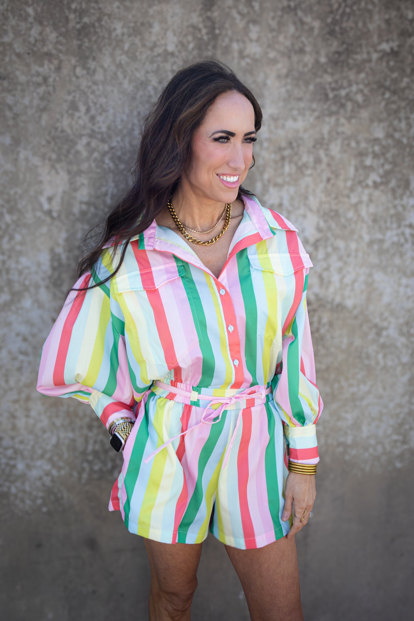 Effortlessly chic and playful, our Rainbow Bliss Romper features a colorful stripe pattern and cuffed sleeves for a fun and stylish look. The long sleeves keep you cozy, while the front button closure and elastic waistband provide a comfortable fit. The adjustable tie adds a touch of versatility to elevate your outfit.