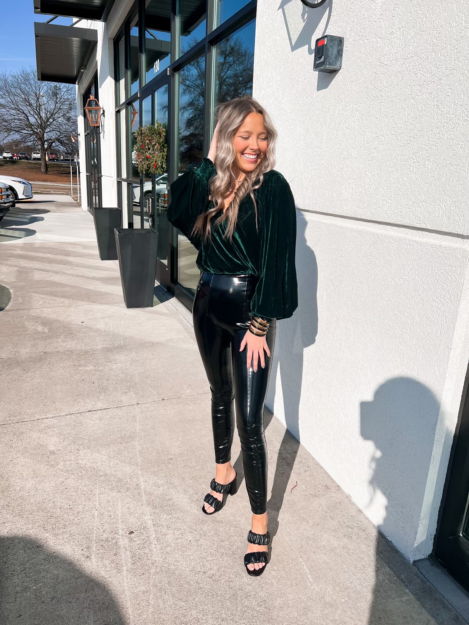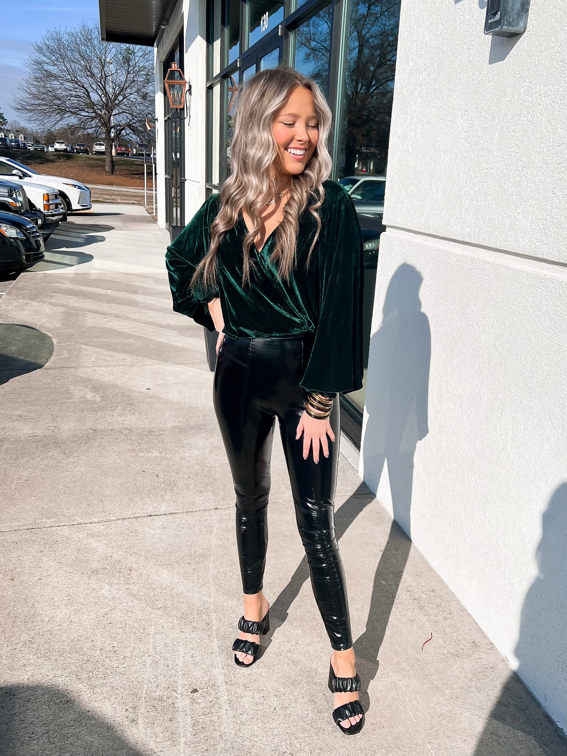 This gorgeous velvet bodysuit is perfect for all of your holiday festivities. Such a beautiful green color. We love it paired with our patent Spanx leggings. You can also pair with denim or trouser pants.