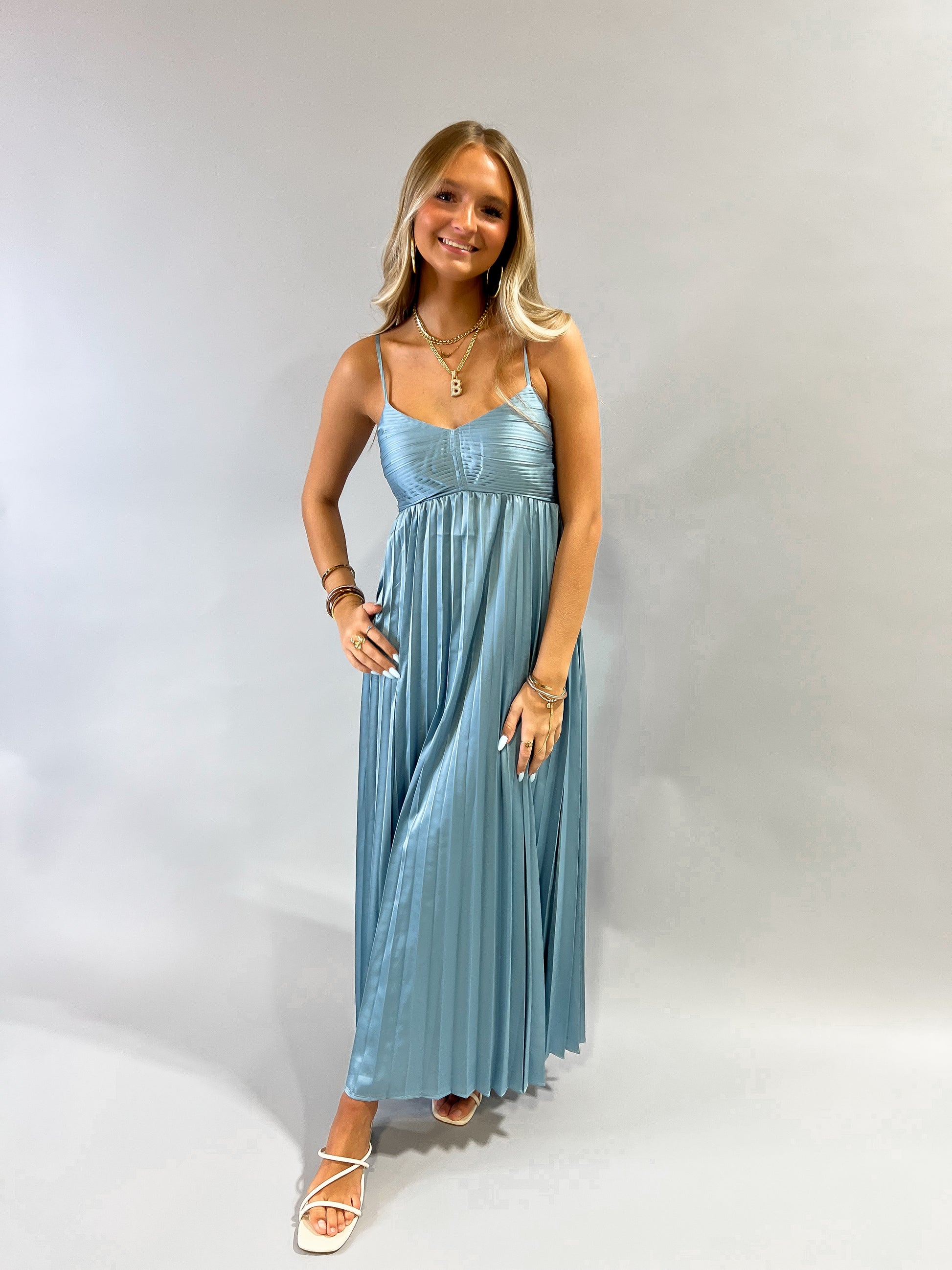The Simple Stunner Satin Midi Dress features a fully lined design with an empire bodice and a sweetheart neckline for a flattering fit. The pleated midi dress is perfect for any occasion and comes with adjustable straps for added comfort.