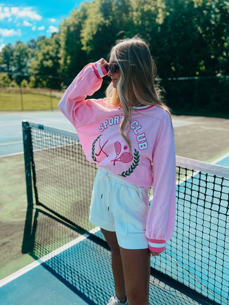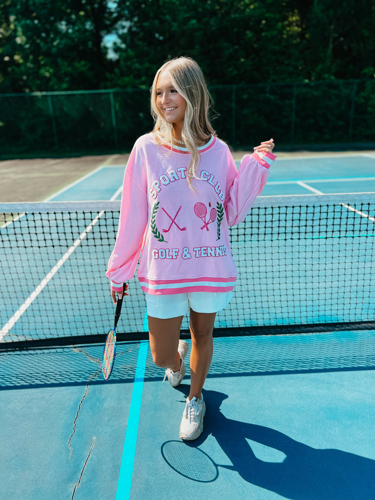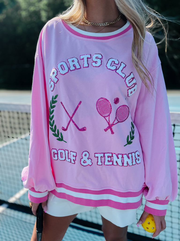 Get country club ready with our Sports Club Sweatshirt. The perfect relaxed with a pop of pink sequins lettering on the front. This sweatshirt features golf and tennis specific designs and lettering outlined with pink sequins. The varsity stripe around the neck, waist, and arms give it an elevated look. Stay stylish on your day off!