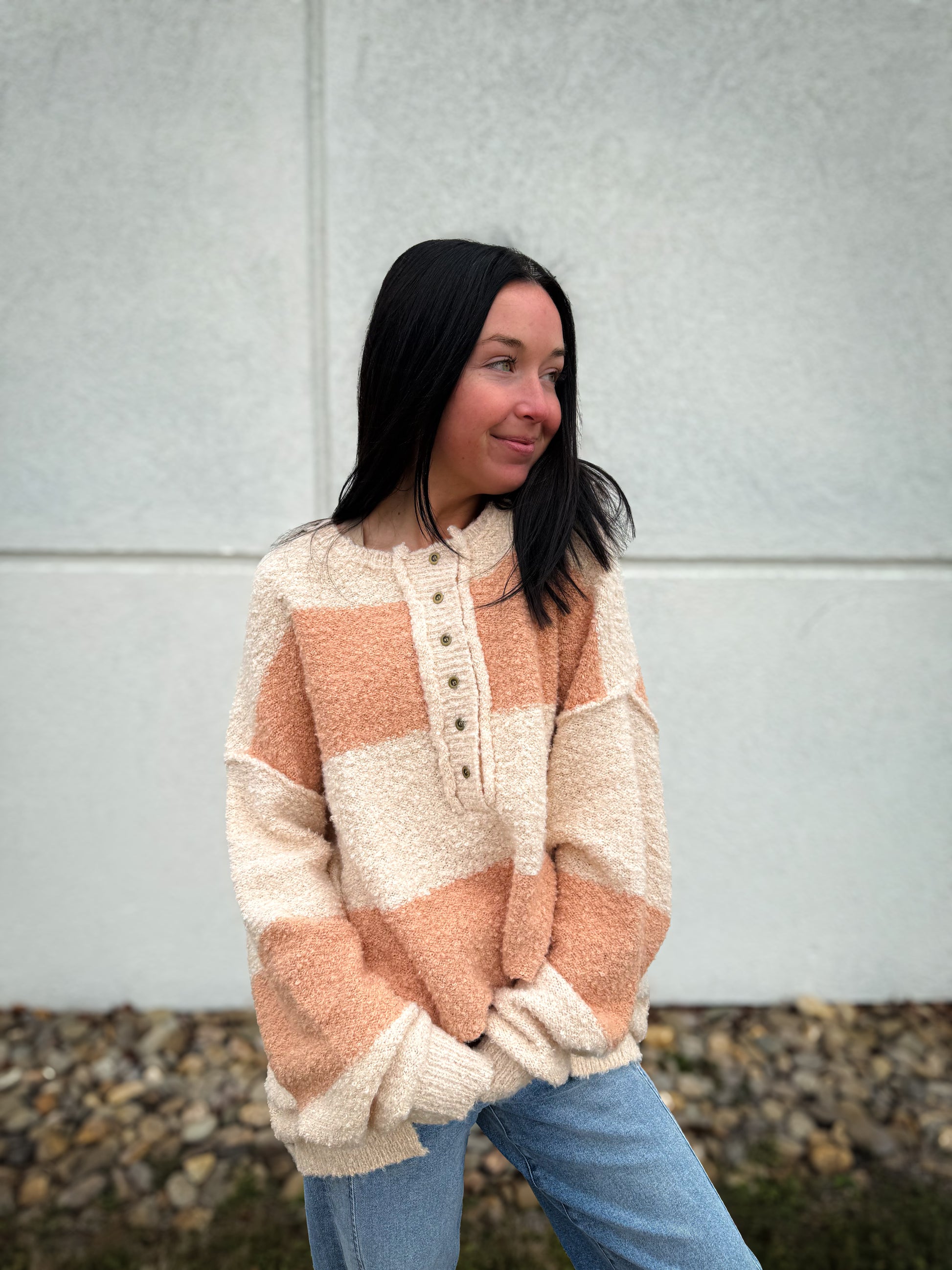 Expertly crafted for comfort and style, our Stripes of Beige Oversized Sweater is the epitome of cozy. Made with a luxuriously soft fabric, this beige sweater features darker beige stripes for a subtle touch of detail. With a unique button detail and a flattering high low hem, this sweater is the perfect addition to your wardrobe.