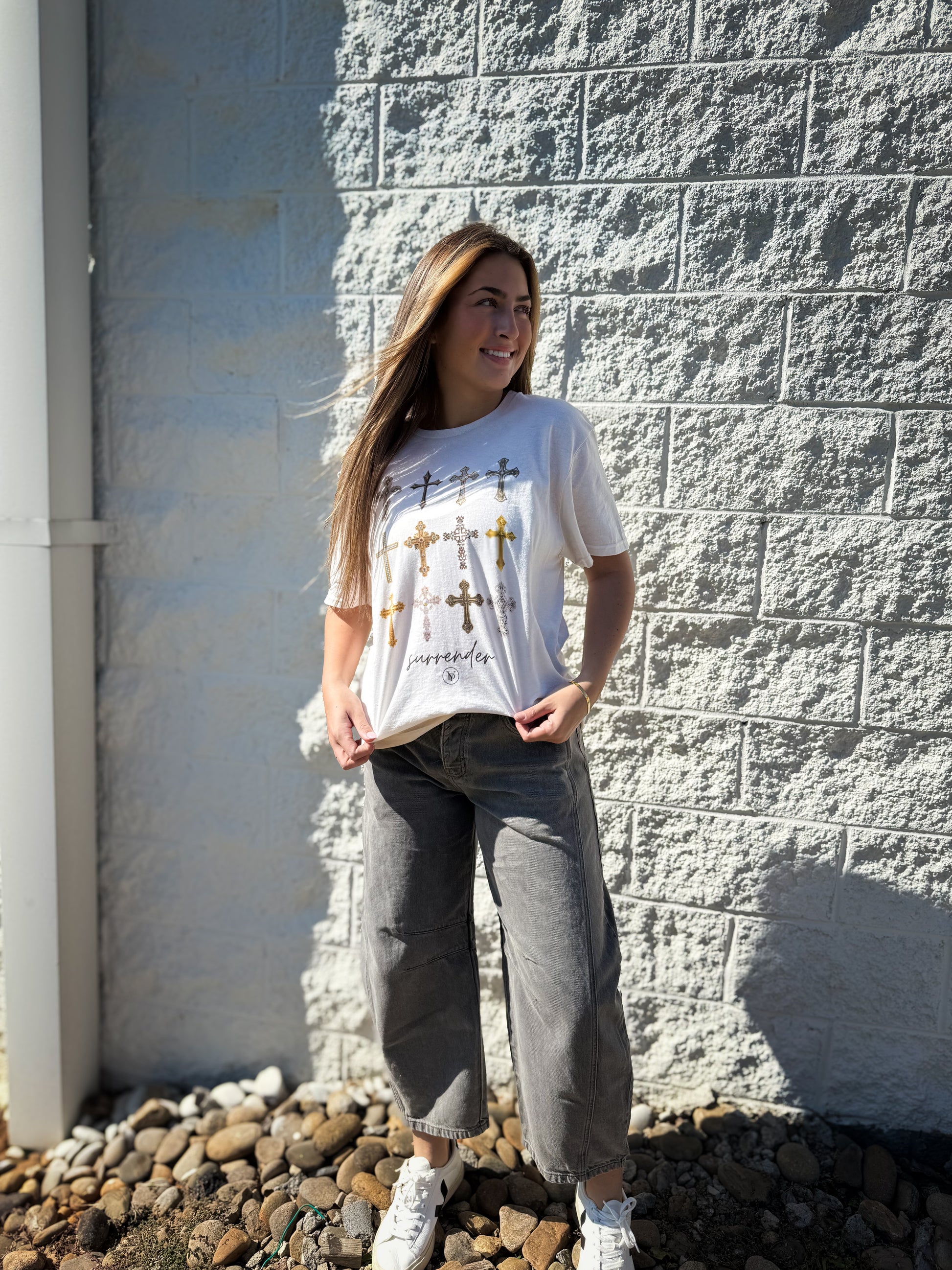 Embrace effortless style with the Surrender Cross Graphic Tee. This cream-colored shirt features a bold cross-printed graphic paired with the empowering "Surrender" wording, making a confident statement. Crafted to fit true to size, it ensures a comfortable, flattering wear whether layered or worn alone. Perfect for those who want to showcase their bold side with everyday ease.