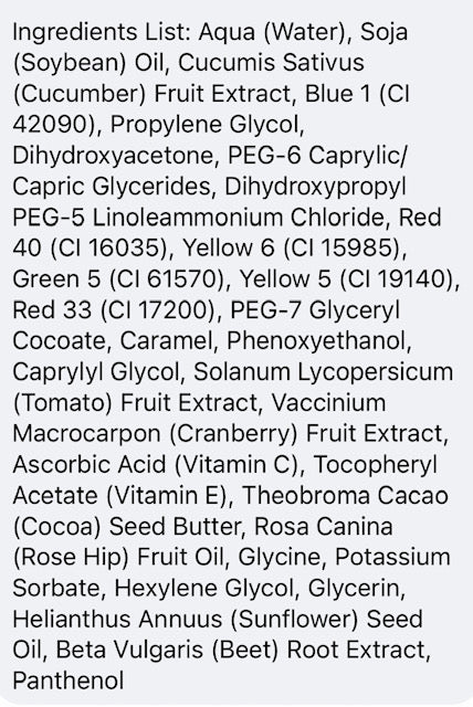 Ingredients List: Aqua (Water), Soja (Soybean) Oil, Cucumis Sativus (Cucumber) Fruit Extract, Blue 1 (CI 42090), Propylene Glycol, Dihydroxyacetone, PEG-6 Caprylic/Capric Glycerides, Dihydroxypropyl PEG-5 Linoleammonium Chloride, Red 40 (CI 16035), Yellow 6 (CI 15985), Green 5 (CI 61570), Yellow 5 (CI 19140), Red 33 (CI 17200), PEG-7 Glyceryl Cocoate, Caramel, Phenoxyethanol, Caprylyl Glycol, Solanum Lycopersicum (Tomato) Fruit Extract, Vaccinium Macrocarpon (Cranberry) Fruit Extract, Ascorbic Acid (Vitamin C), Tocopheryl Acetate (Vitamin E), Theobroma Cacao (Cocoa) Seed Butter, Rosa Canina (Rose Hip) Fruit Oil, Glycine, Hexylene Glycol, Glycerin, Helianthus Annuus (Sunflower) Seed Oil, Beta Vulgaris (Beet) Root Extract, Panthenol