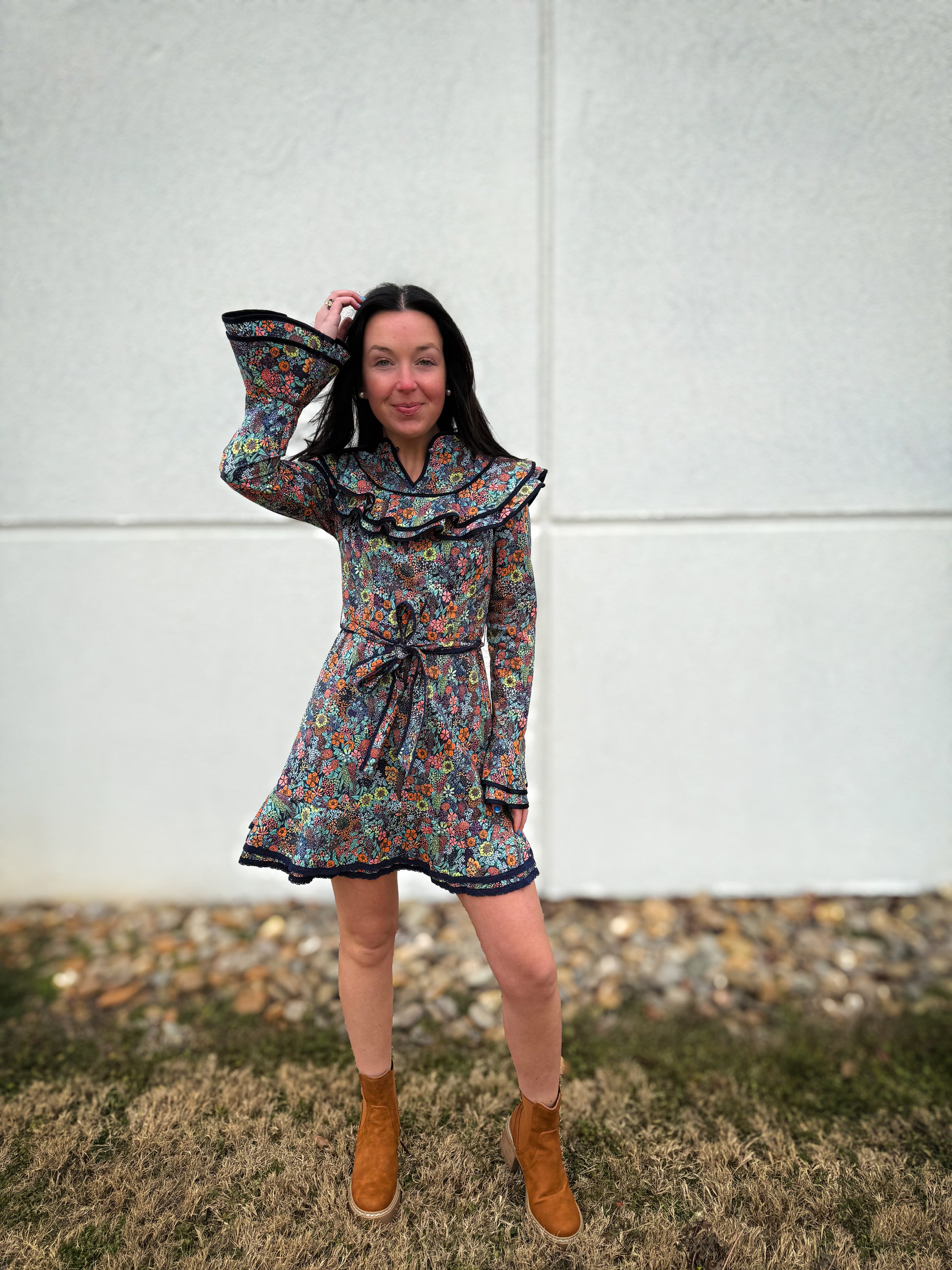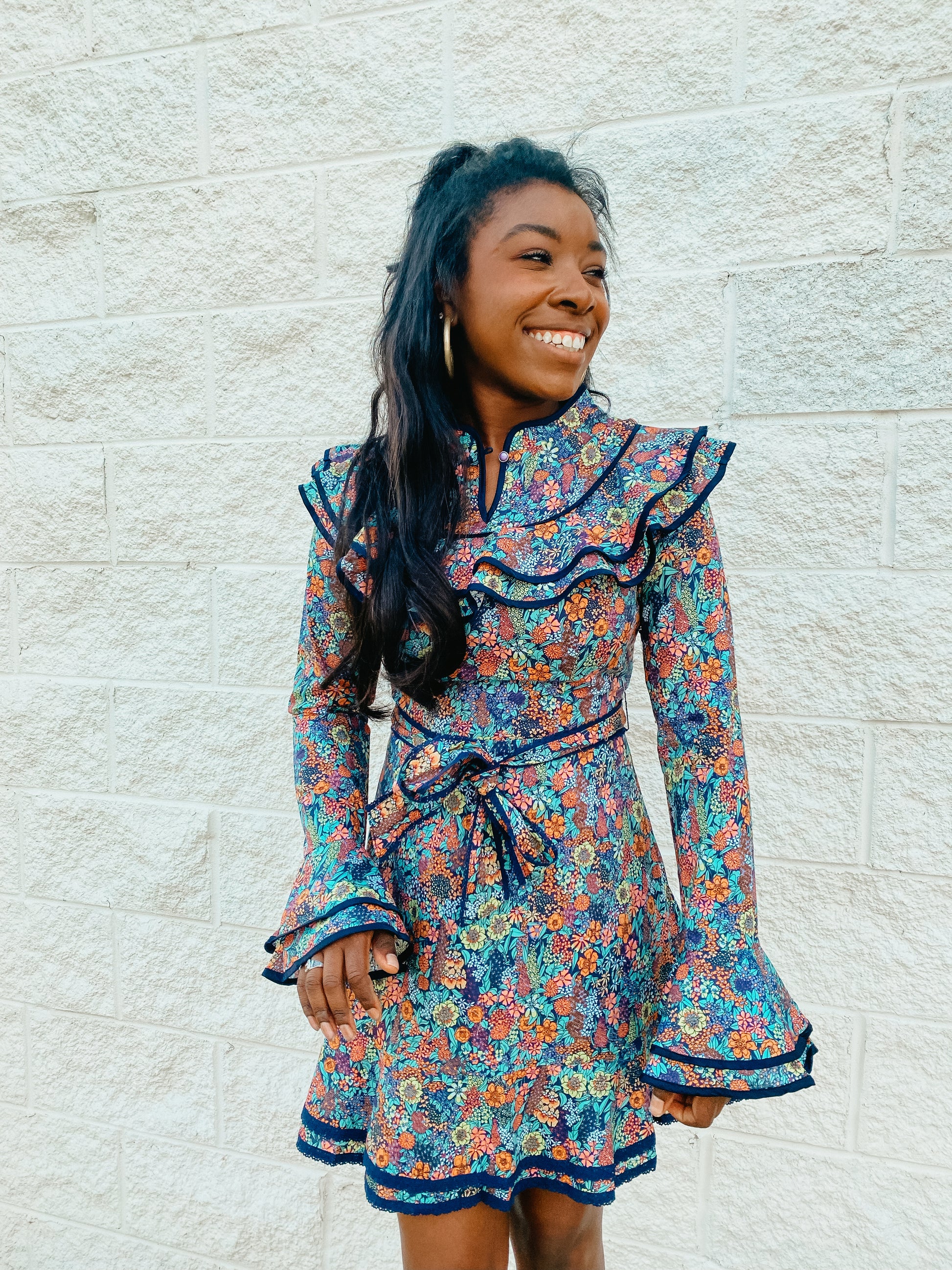 Experience luxury without the price tag with our Twilight Floral Ruffle Mini Dress! Featuring a tiered front keyhole design and double tiered ruffled shoulders and cuffs, this dress is sure to turn heads. Complete with a flattering tie waist, feel effortlessly chic and stylish in this must-have dress.