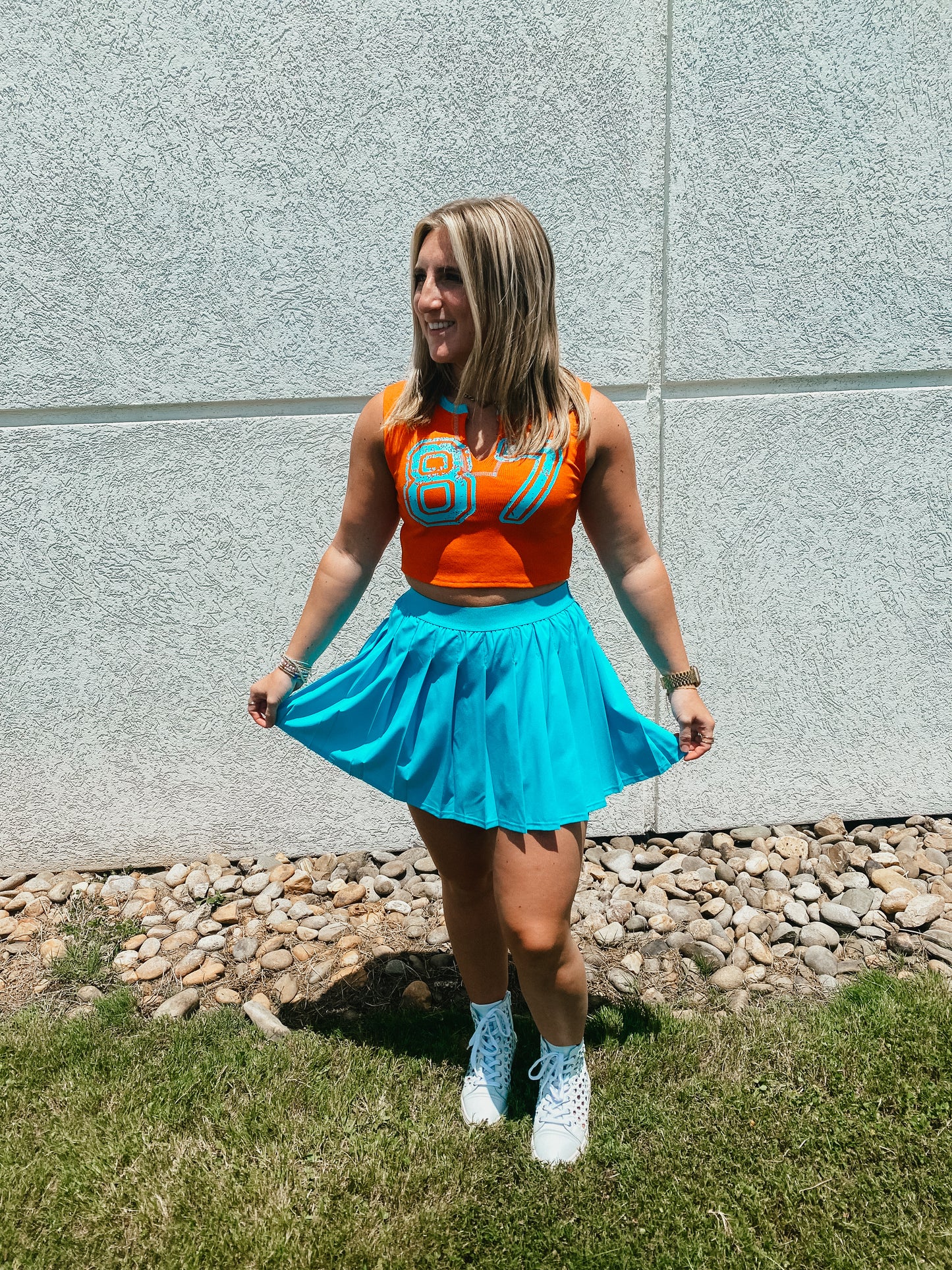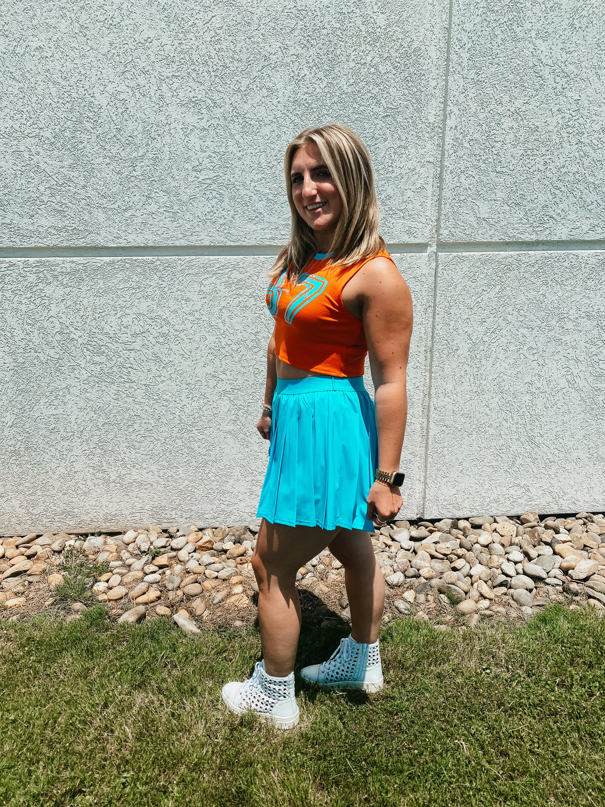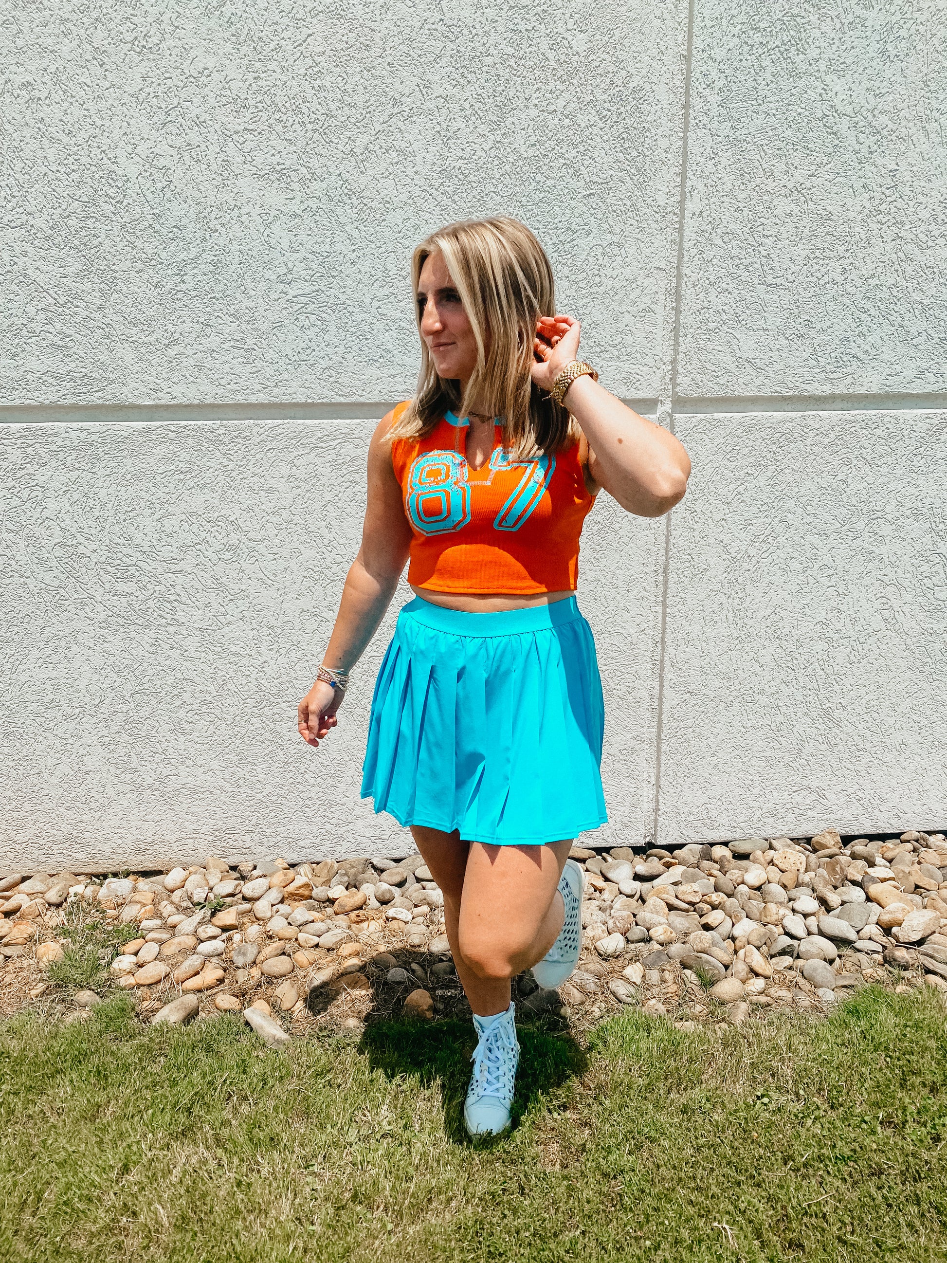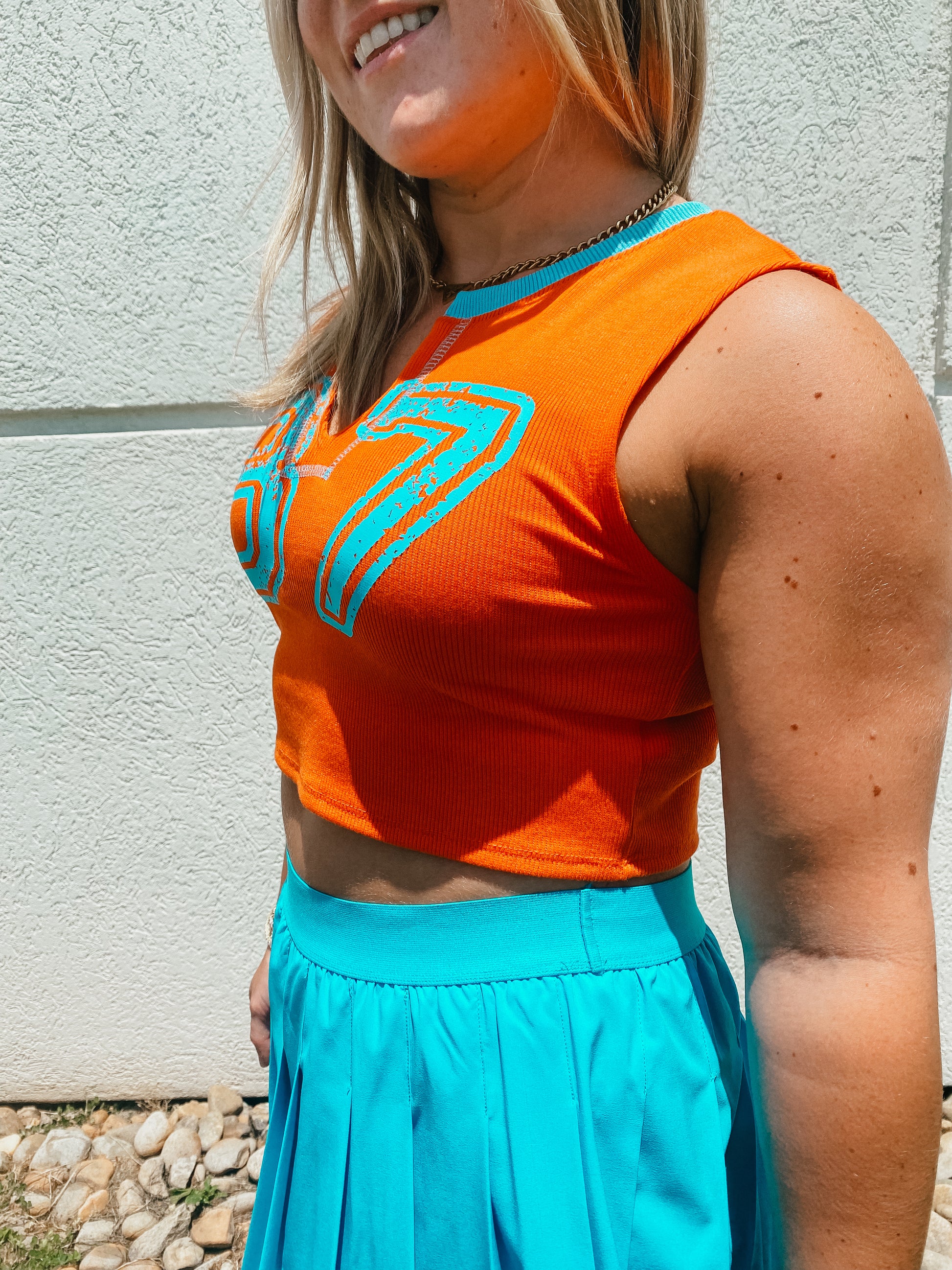 Get sporty with the Varsity 87 Cropped Tank Top! This ribbed top comes in a bright orange hue with a fun pop of teal in the number 87. Notched at the neck with top-stitched detailing. Perfect for a playful and athletic look, this top is cropped for a trendy twist. Everyone's favorite top now available in two colors!