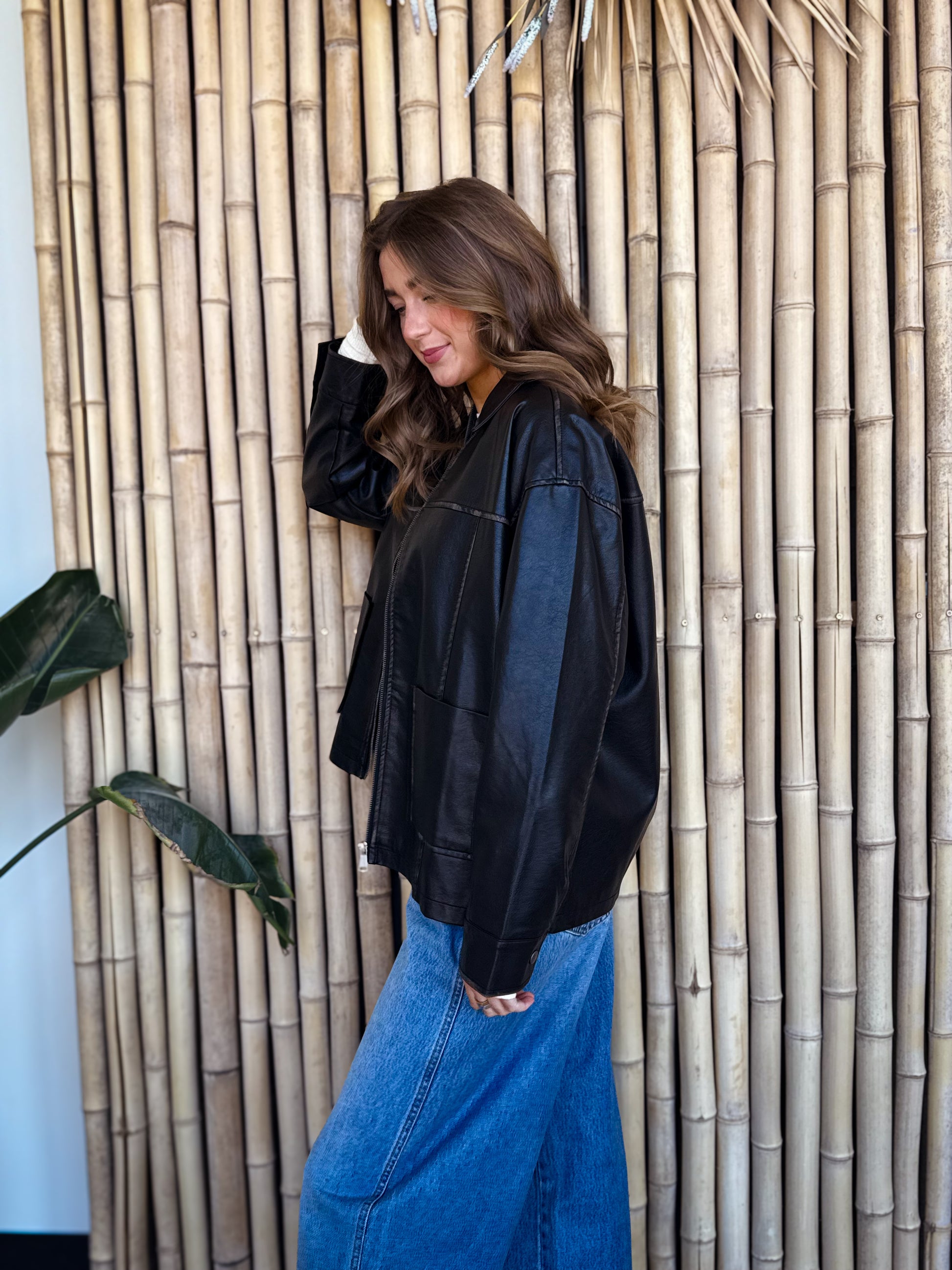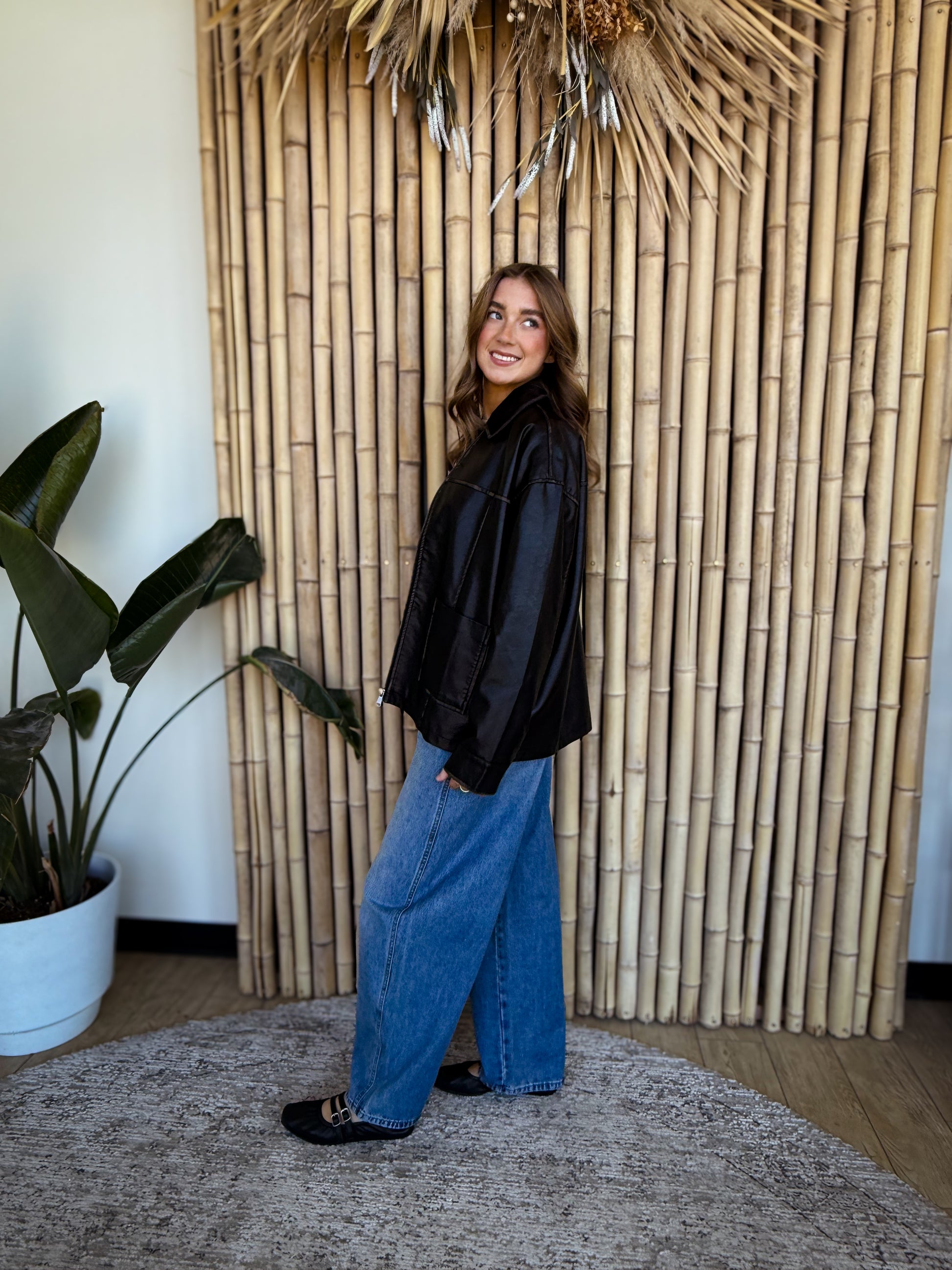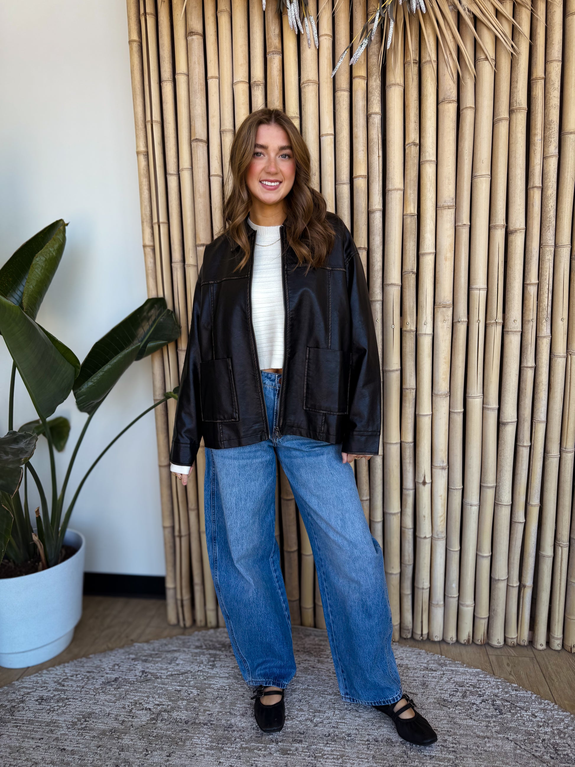 Effortlessly cool and endlessly versatile, this Washed Faux Leather Collared Zip-Up Jacket is your new go-to layer for fall and beyond. Designed with a relaxed, boxy silhouette, this jacket features a classic shirt collar, front zip closure, and deep patch pockets for a touch of utility. The soft, washed faux leather gives it a lived-in, vintage feel without compromising on style or comfort.