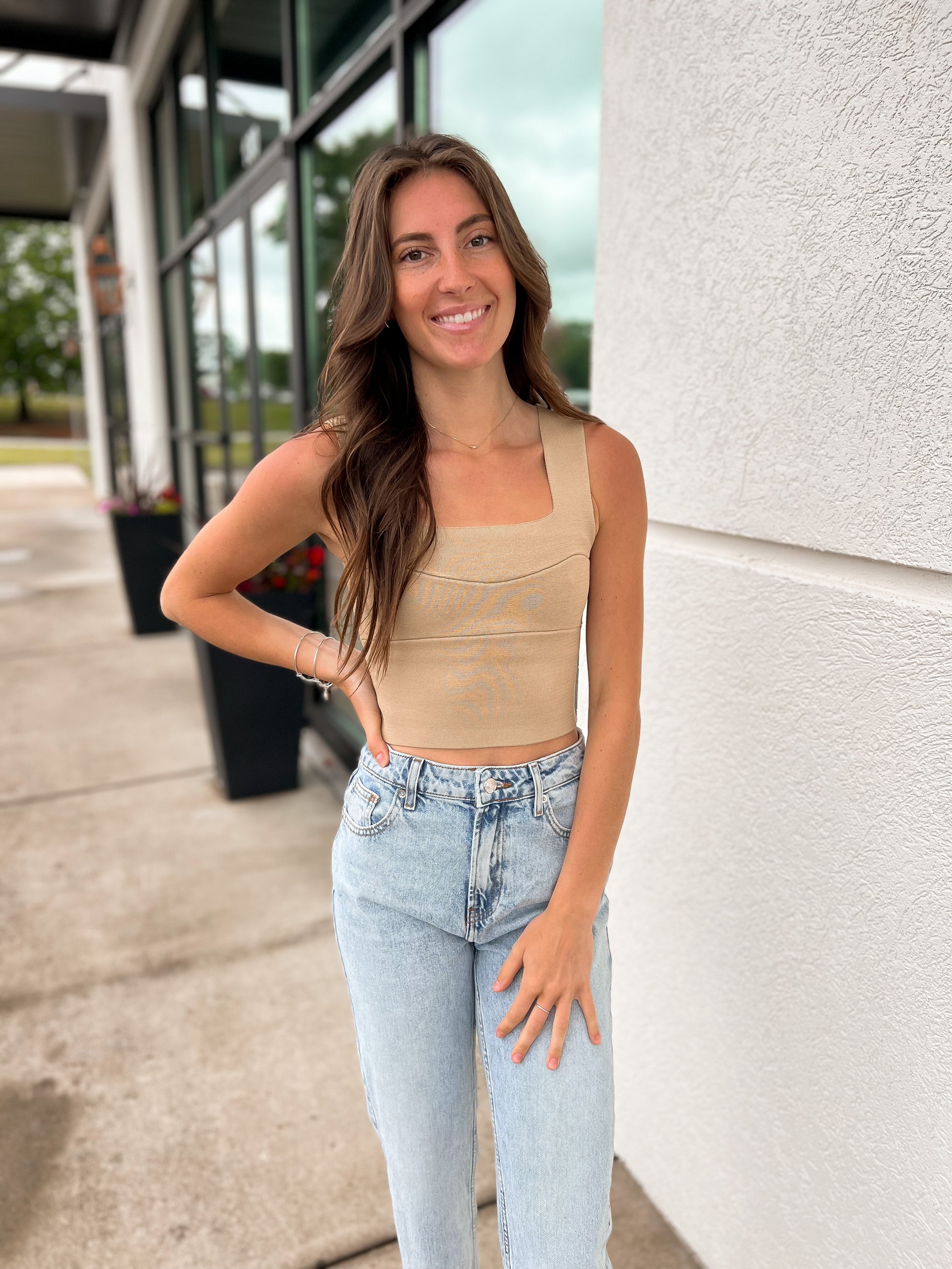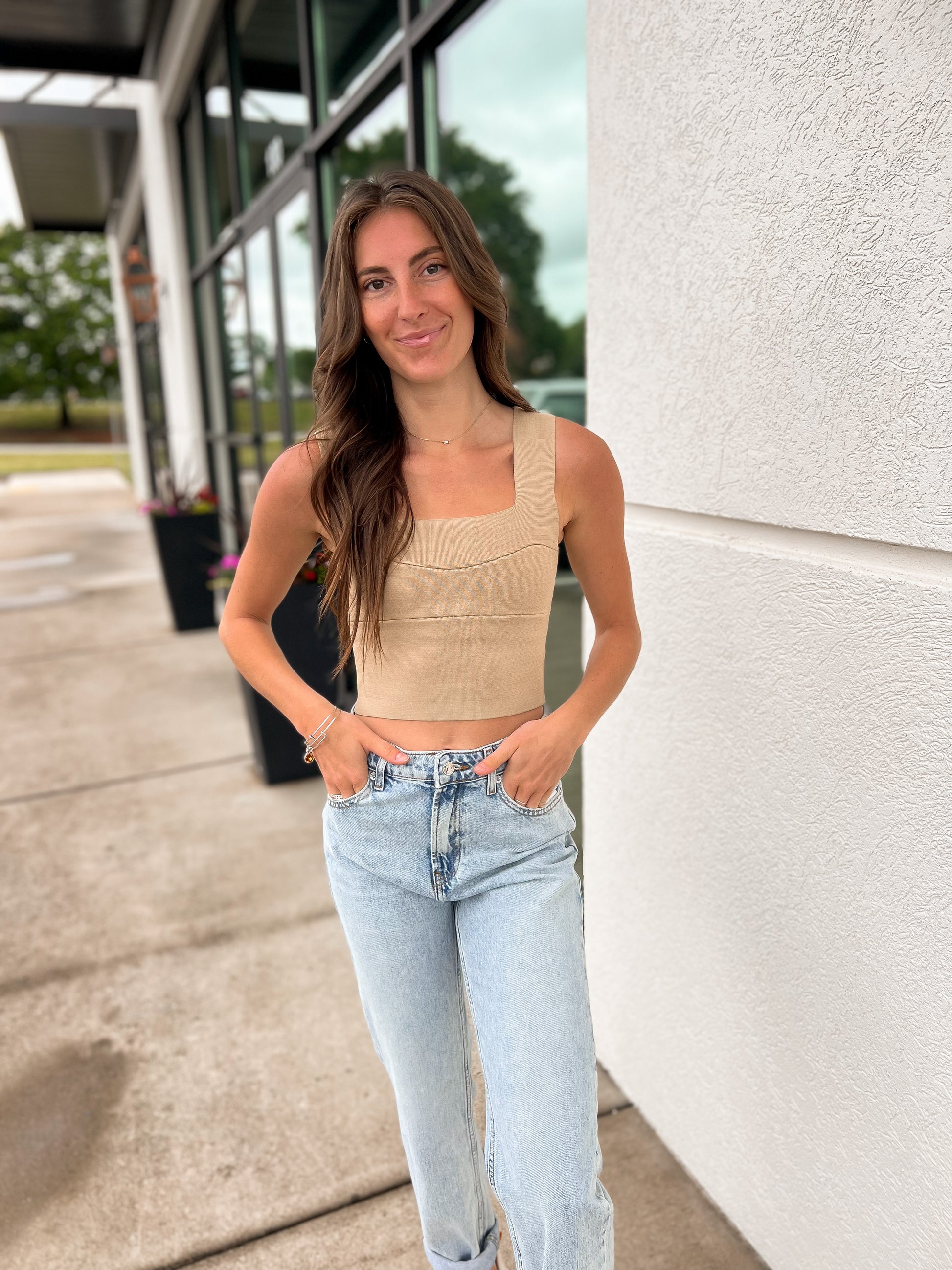 This wide strapped sweater knit top is perfect to pair with a pair of shorts or a skirt for a casual look. It features a square neck line and stretch to fit to make it super comfortable.