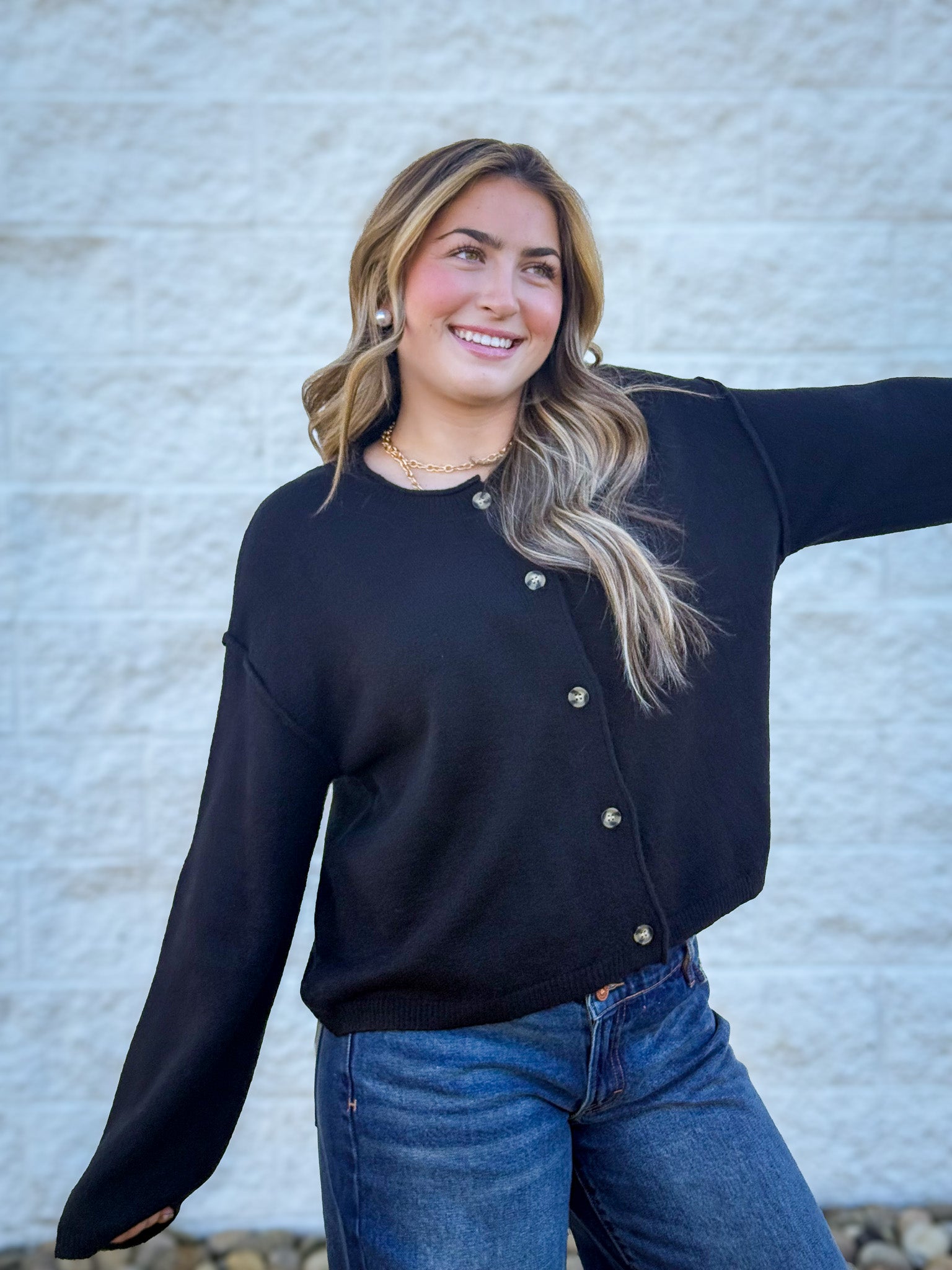 Crafted from premium knit fabric, this button-up cardigan features an exposed hem detail that adds contemporary edge to a timeless silhouette. The structured construction and refined button closure make it equally suited for layering over basics or wearing as a standalone piece. A versatile wardrobe essential that transitions seamlessly from casual to polished occasions.