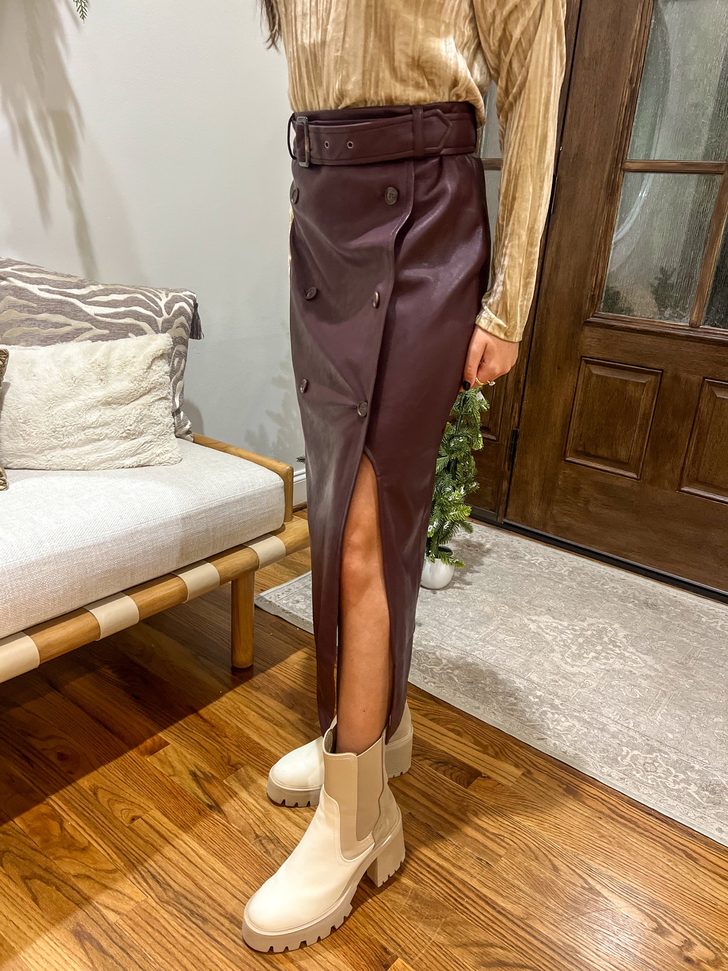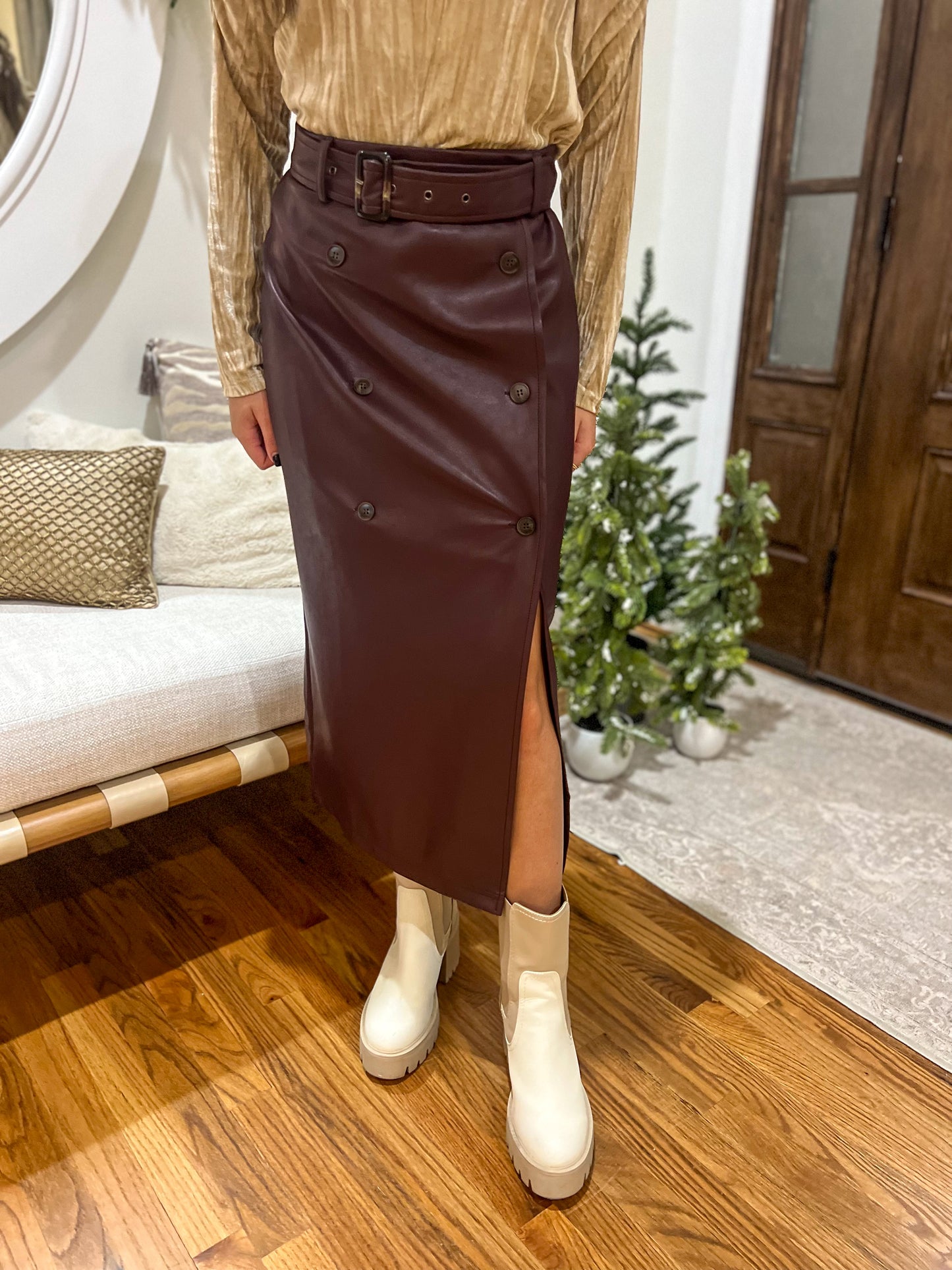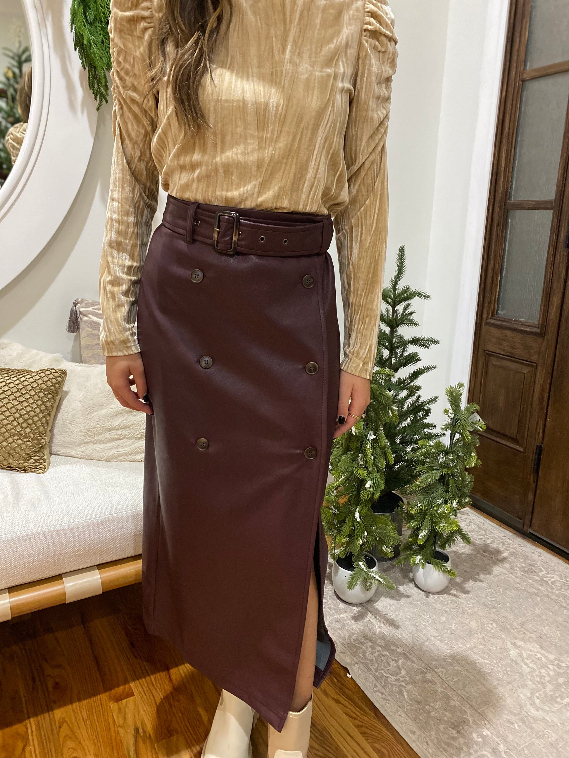 The Wine Whisper Faux Leather Midi Skirt is a chic choice for any occasion. Its deep wine color and sleek faux leather material offer sophistication. The double-breasted trench coat design features a flattering silhouette and a side slit for added movement. This skirt is perfect for all seasons. Complete the look with the included tortoise shell belt.