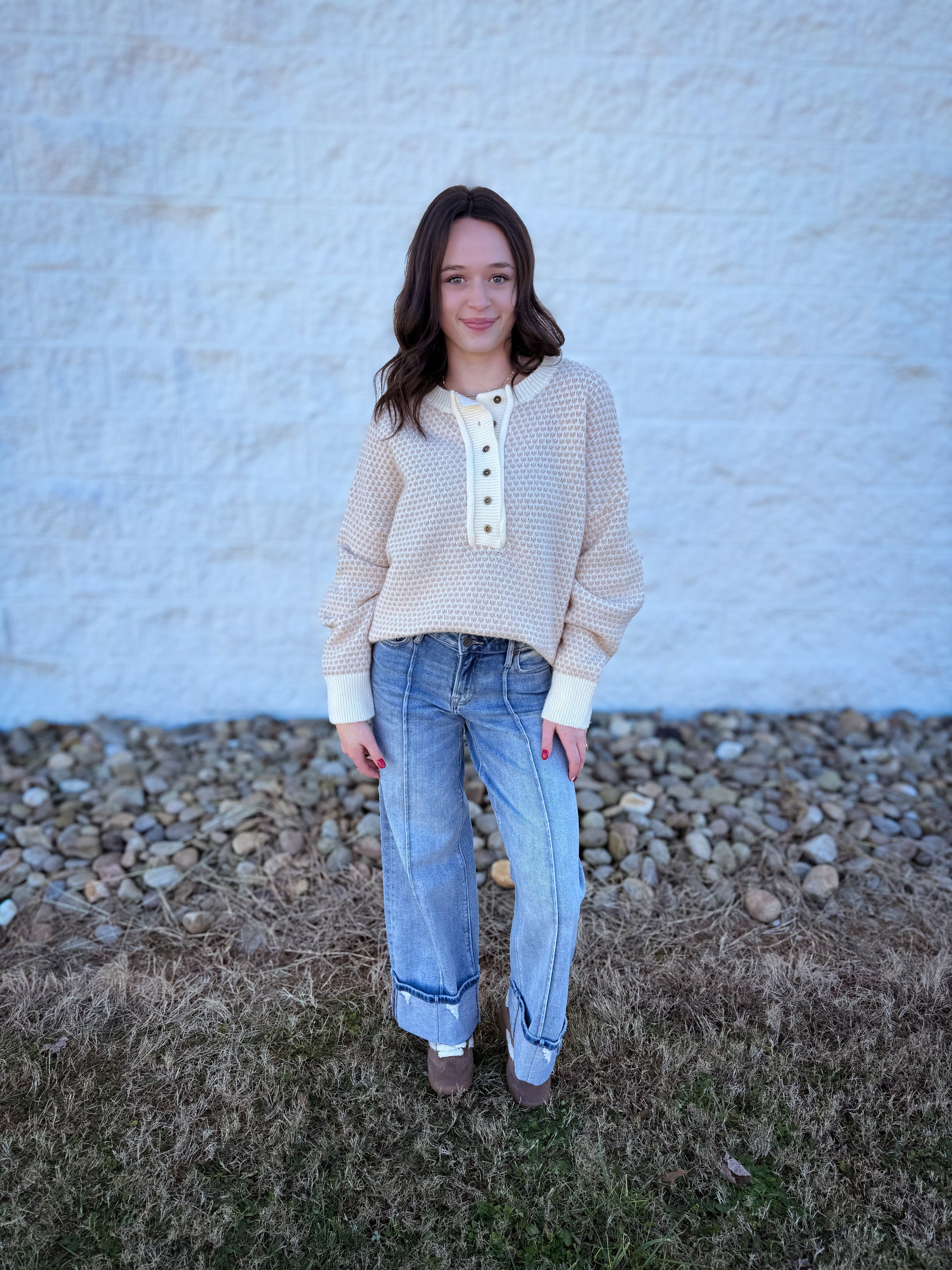 This Winter Beige Oversized Sweater features a stunning oversized fit for maximum comfort and style. The unique point knitting design adds an extra layer of sophistication, while the button down detail allows for versatile wear. The high low hem creates a flattering silhouette for any body type.